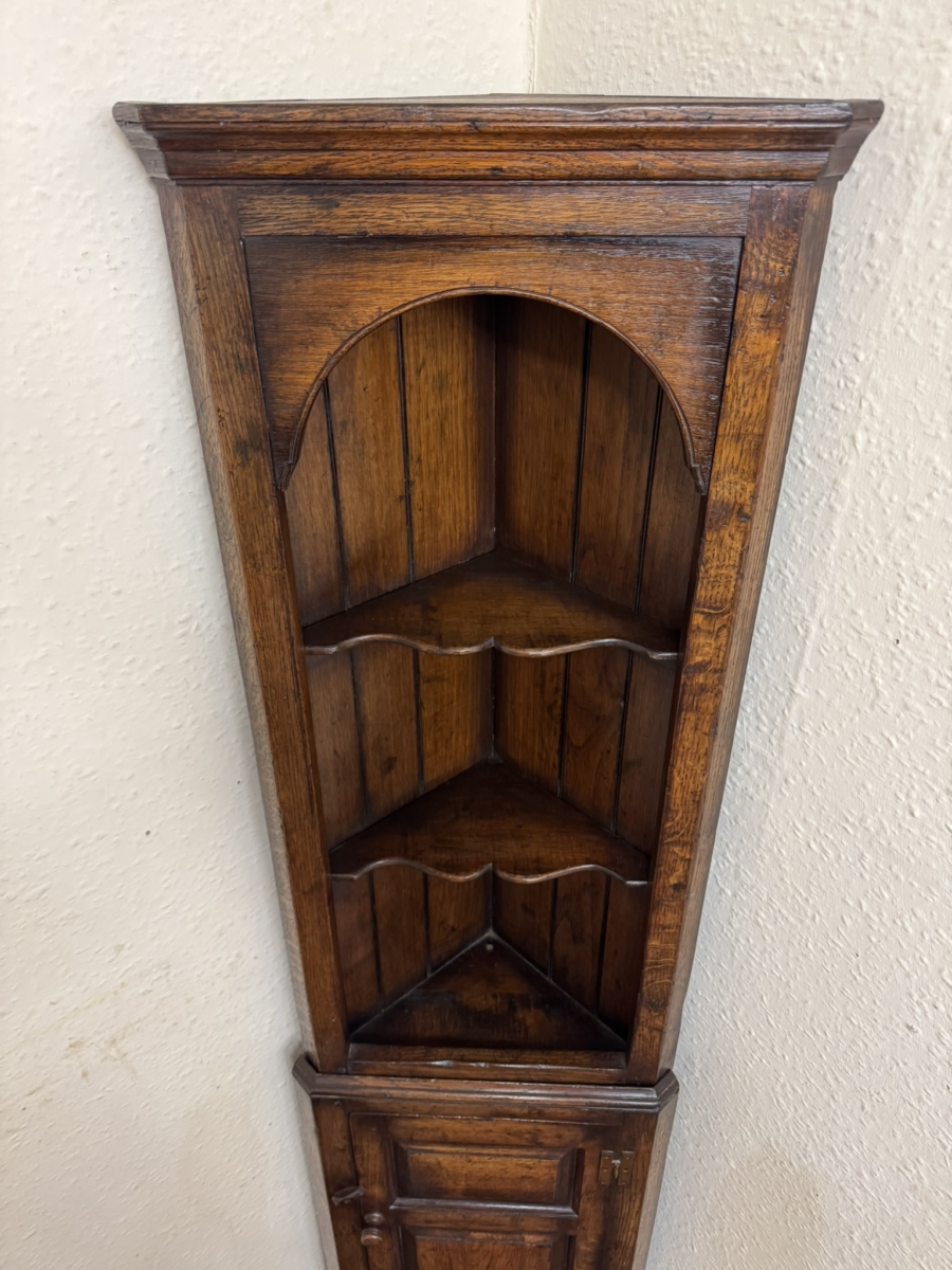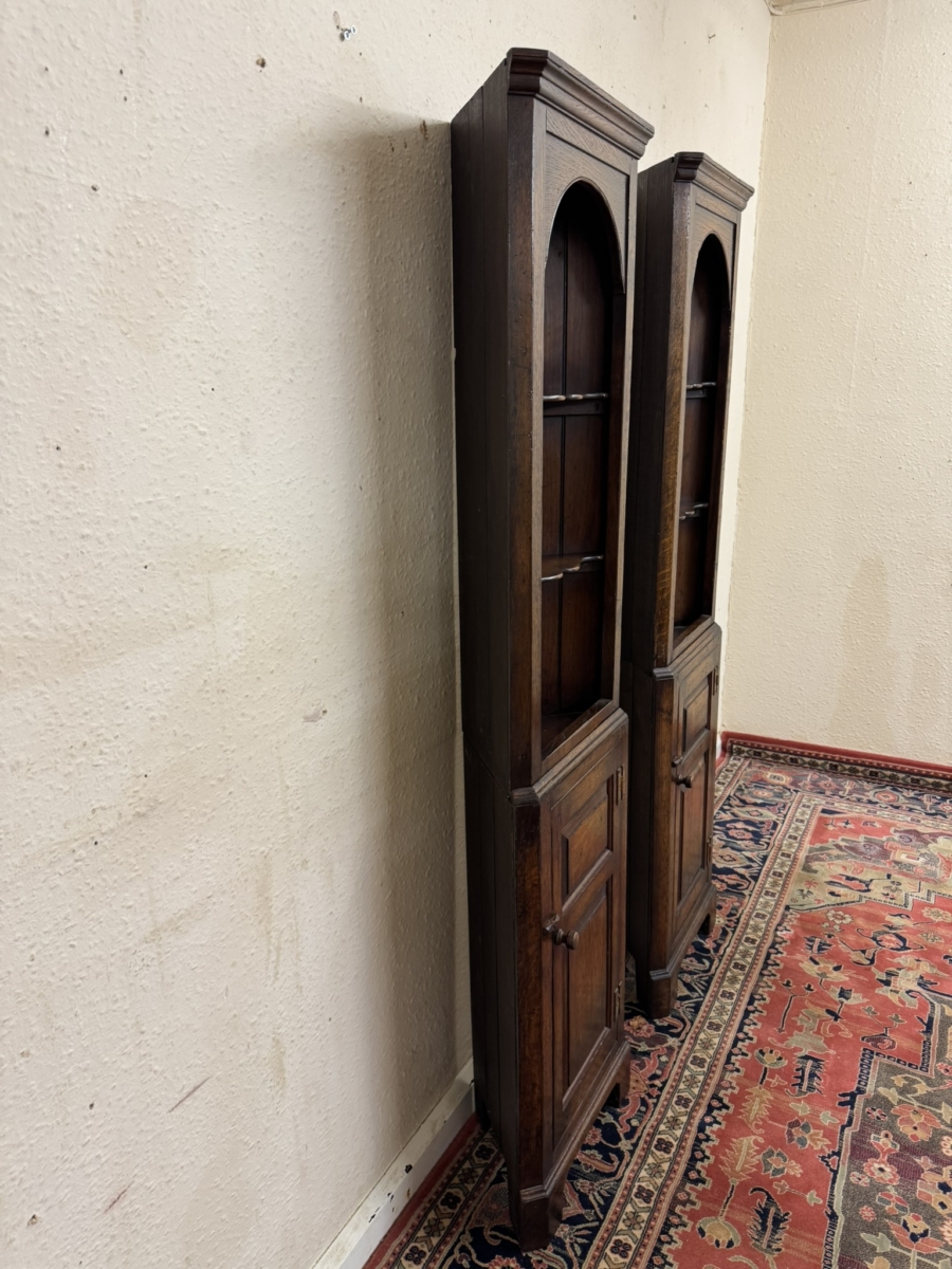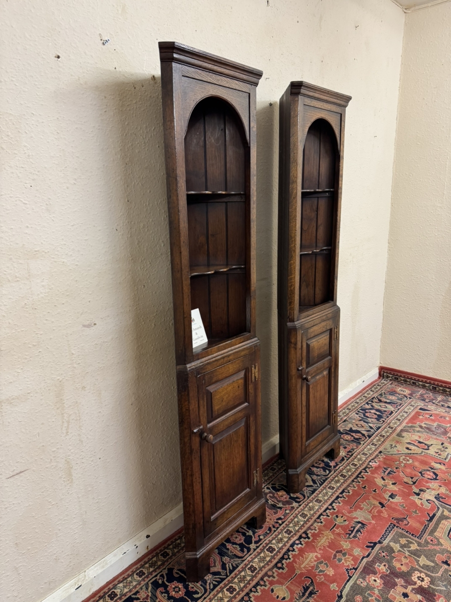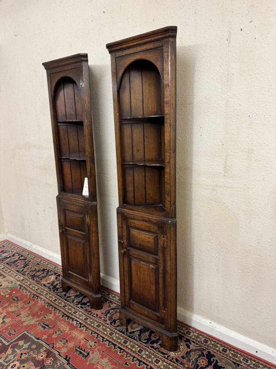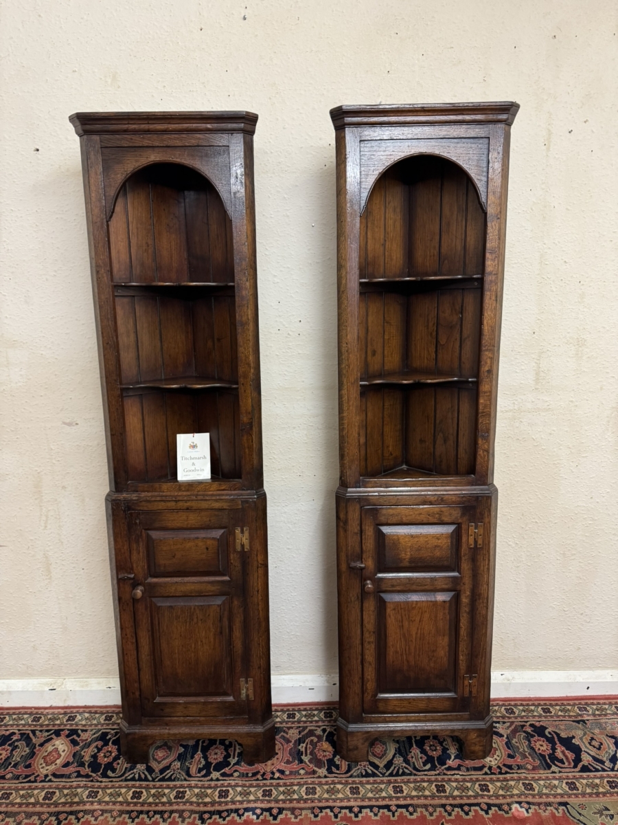 Made by the renowned Titchmarsh and Goodwin furniture makers in solid oak and in excellent condition. This neat sized pair of corner cupboards each have an open top section with boarded back arched top and two shaped shelves. Below is a fielded panelled lockable cupboard door, the door having brass H hinges, turned handle and wood locking latch. The door opens to reveal a boarded interior and removable shelf. Each cabinet stands on a bracket feet.