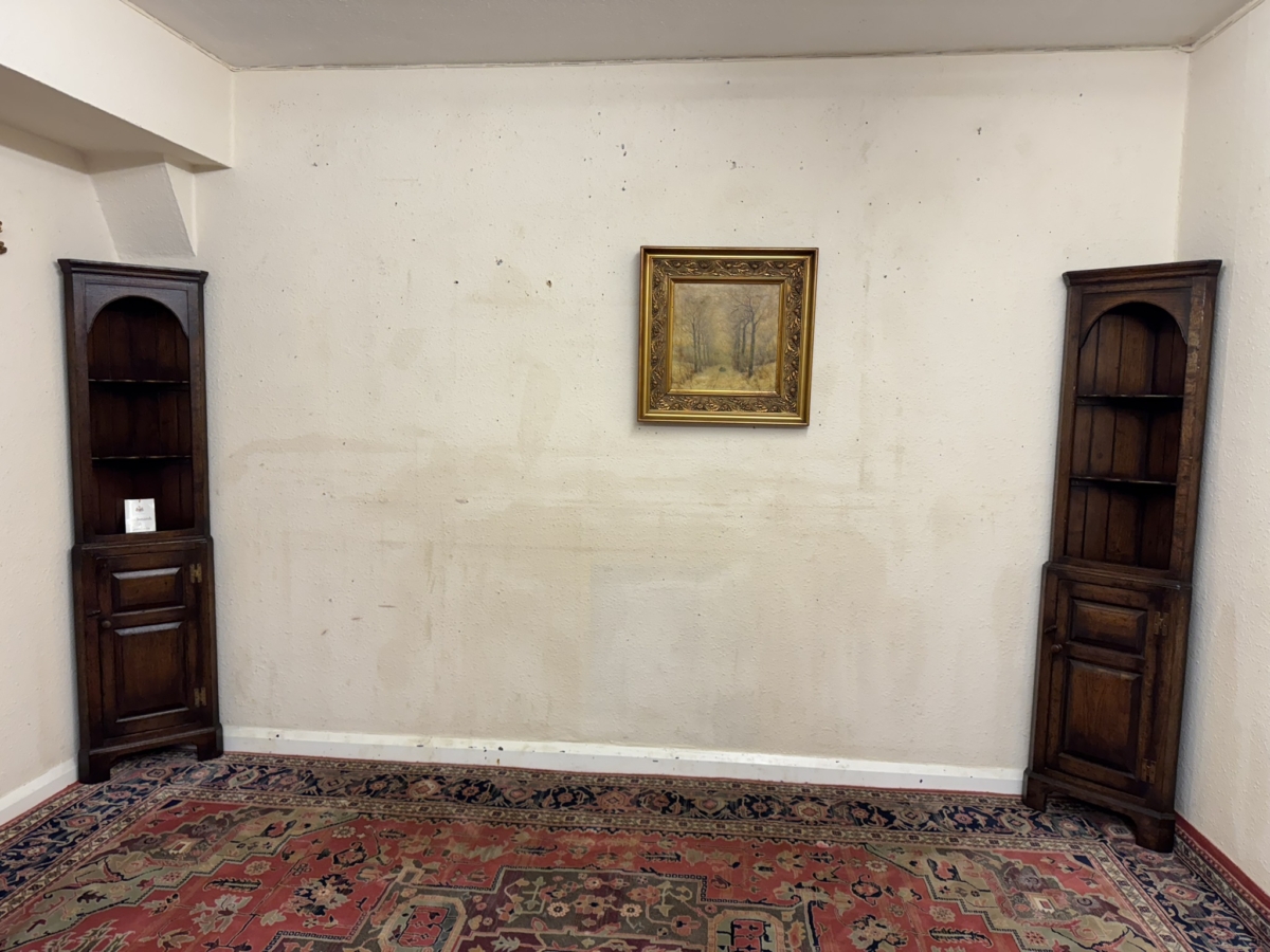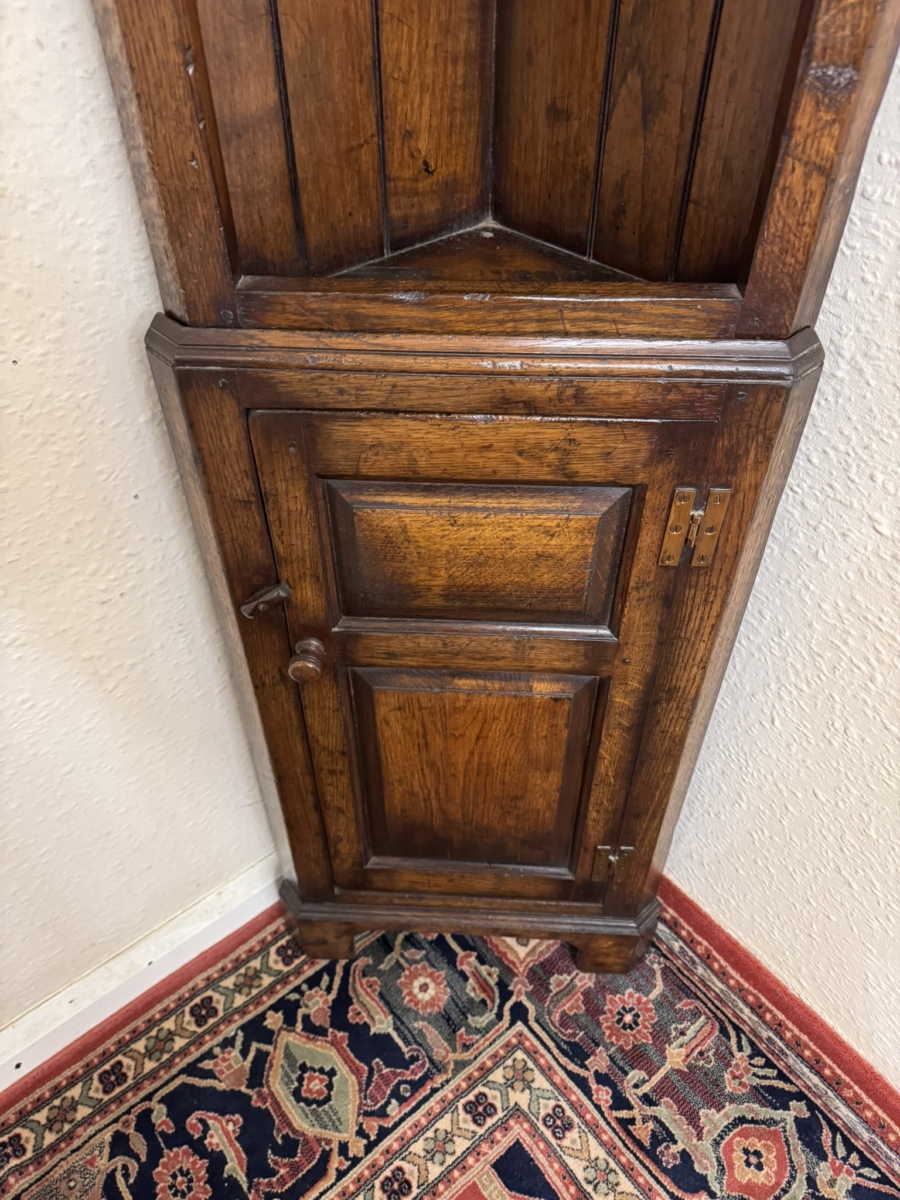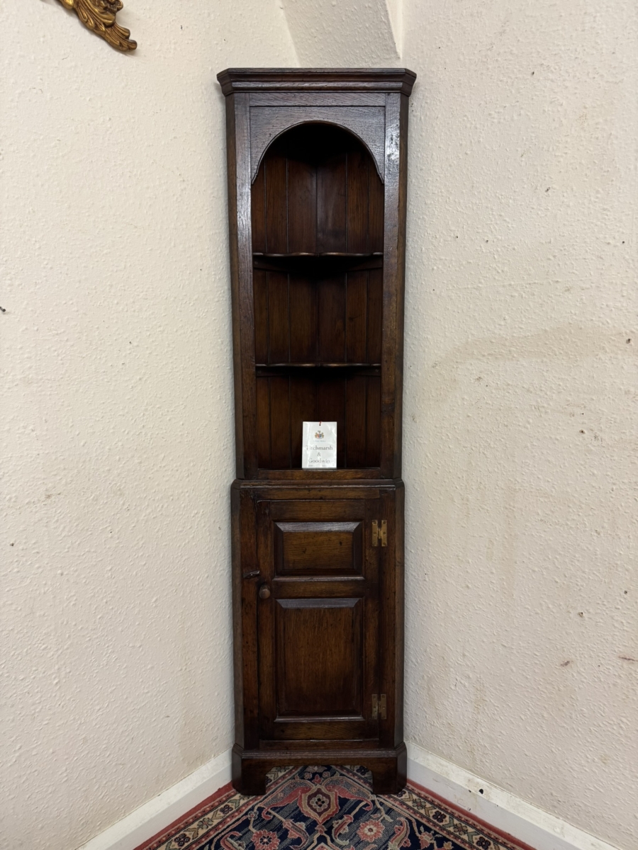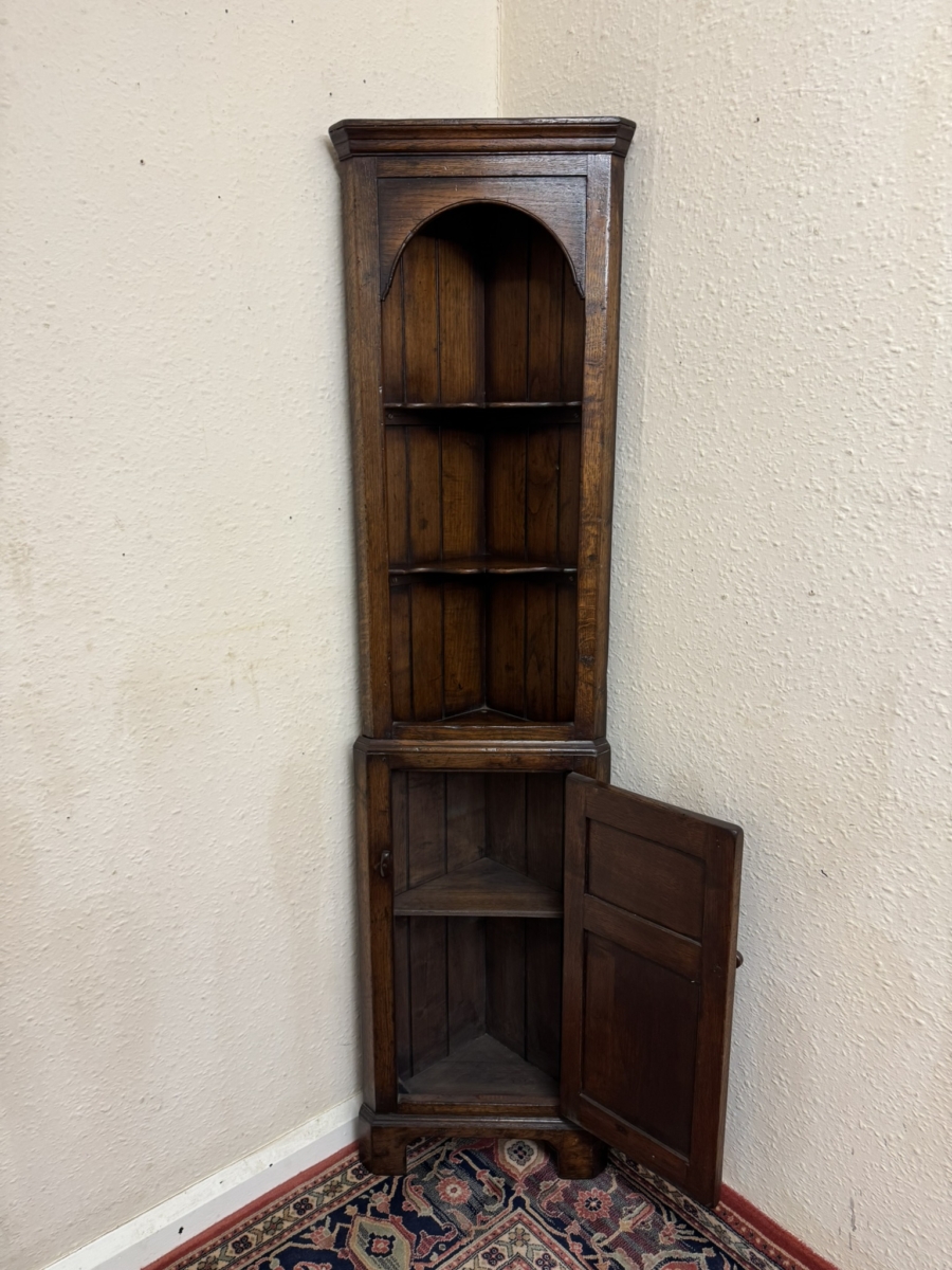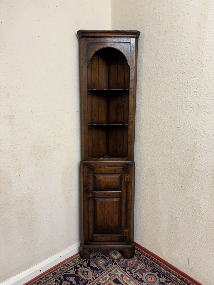 Made by the renowned Titchmarsh and Goodwin furniture makers in solid oak and in excellent condition. This neat sized pair of corner cupboards each have an open top section with boarded back arched top and two shaped shelves. Below is a fielded panelled lockable cupboard door, the door having brass H hinges, turned handle and wood locking latch. The door opens to reveal a boarded interior and removable shelf. Each cabinet stands on a bracket feet.