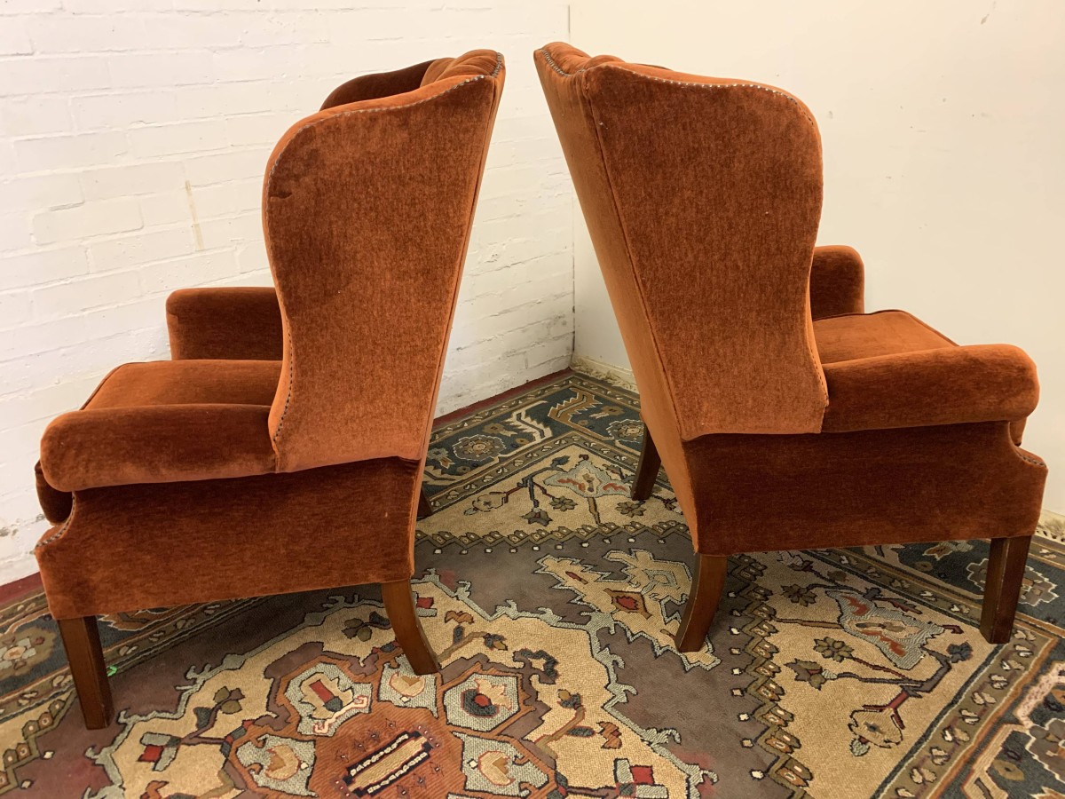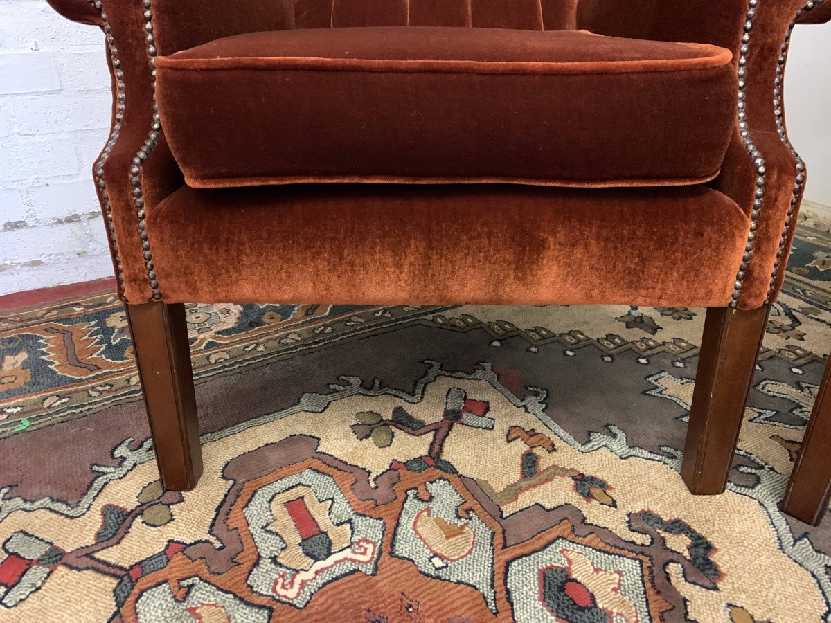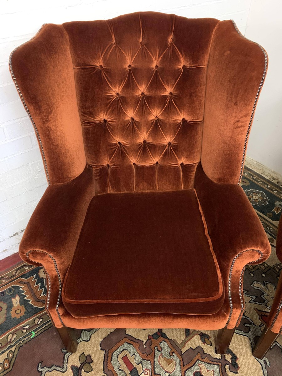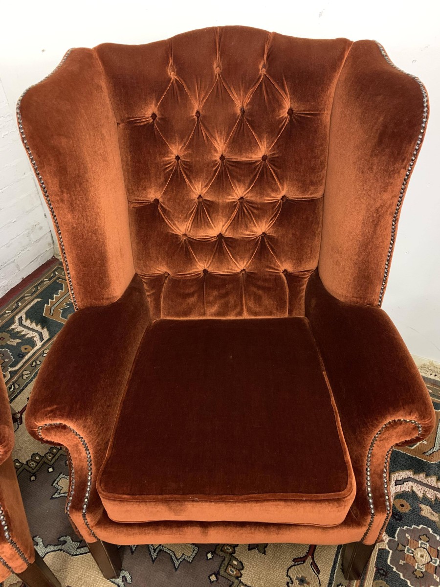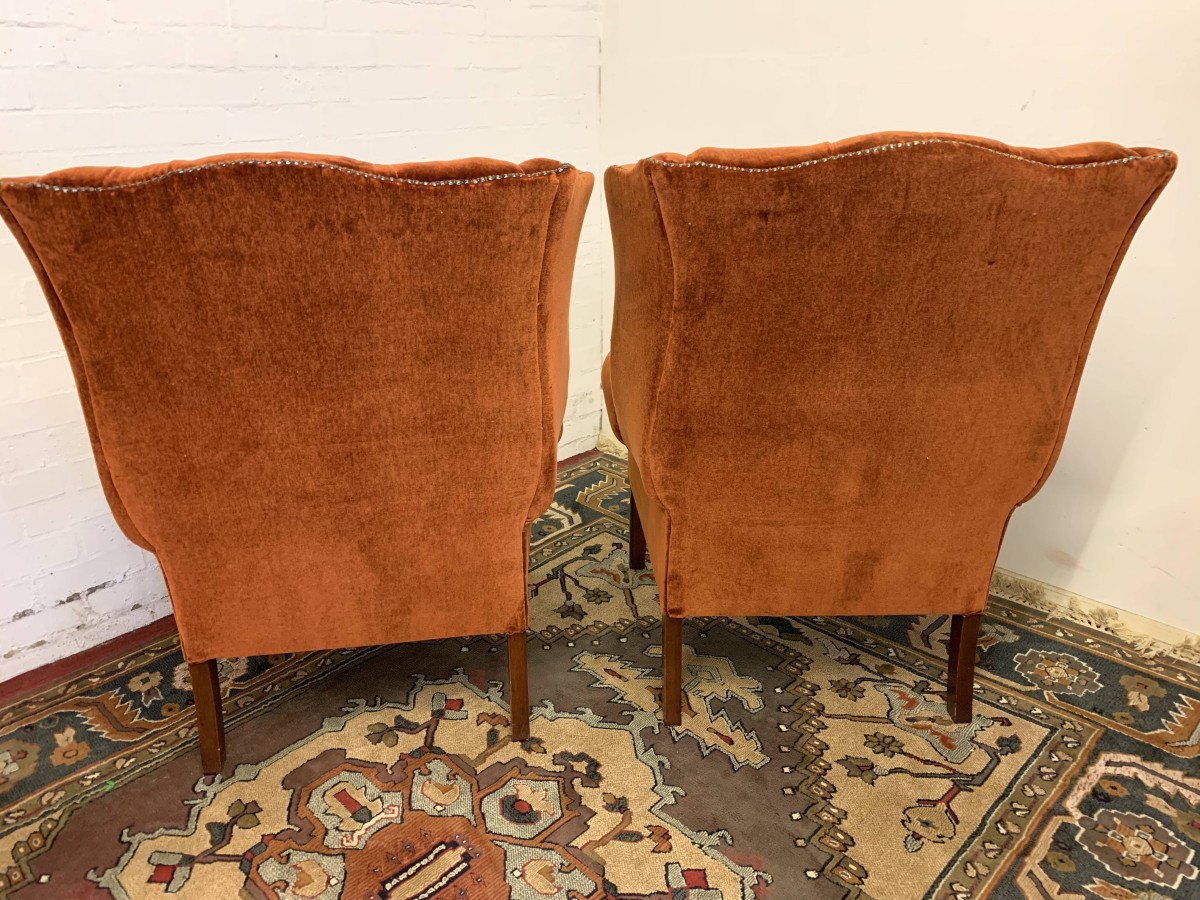 Each armchair is upholstered in a vibrant burnt orange upholstery. Each of these comfortable chairs has a buttoned cushioned back, removable seat cushion and having attractive studding throughout. Each chair stands on traditional wooden legs. Outstanding