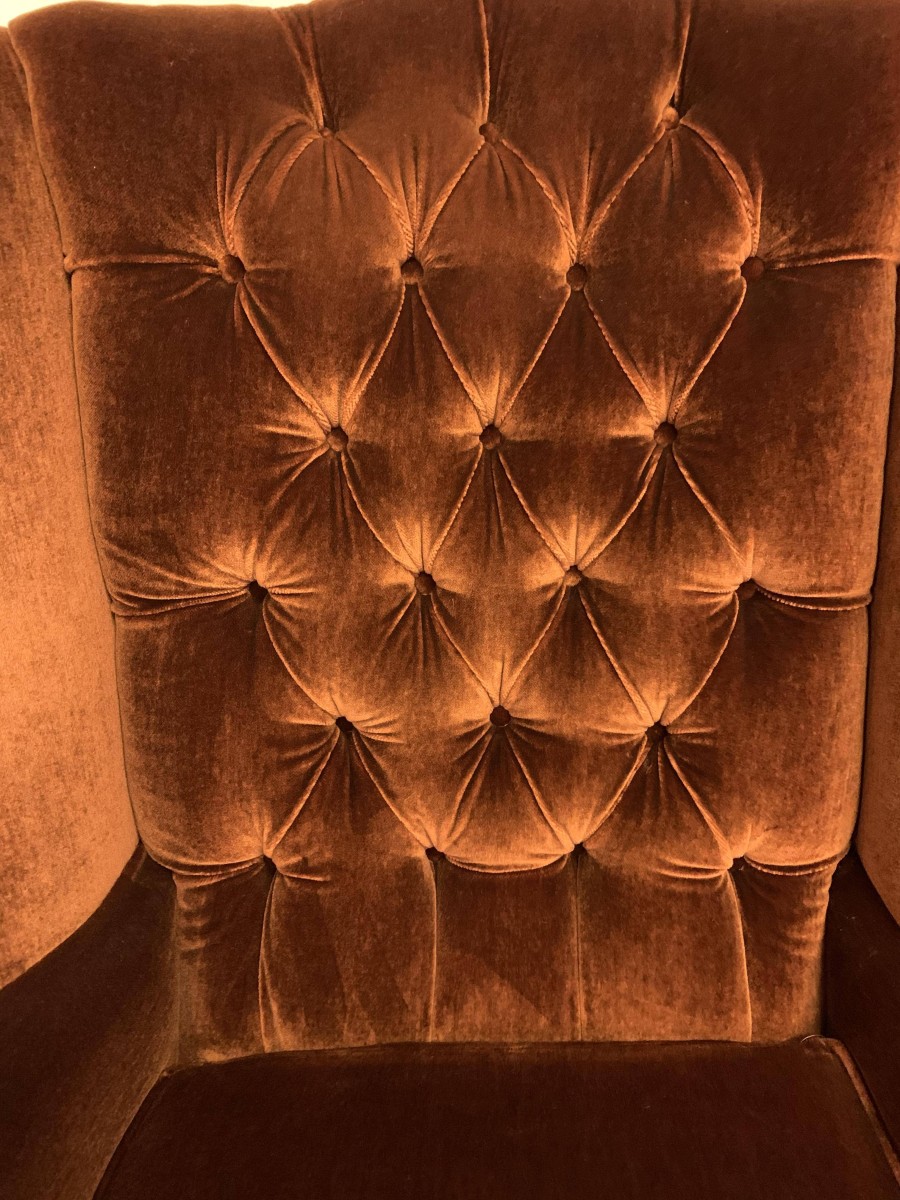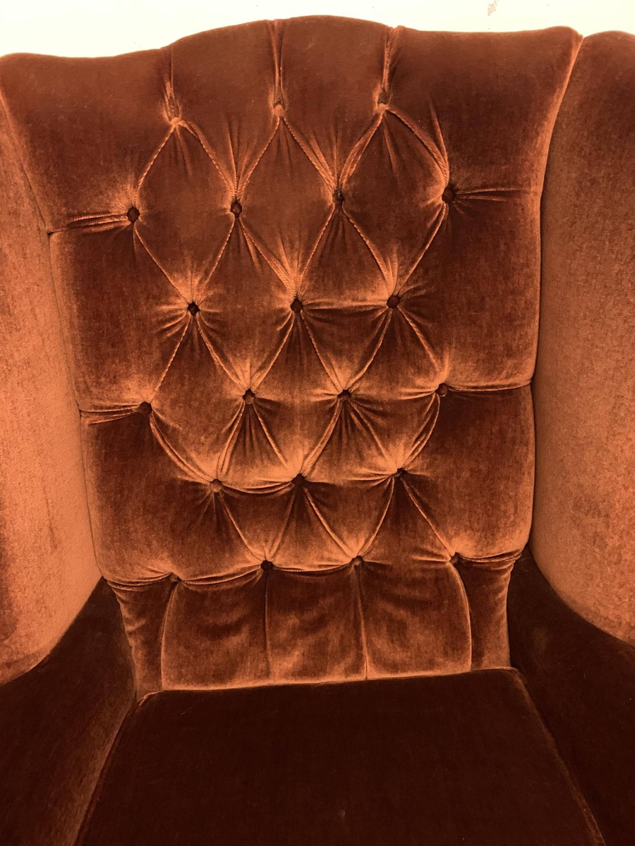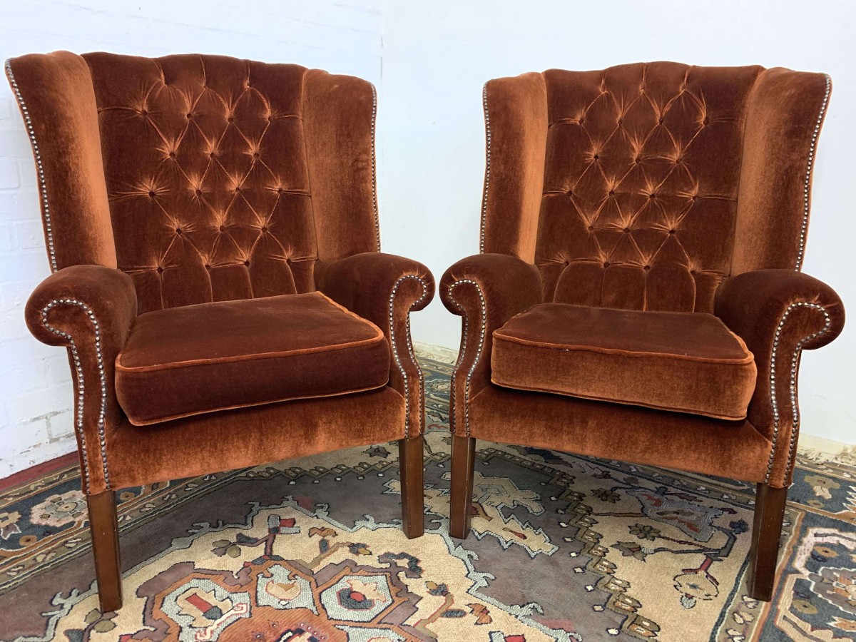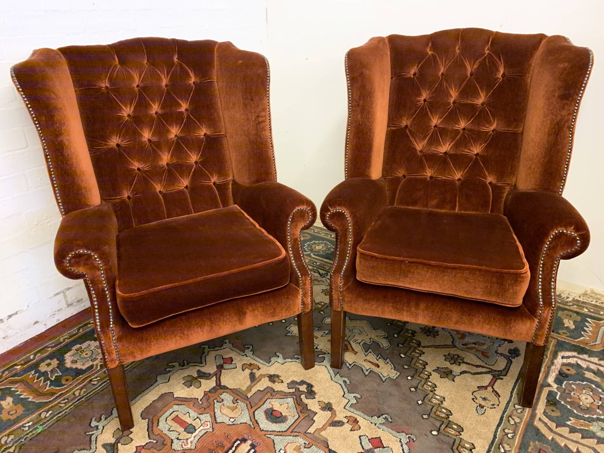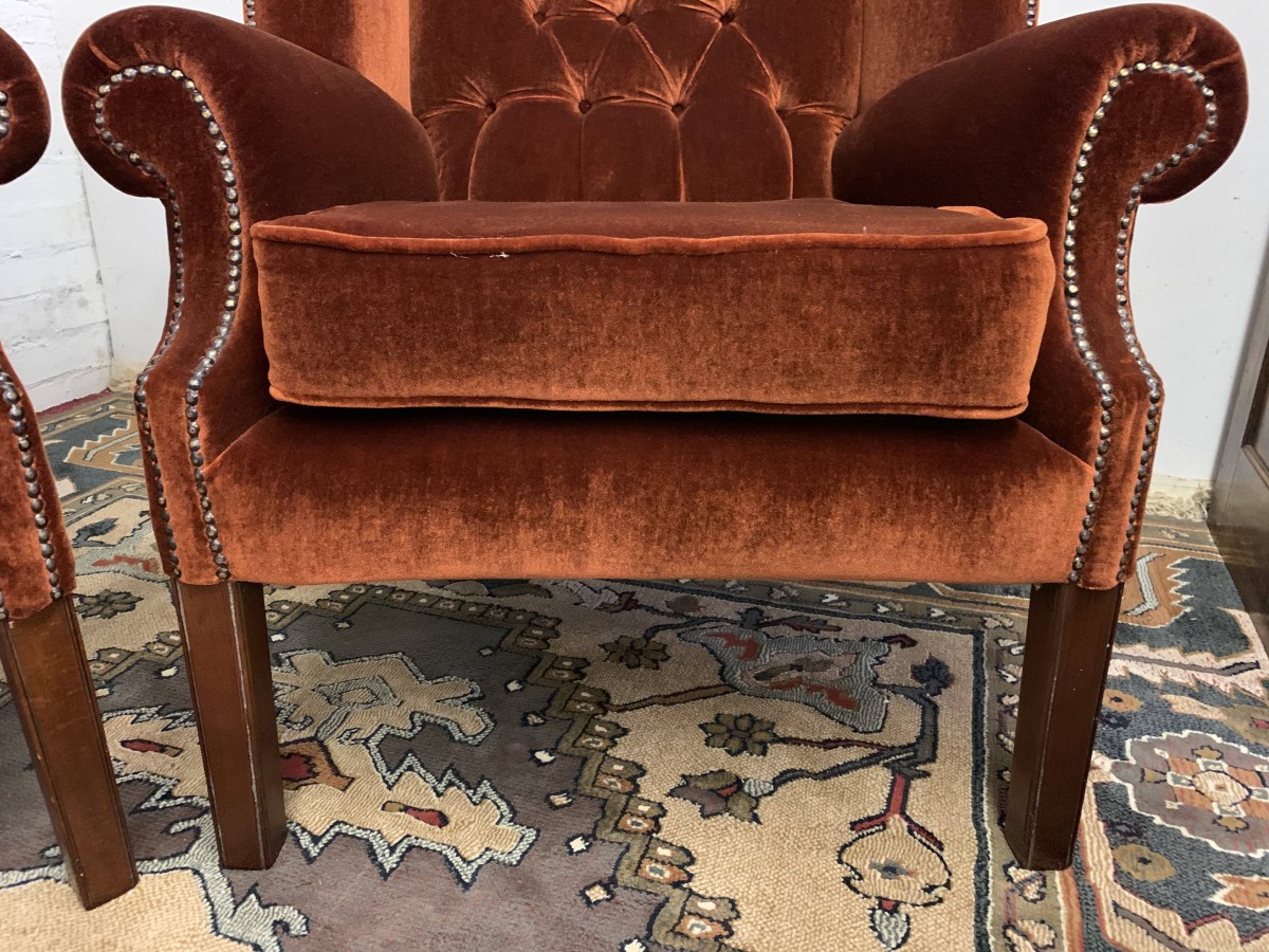 Each armchair is upholstered in a vibrant burnt orange upholstery. Each of these comfortable chairs has a buttoned cushioned back, removable seat cushion and having attractive studding throughout. Each chair stands on traditional wooden legs. Outstanding