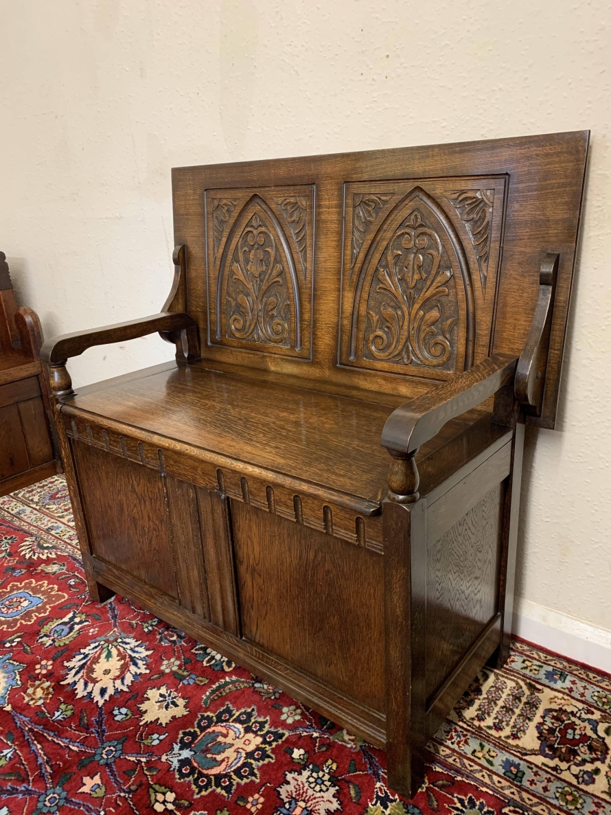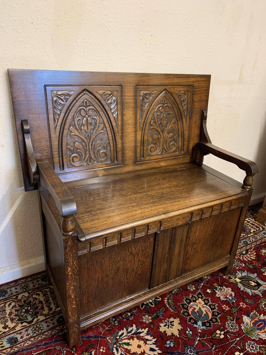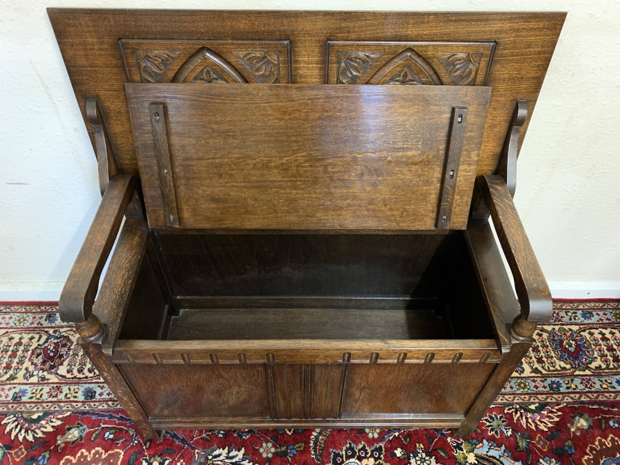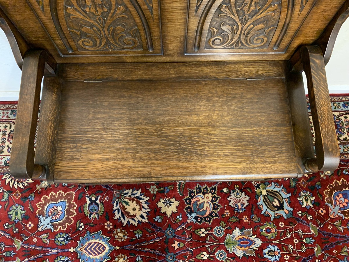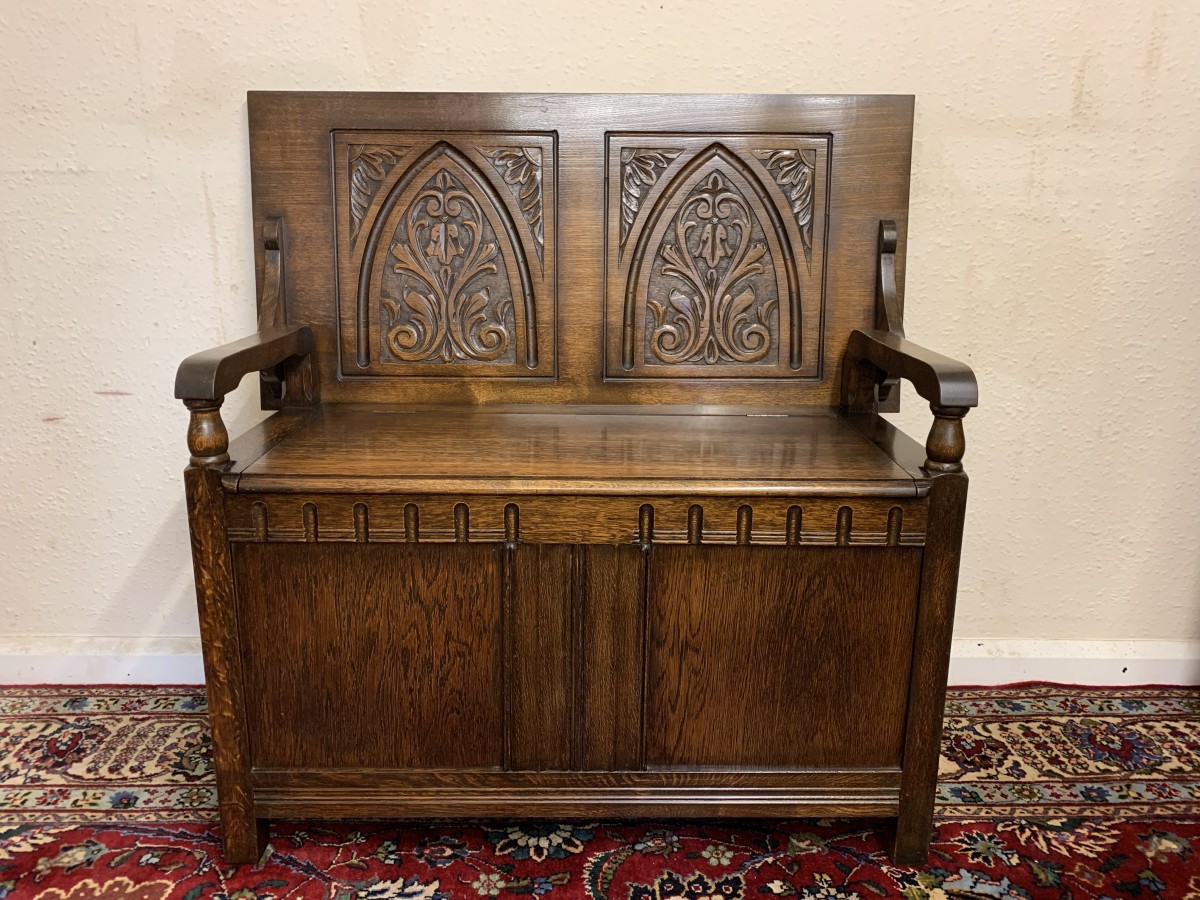 Made in glorious solid oak this Monks Bench is in excellent condition. The retractable top opens to reveal a carved back rest. The lift up seat opens to reveal ample storage. Pair of turned arms, recessed panelled front and sides this beautiful example of English furniture stands on four block feet.