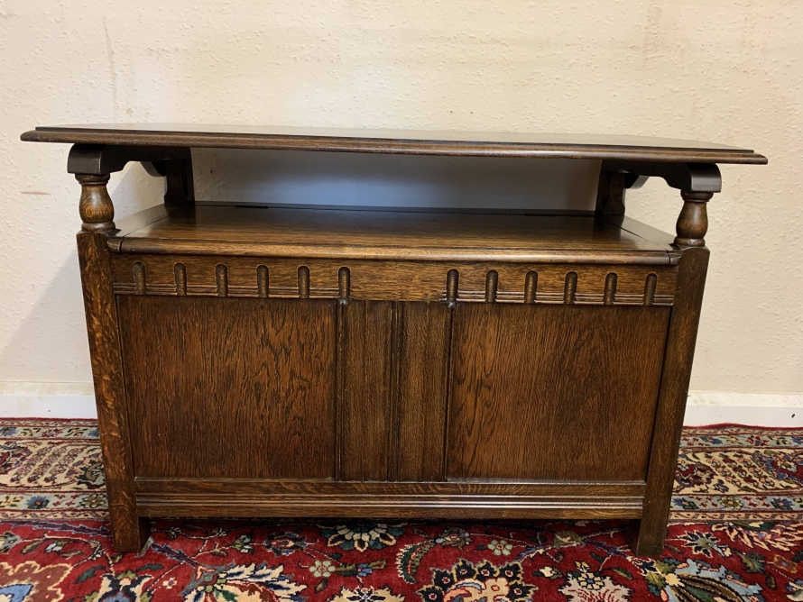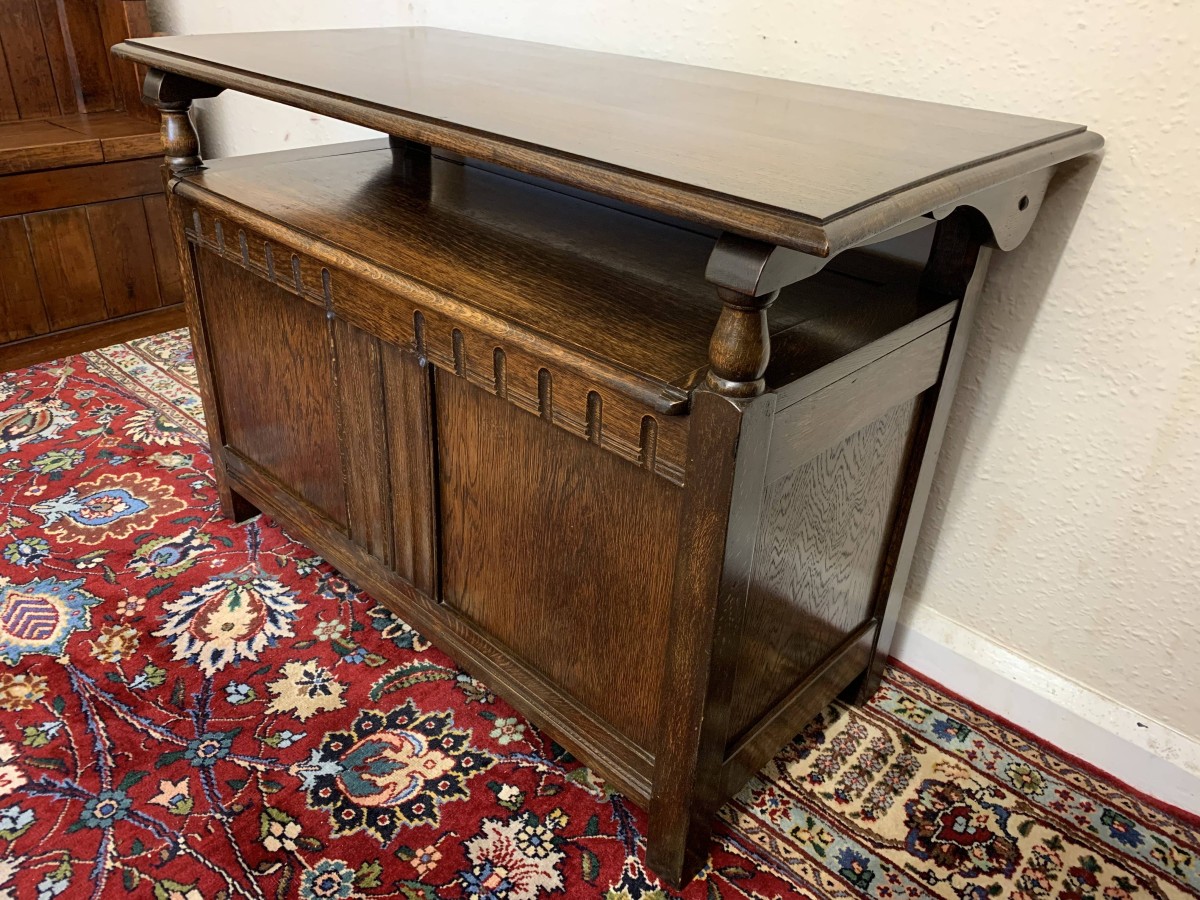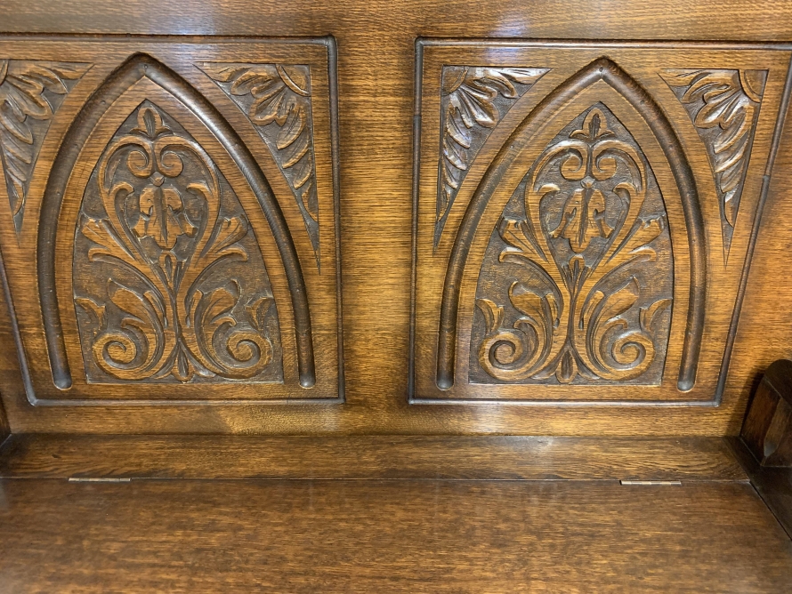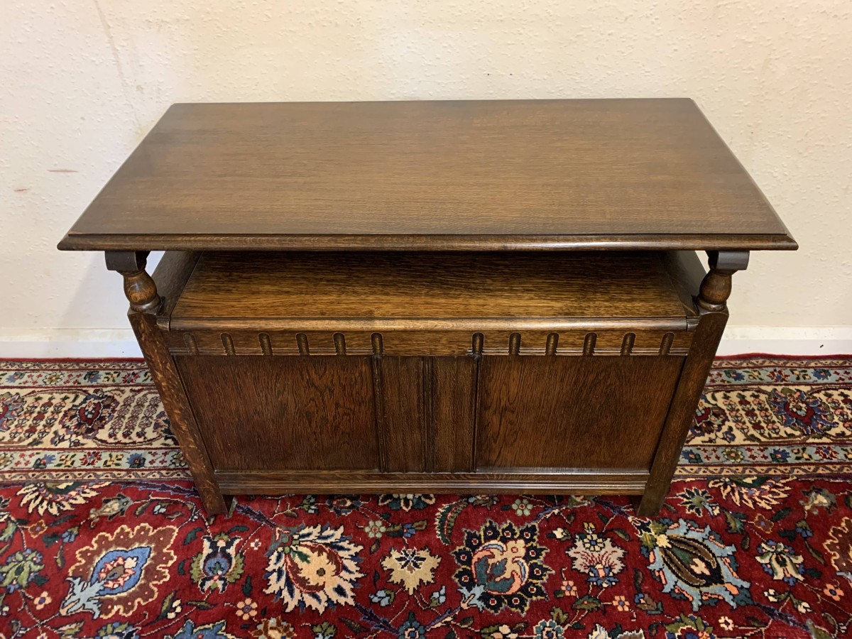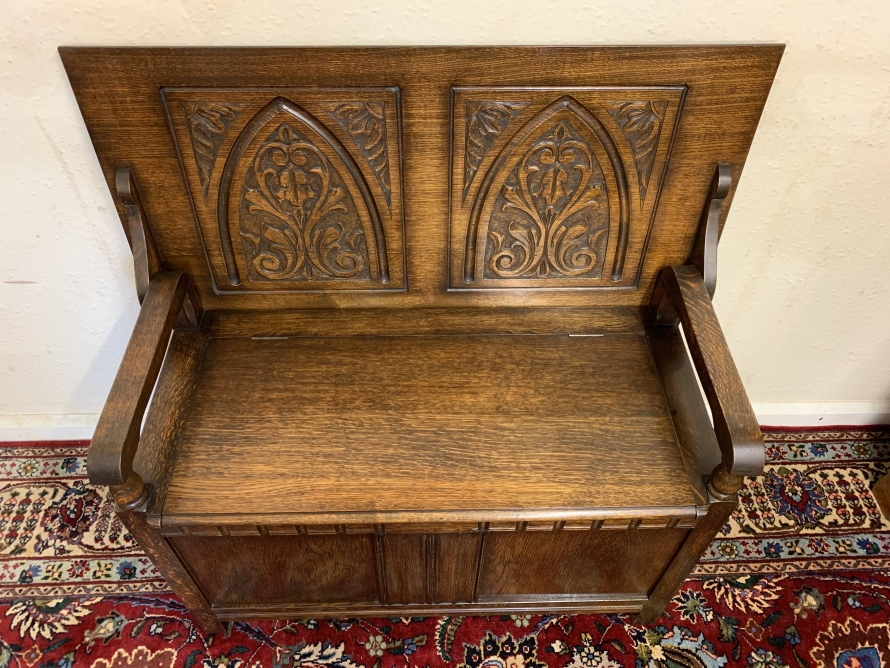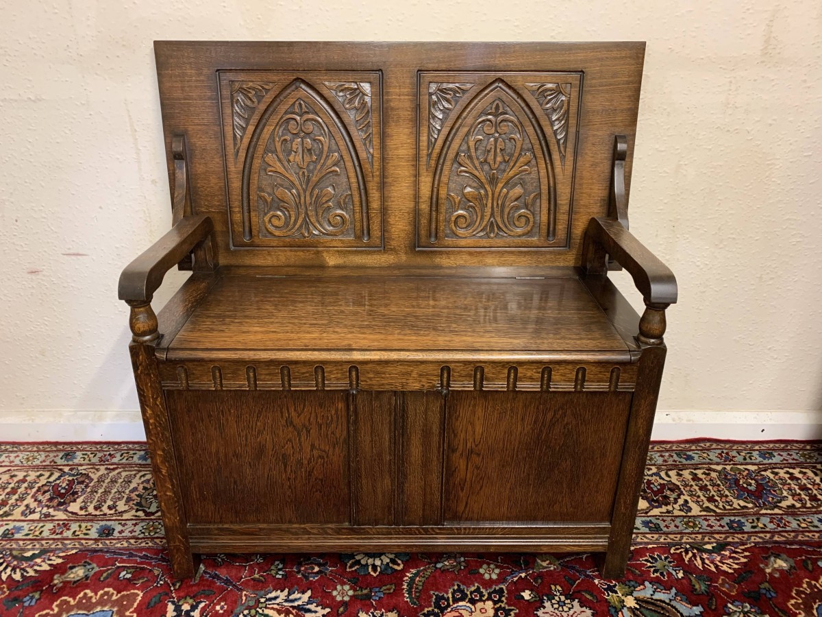 Made in glorious solid oak this Monks Bench is in excellent condition. The retractable top opens to reveal a carved back rest. The lift up seat opens to reveal ample storage. Pair of turned arms, recessed panelled front and sides this beautiful example of English furniture stands on four block feet.