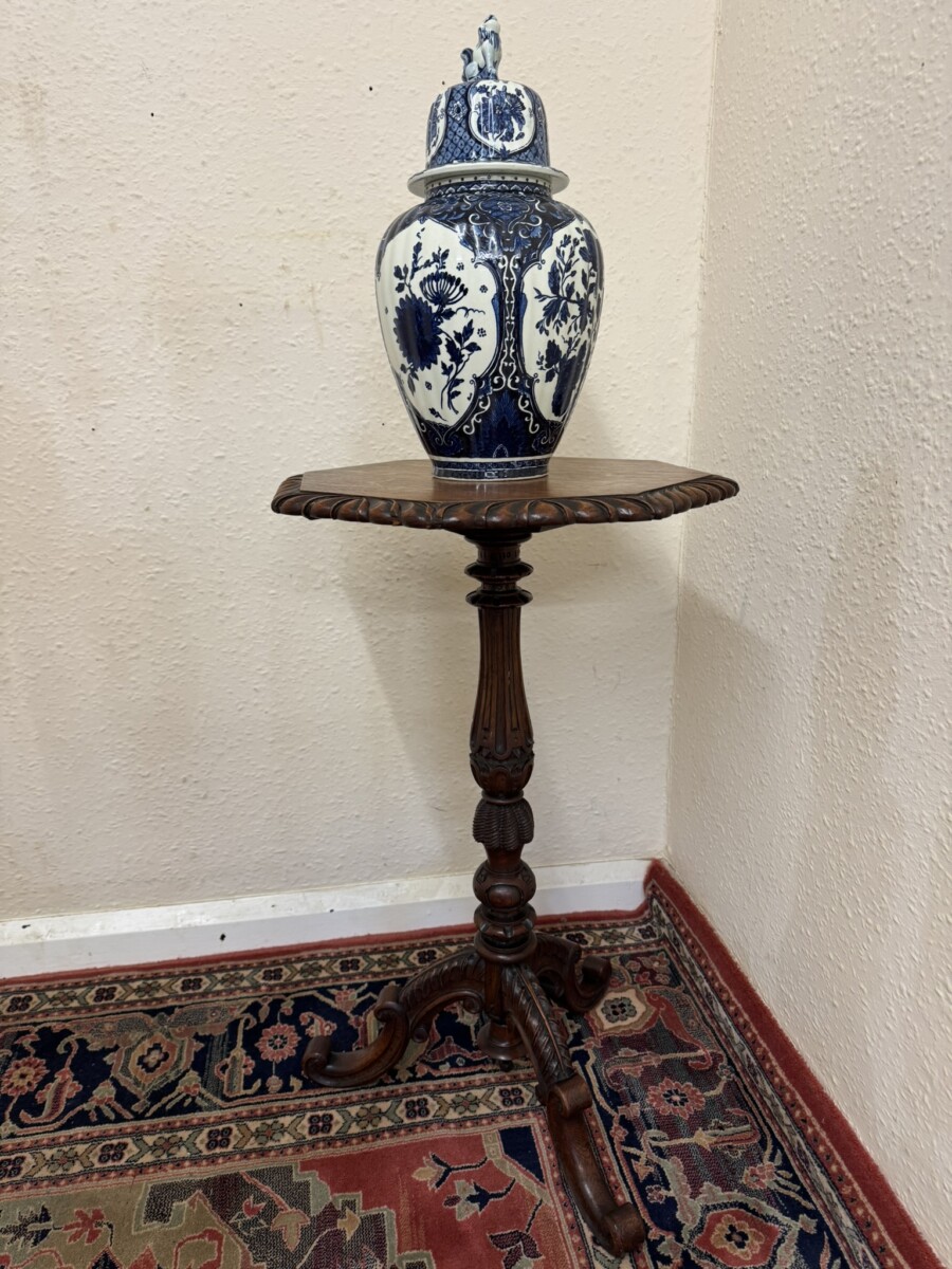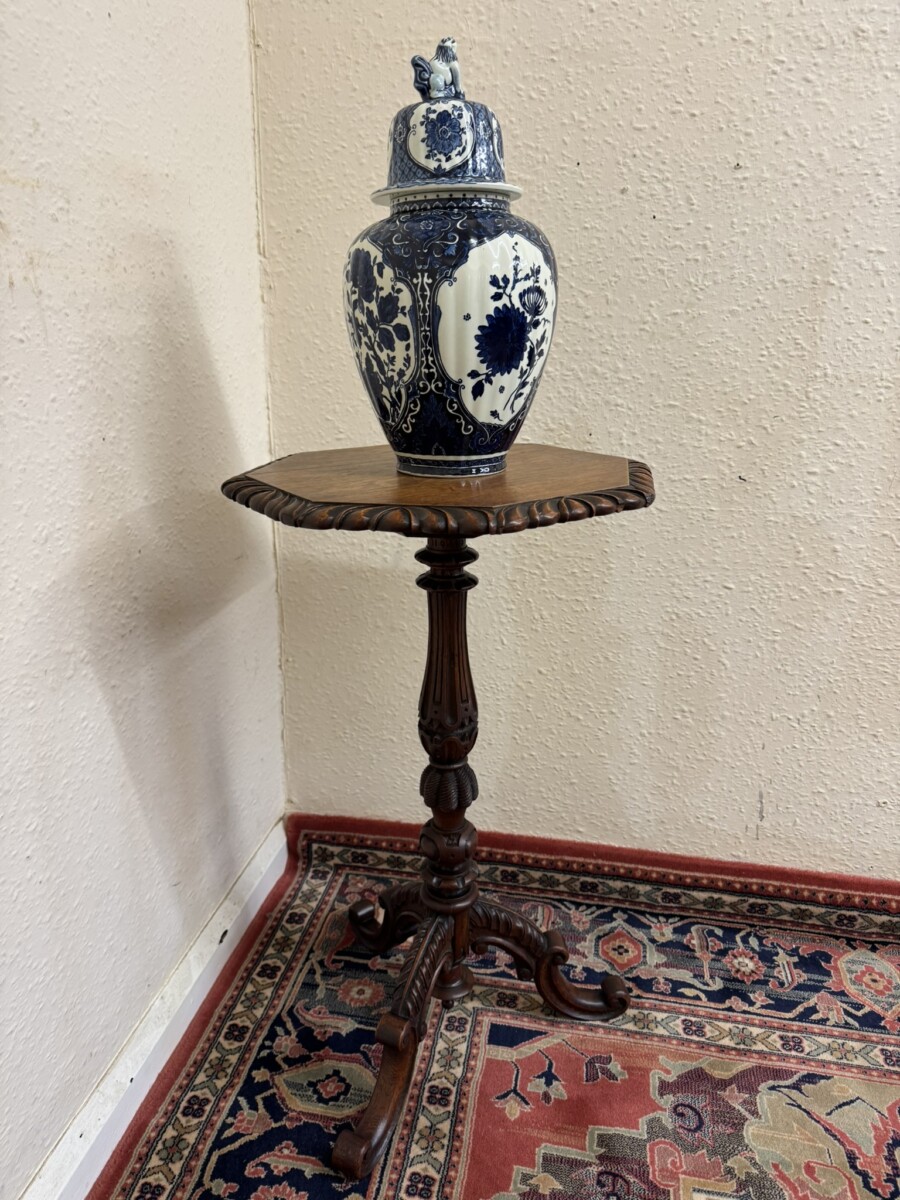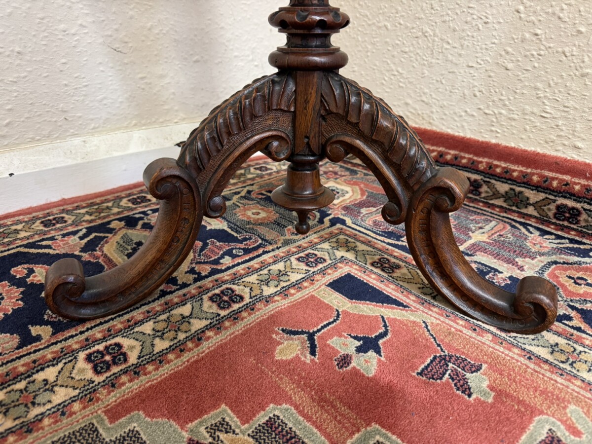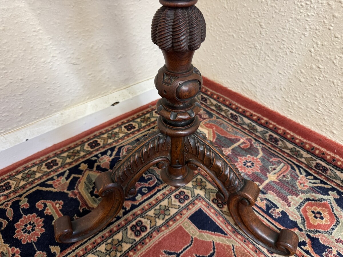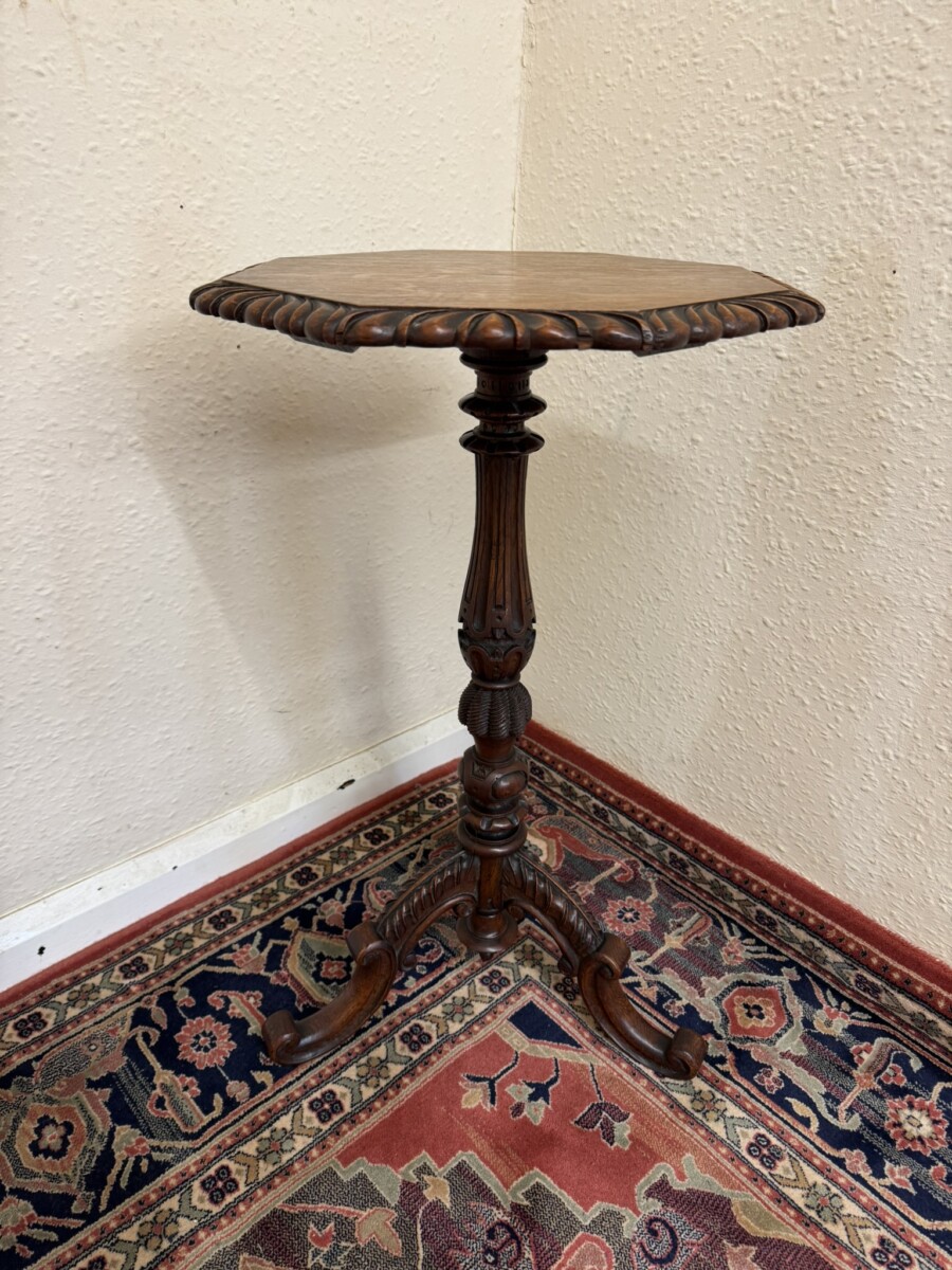 This fine table dates circa 1900 and is made in glorious solid oak. The octagonal top has a carved scalloped edge. Carved turned tripod base with curved feet.