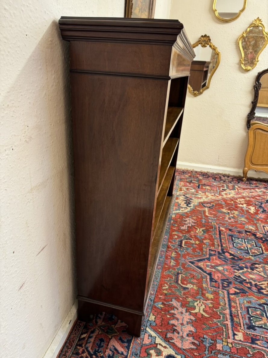 This fabulous bookcase dates circa 1910. The oversailing top sits above an open bookcase of three adjustable and removable shelves. There is beautiful inlay to the top sides and four bracket feet.