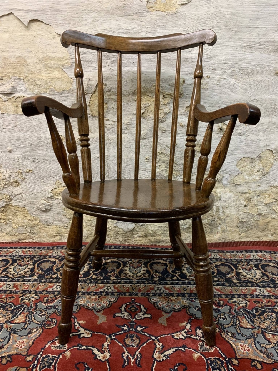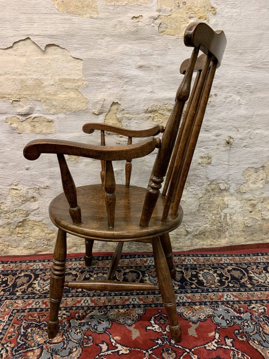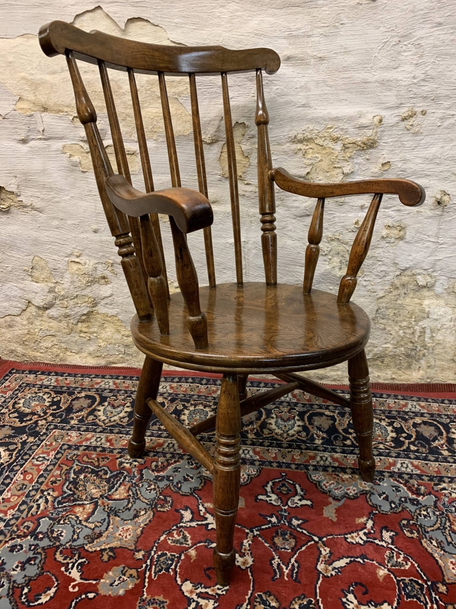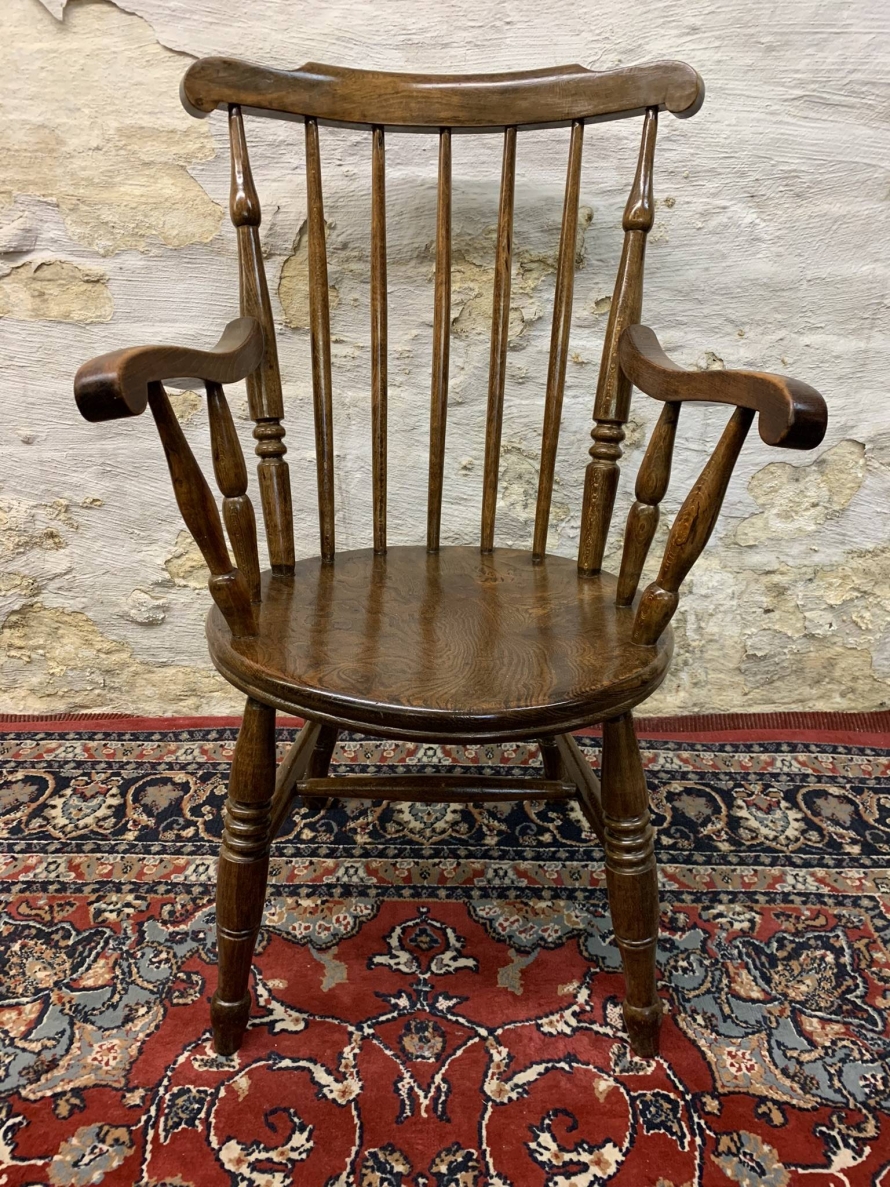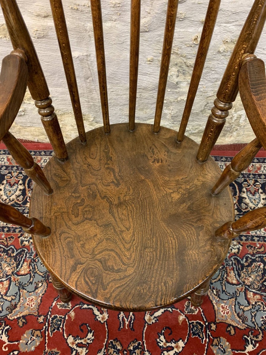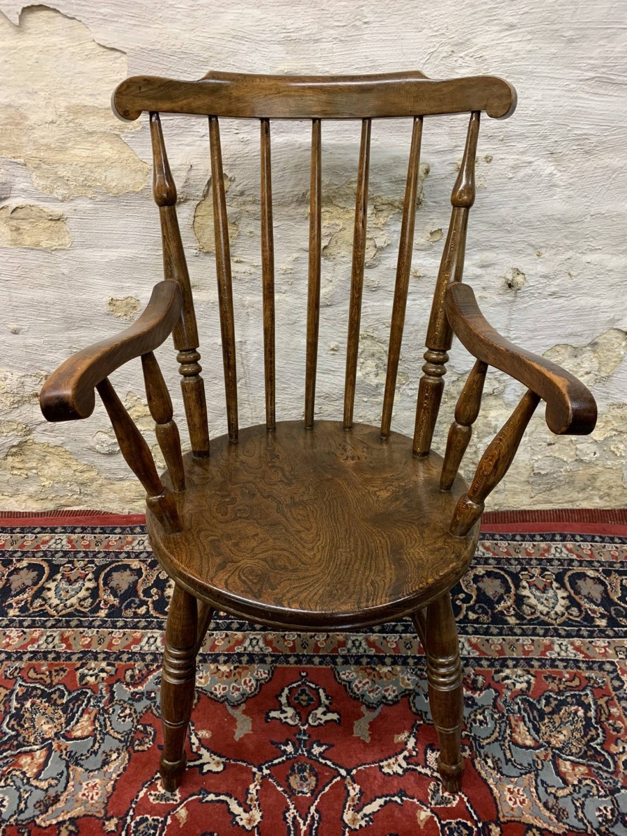 This beautiful antique elm seated chair has a spindle back, shaped arms, penny elm seat and four turned legs with stretcher supports.