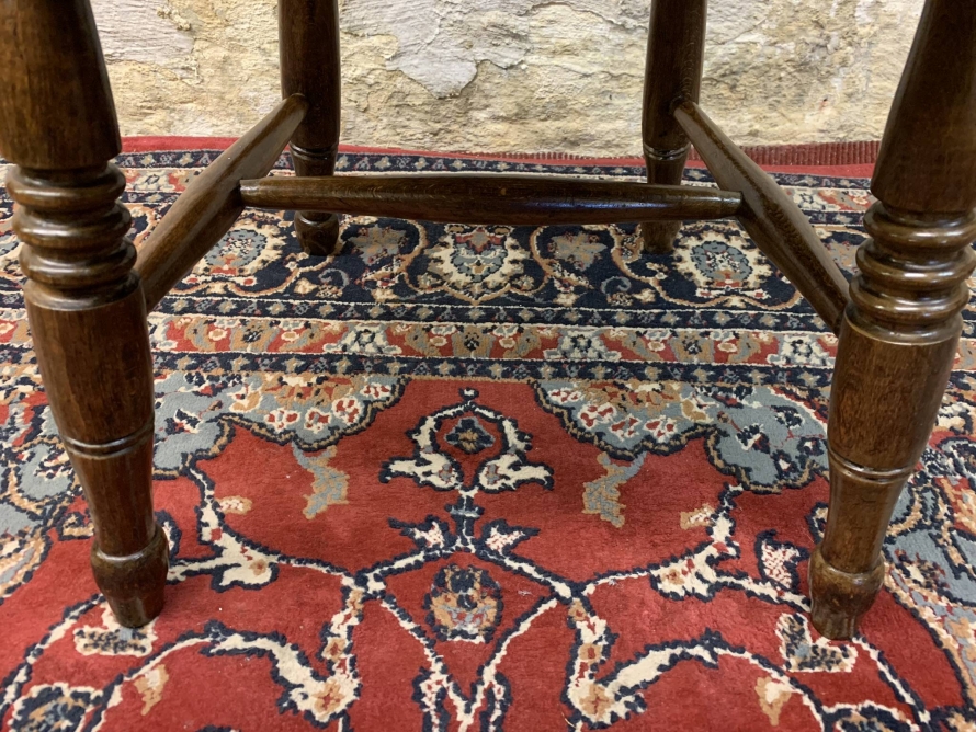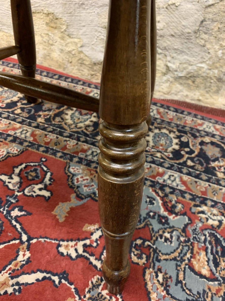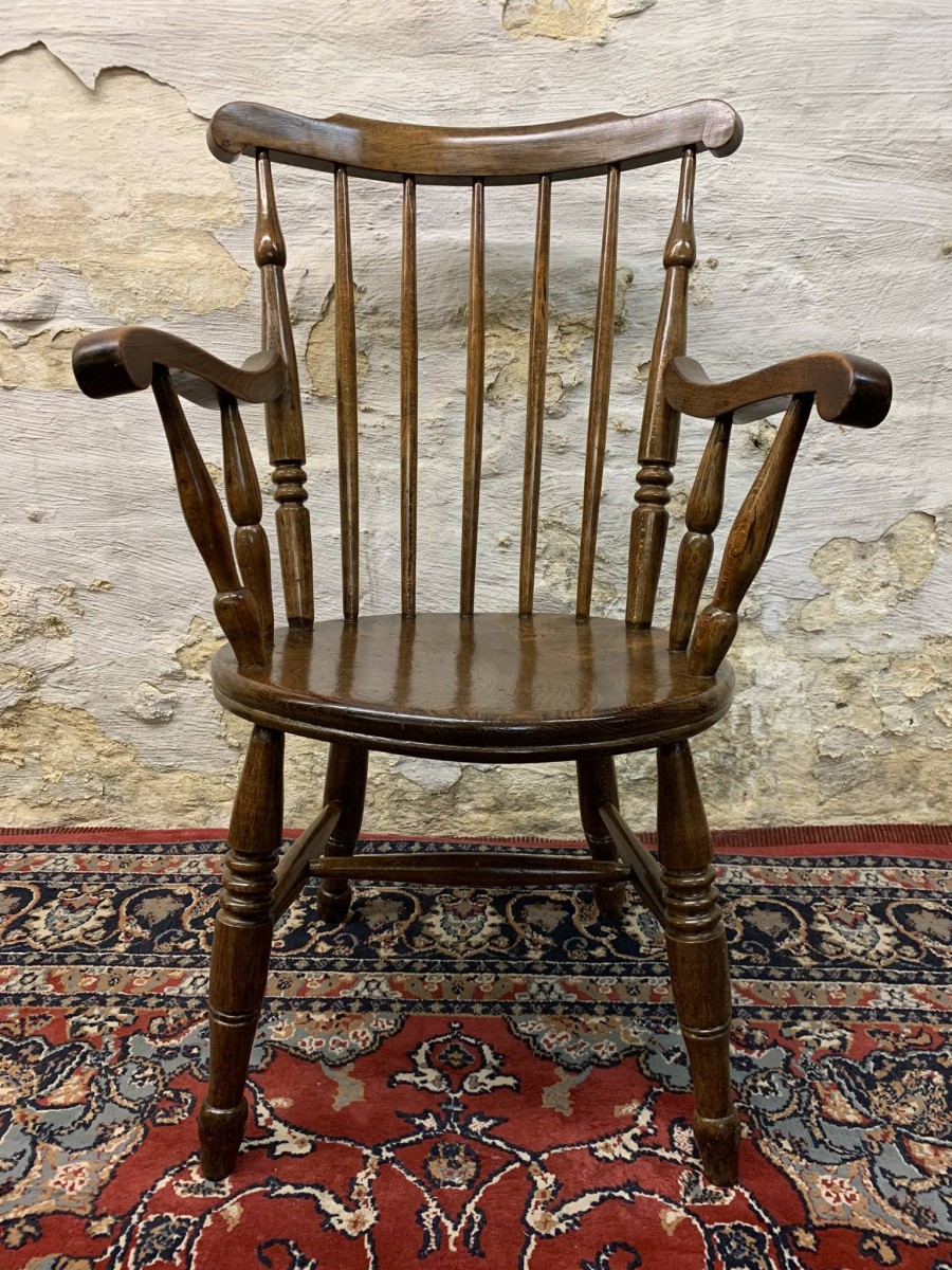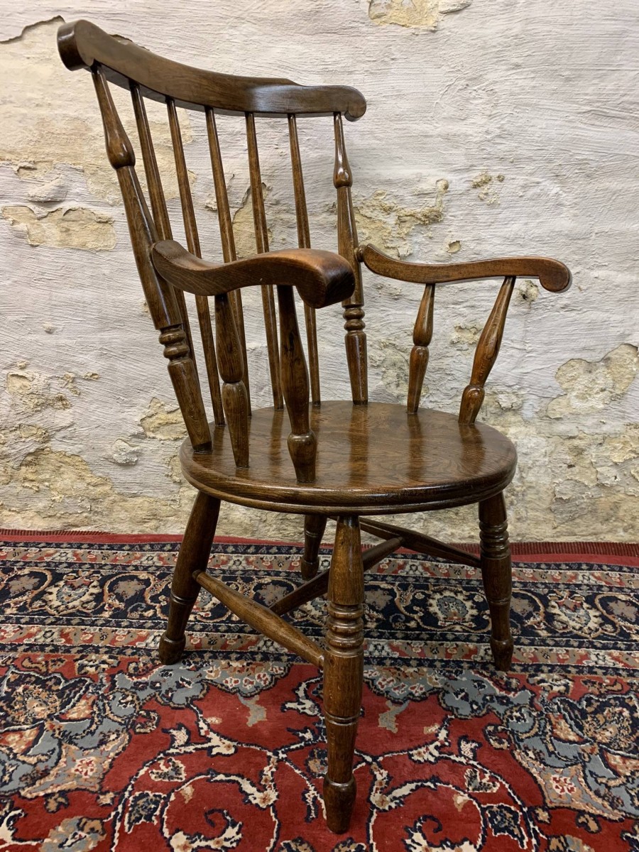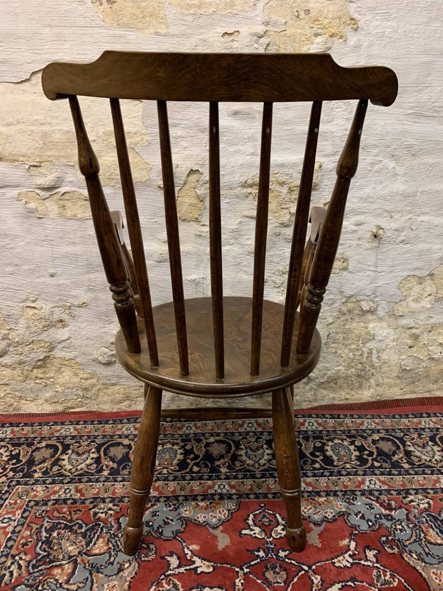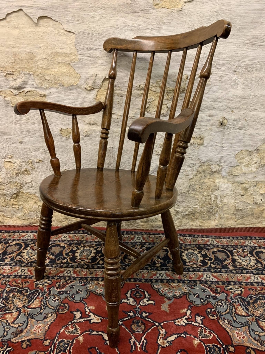 This beautiful antique elm seated chair has a spindle back, shaped arms, penny elm seat and four turned legs with stretcher supports.