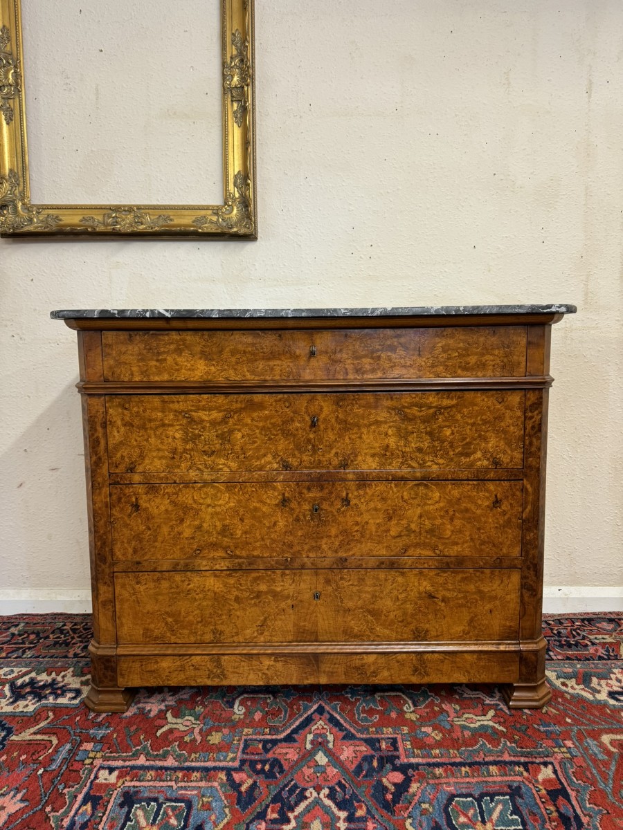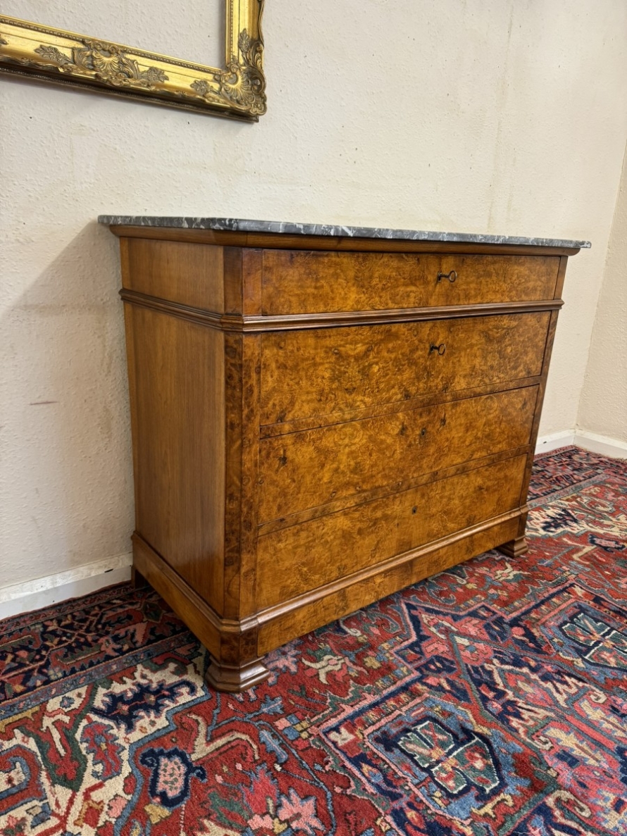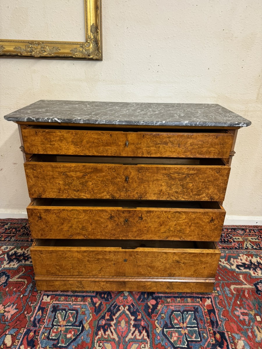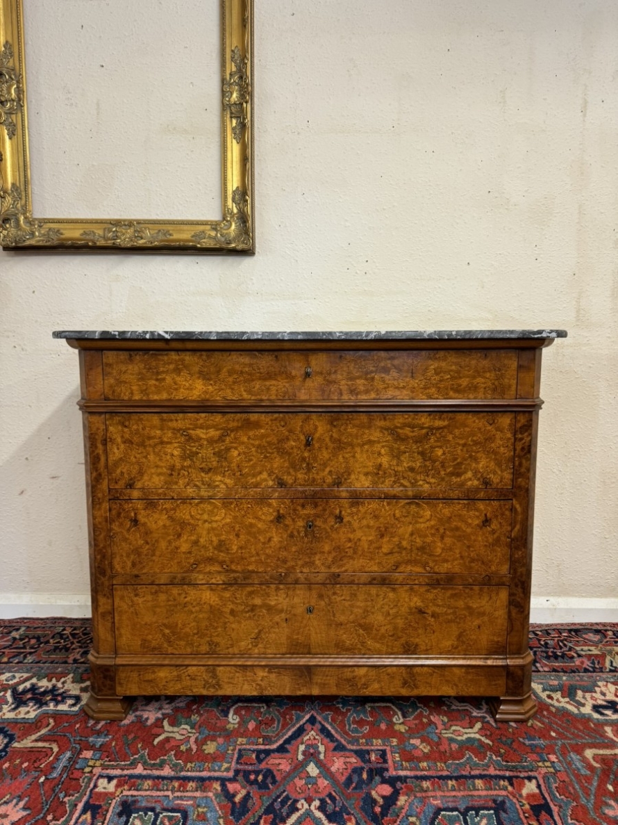 - ANTIQUE FRENCH BURR WALNUT MARBLE TOP COMMODE/CHEST OF DRAWERS CIRCA 1870