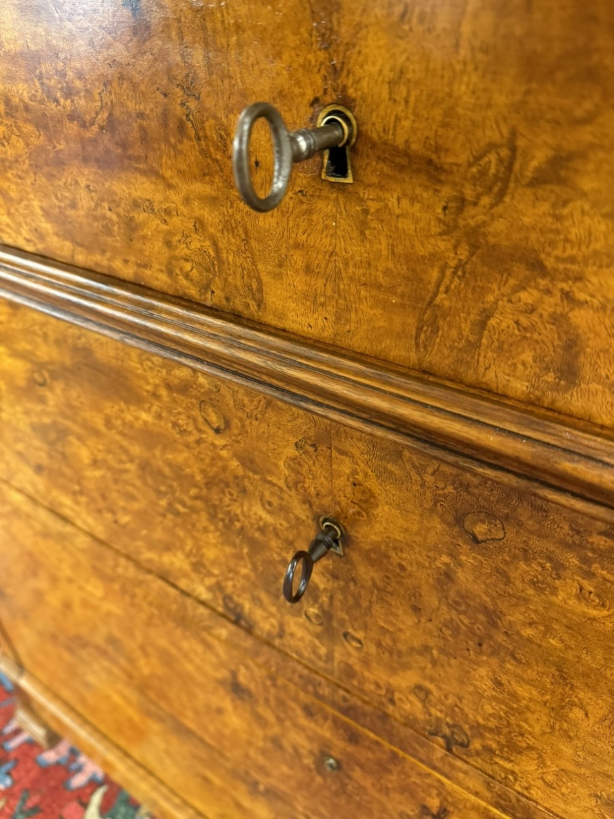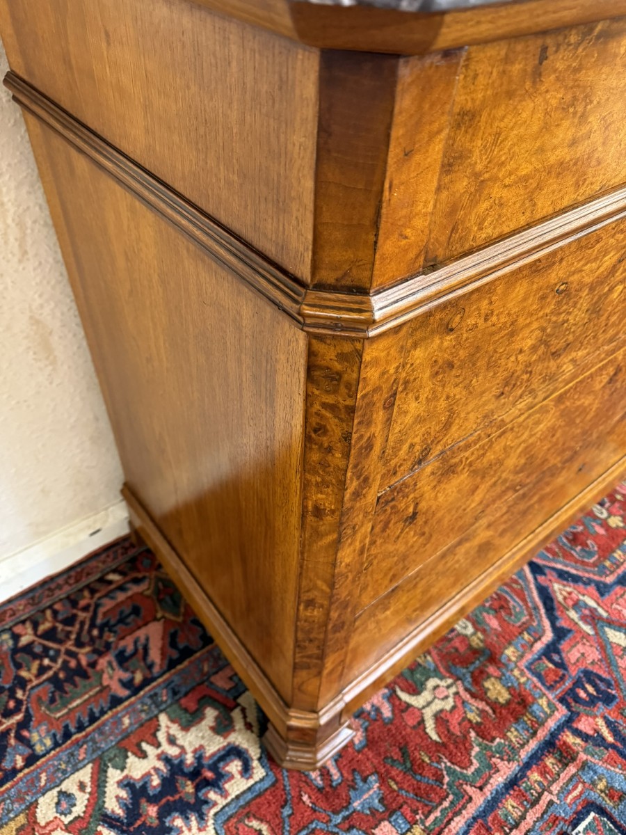 This super French chest is in excellent condition and dates circa 1870. The removable oversailing marble top sits above four lockable drawers. The base section has four lockable drawers. The commode is made in striking figured burr walnut. The chest sits on shaped feet.