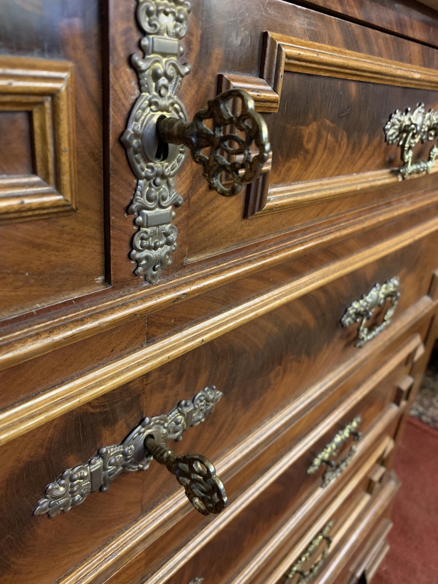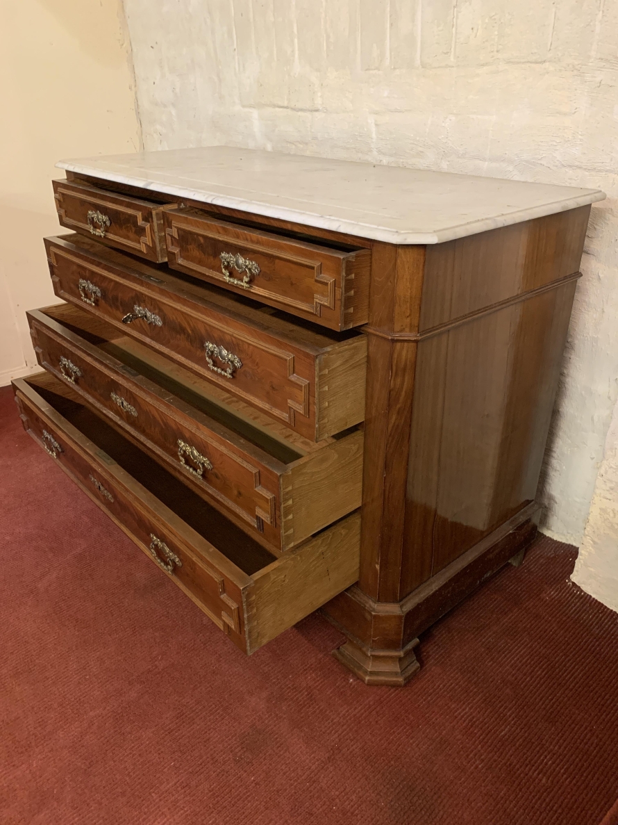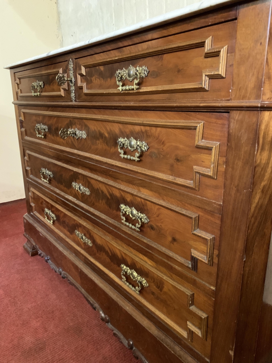 The marble top sits above a pair of short lockable carved drawers, the drawers having an ornate brass drop handle. Below are three lockable long drawers, each drawer having a pair of ornate brass handles and decorative brass escutcheon. Shaped carved skirt this fabulous antique French commode which dates circa 1890 and stands on shaped bracket feet to the front.