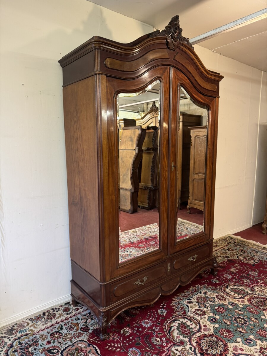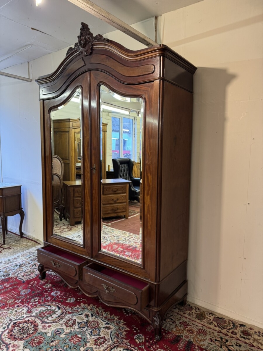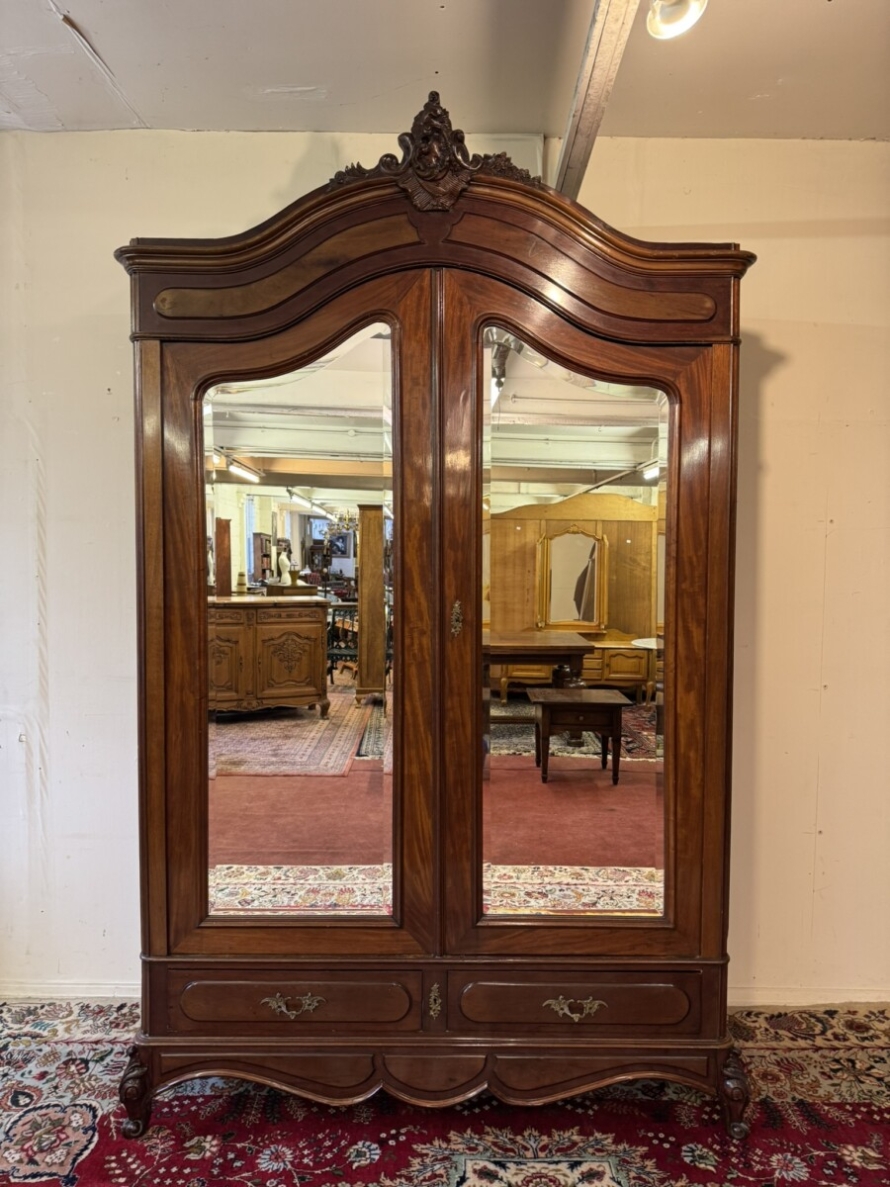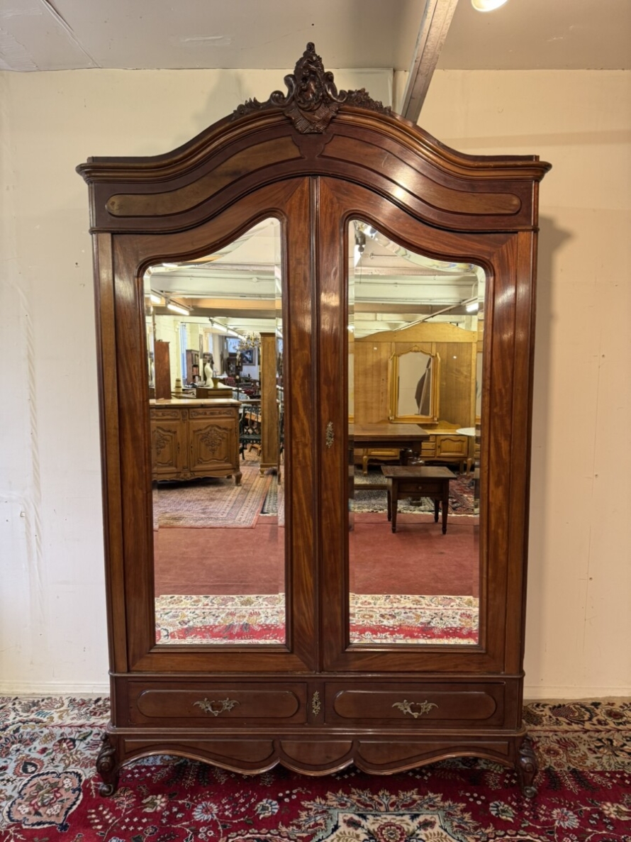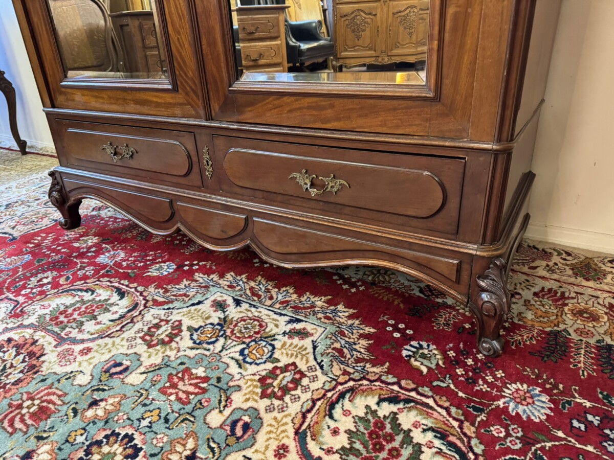 This fabulous French armoire dates circa 1890. The shaped oversailing top rises to a superb central carving, below are a pair of shaped bevel edged full length mirror doors. The doors open to reveal a hanging rail. There are two drawers below, each drawer having an ornate brass handle. Shaped skirt and standing on carved cabriole shaped legs to the front. Please note this armoire completely splits down for easy transportation and delivery into any home.