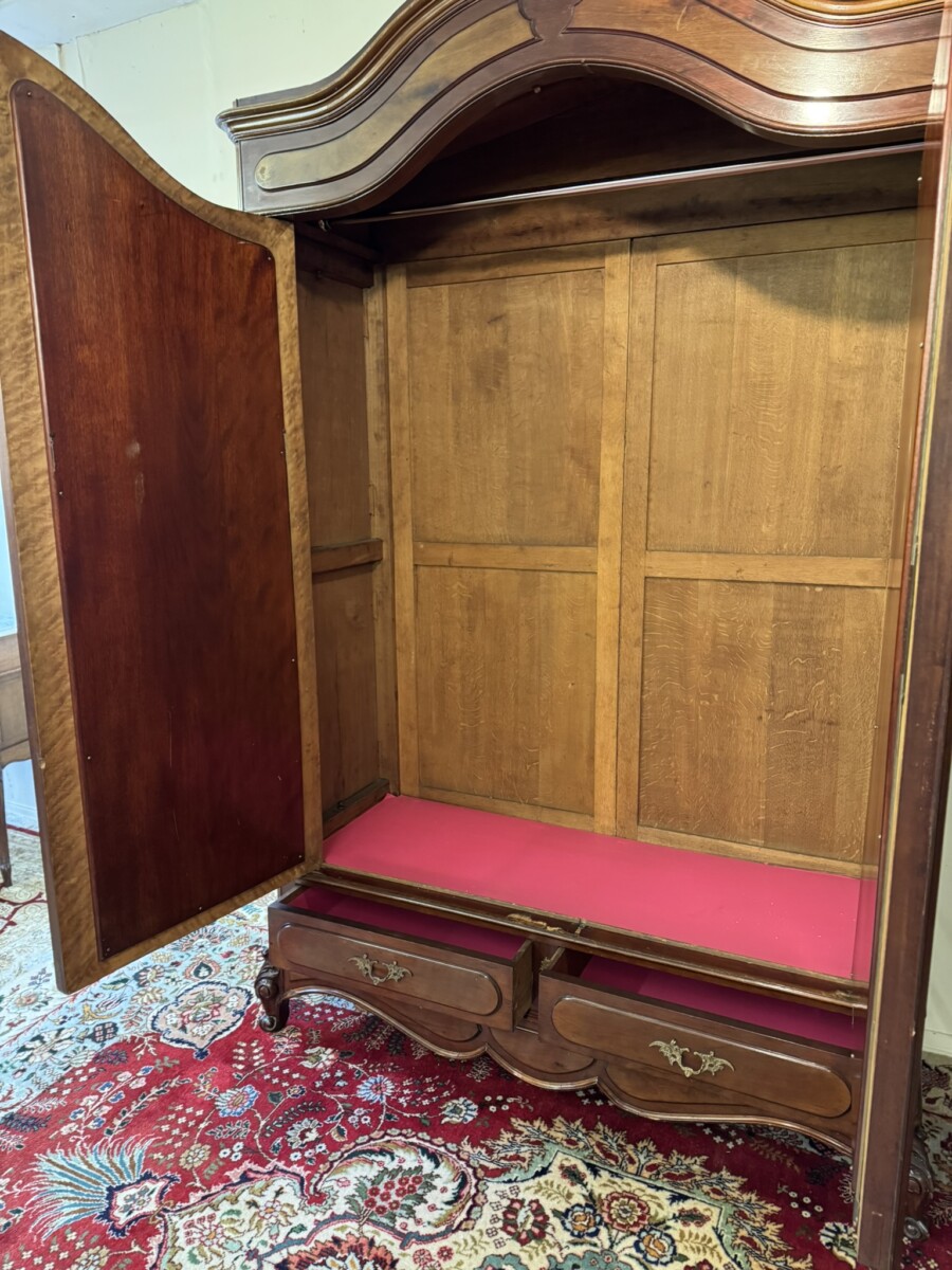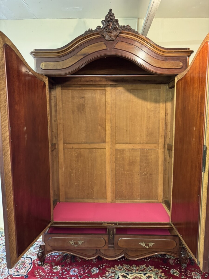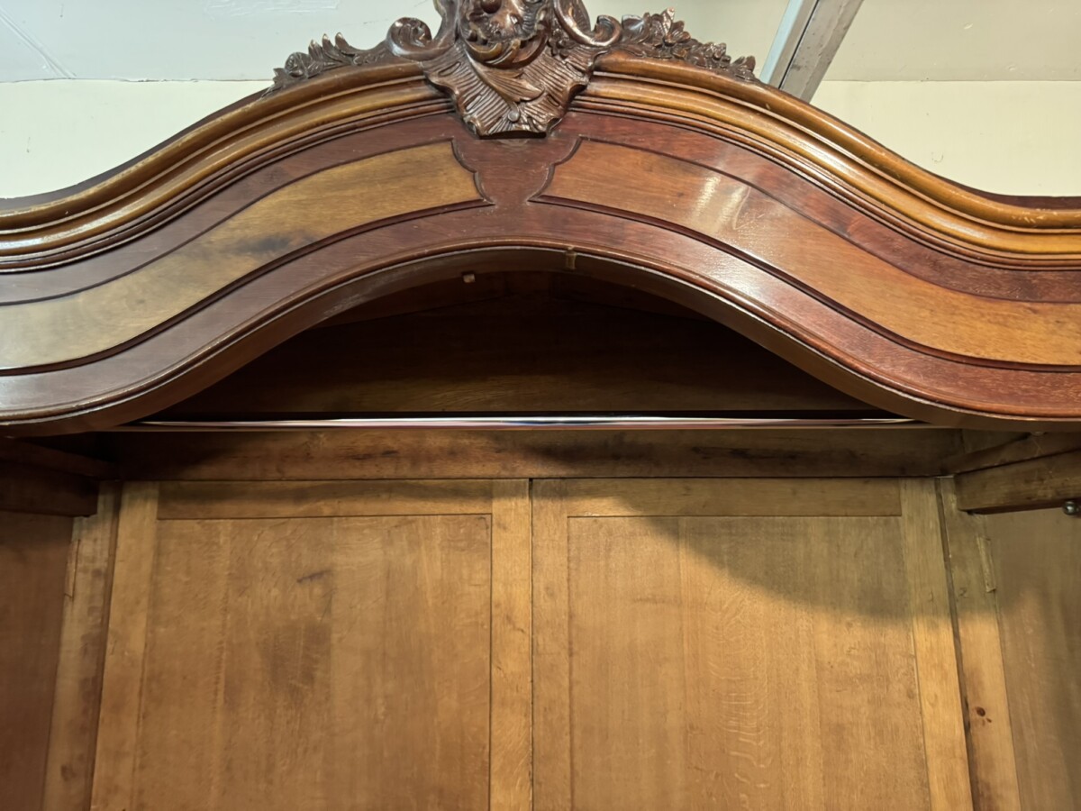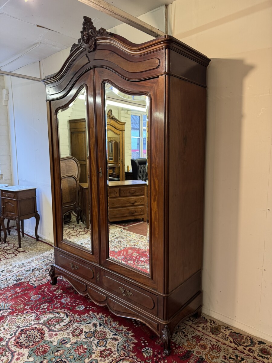 This fabulous French armoire dates circa 1890. The shaped oversailing top rises to a superb central carving, below are a pair of shaped bevel edged full length mirror doors. The doors open to reveal a hanging rail. There are two drawers below, each drawer having an ornate brass handle. Shaped skirt and standing on carved cabriole shaped legs to the front. Please note this armoire completely splits down for easy transportation and delivery into any home.