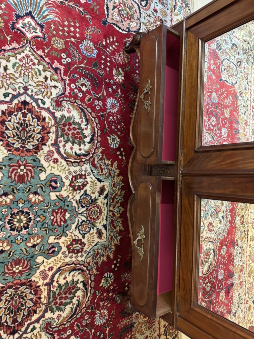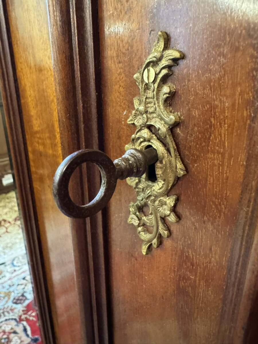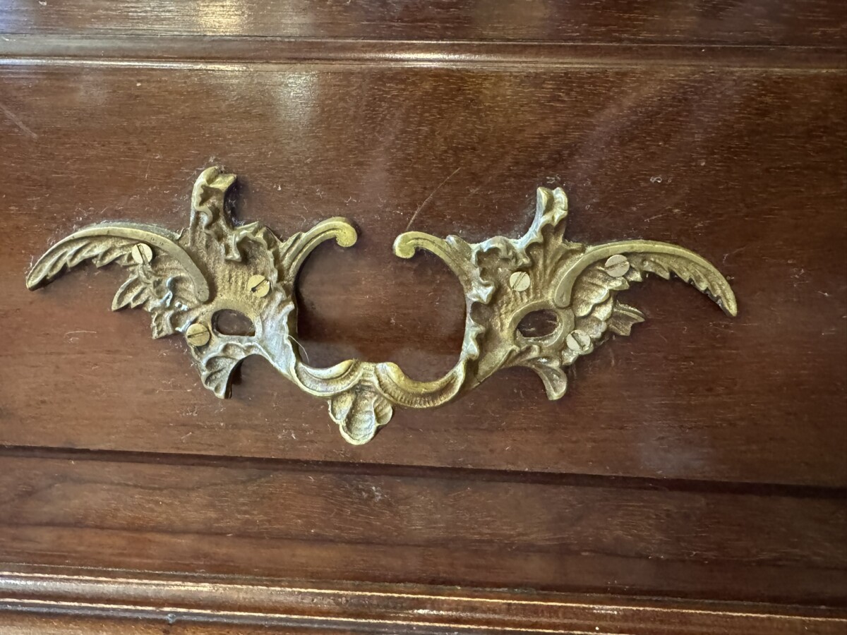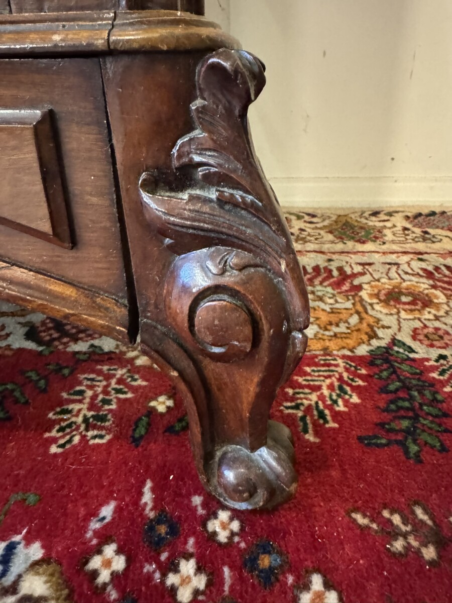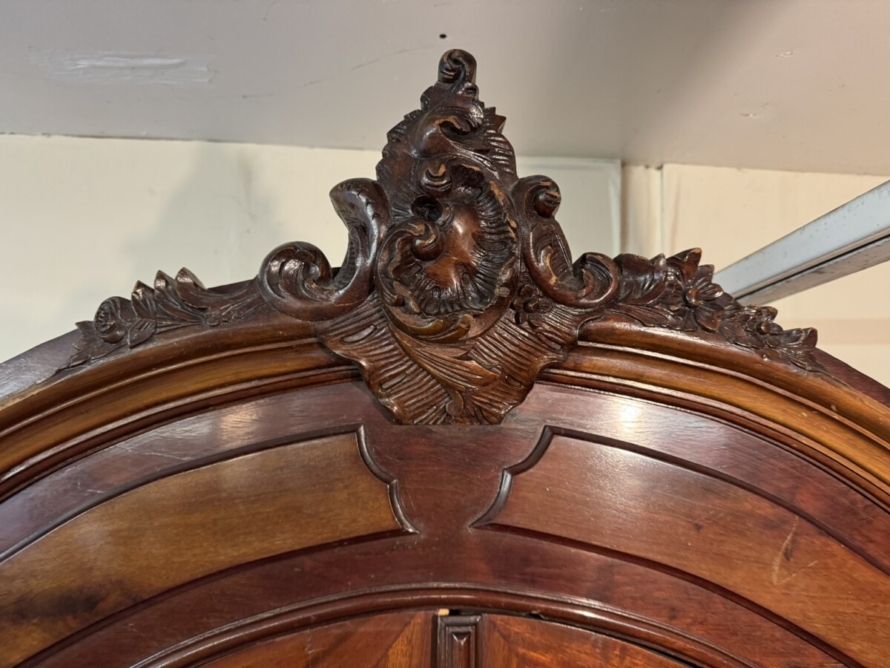 This fabulous French armoire dates circa 1890. The shaped oversailing top rises to a superb central carving, below are a pair of shaped bevel edged full length mirror doors. The doors open to reveal a hanging rail. There are two drawers below, each drawer having an ornate brass handle. Shaped skirt and standing on carved cabriole shaped legs to the front. Please note this armoire completely splits down for easy transportation and delivery into any home.