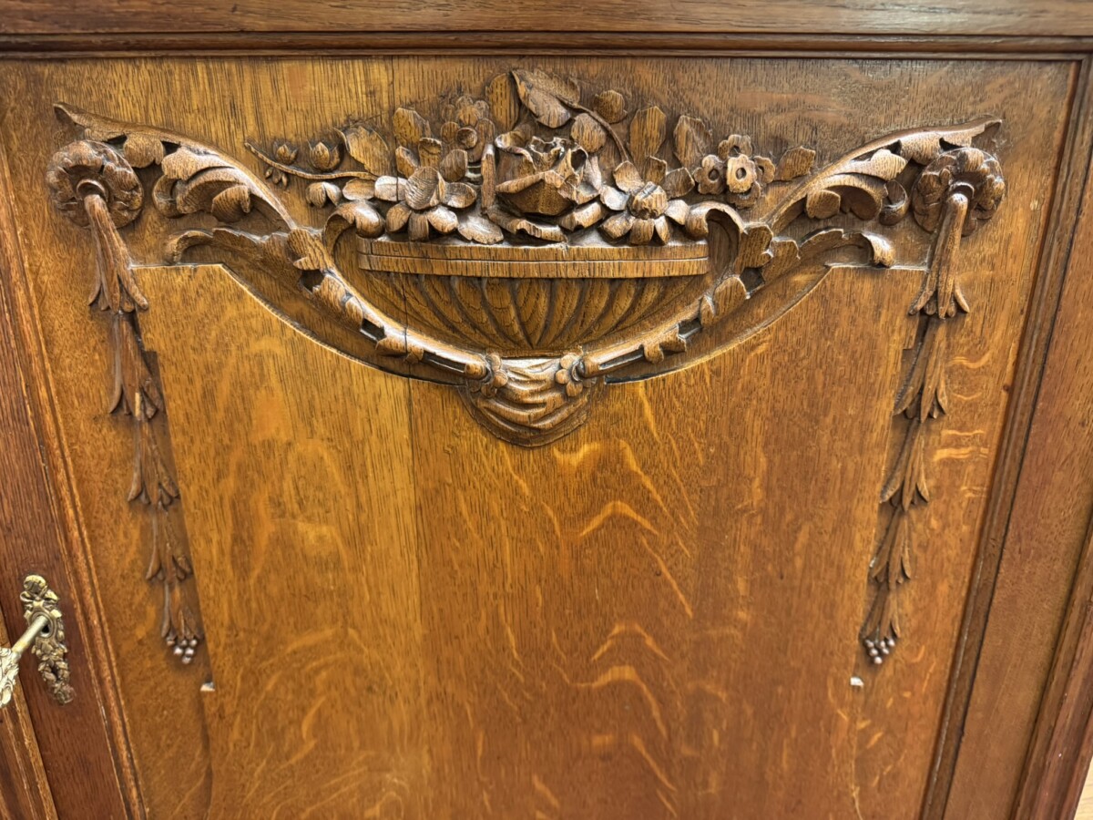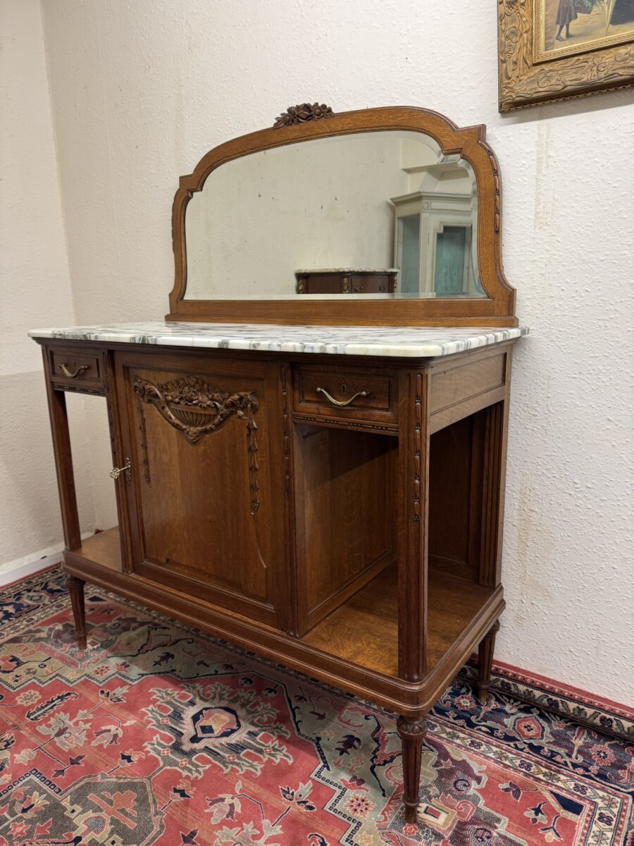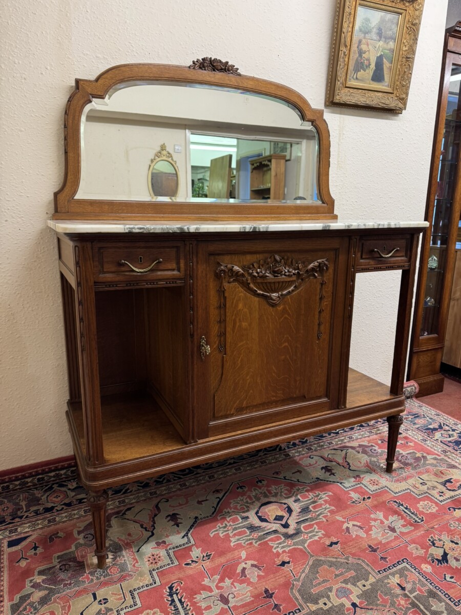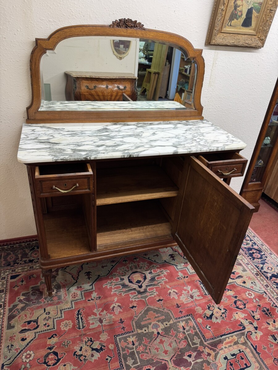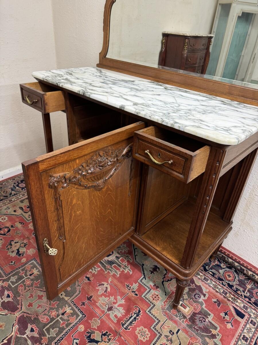This fine French antique carved oak marble top dresser dates circa 1900. The removable shaped bevel edged mirrored back has an ornate central carving. The marble top sits above a lockable carved recessed panelled central door, the door opens to reveal a removable shelf. Flanked by a pair of drawers with open sections below and standing on four carved tapered legs with brass capped feet.