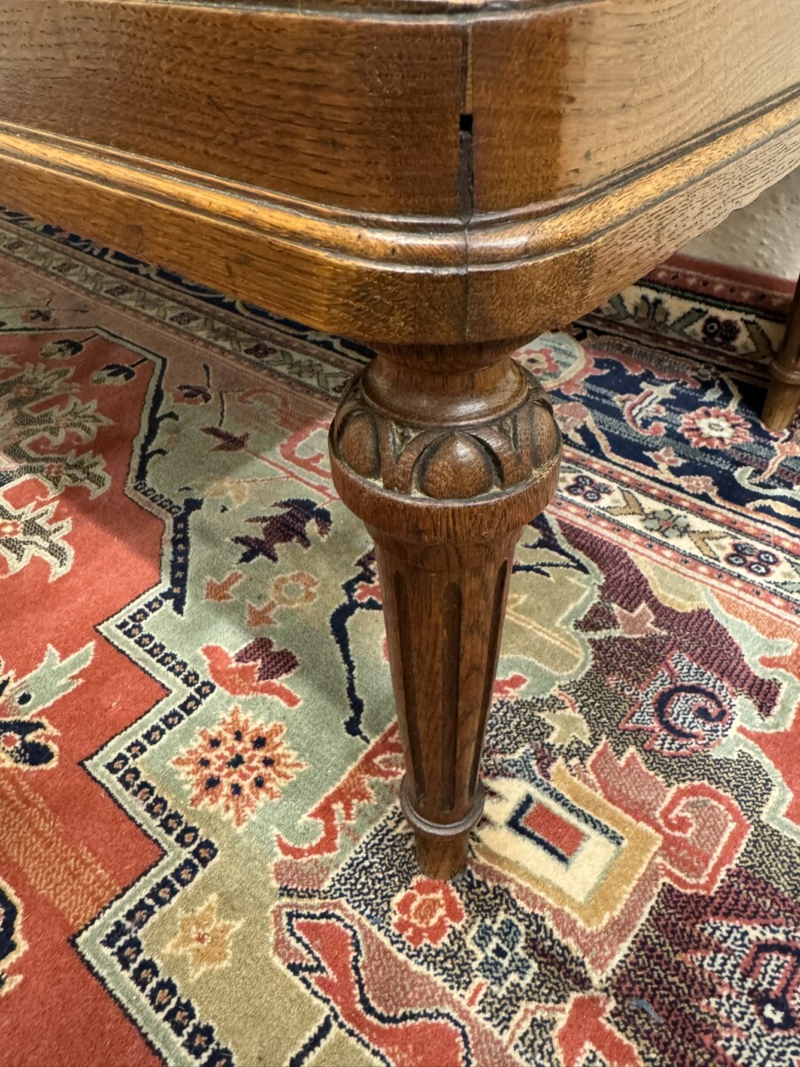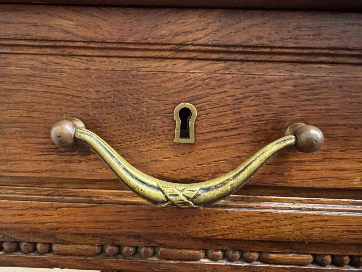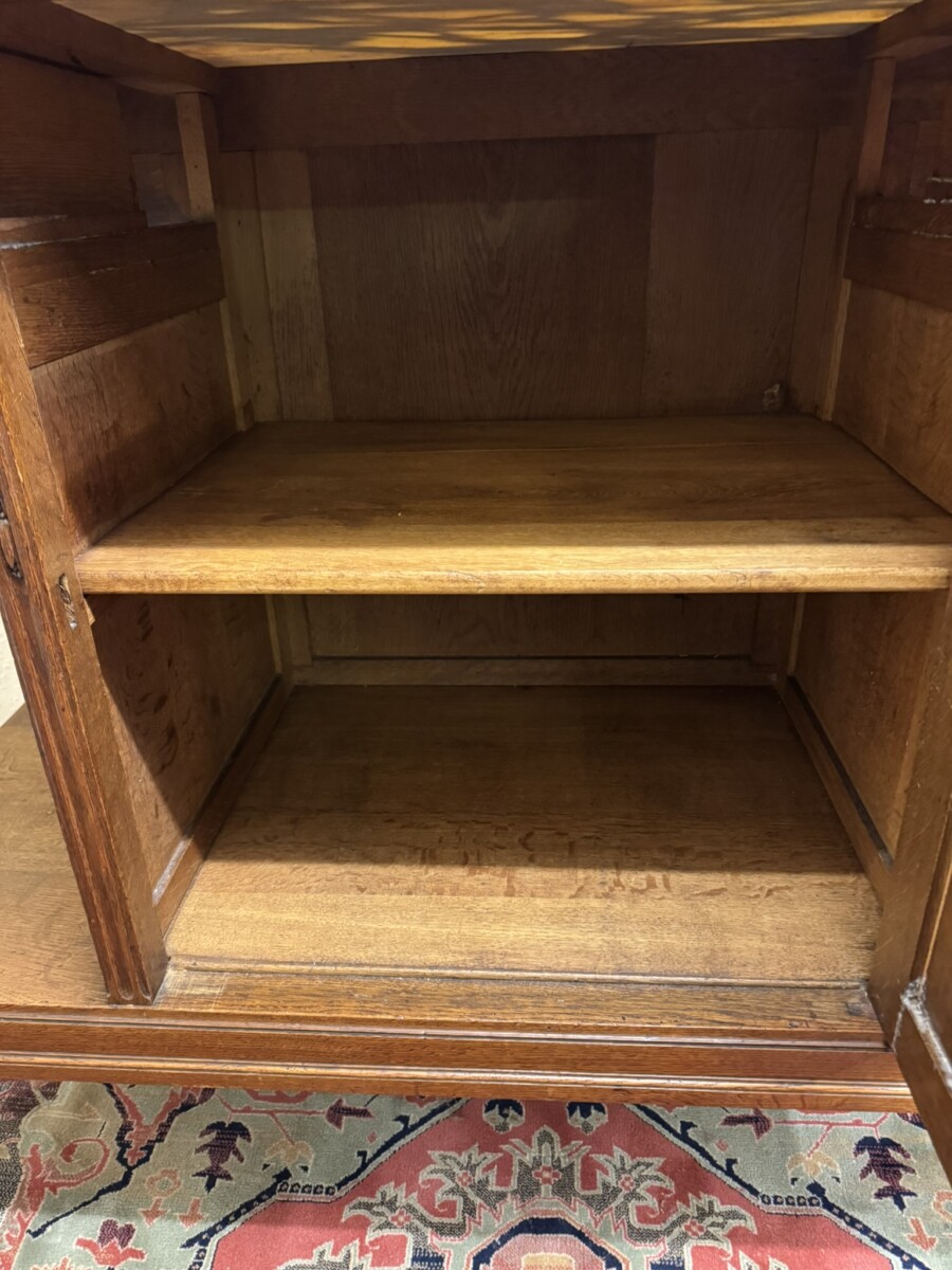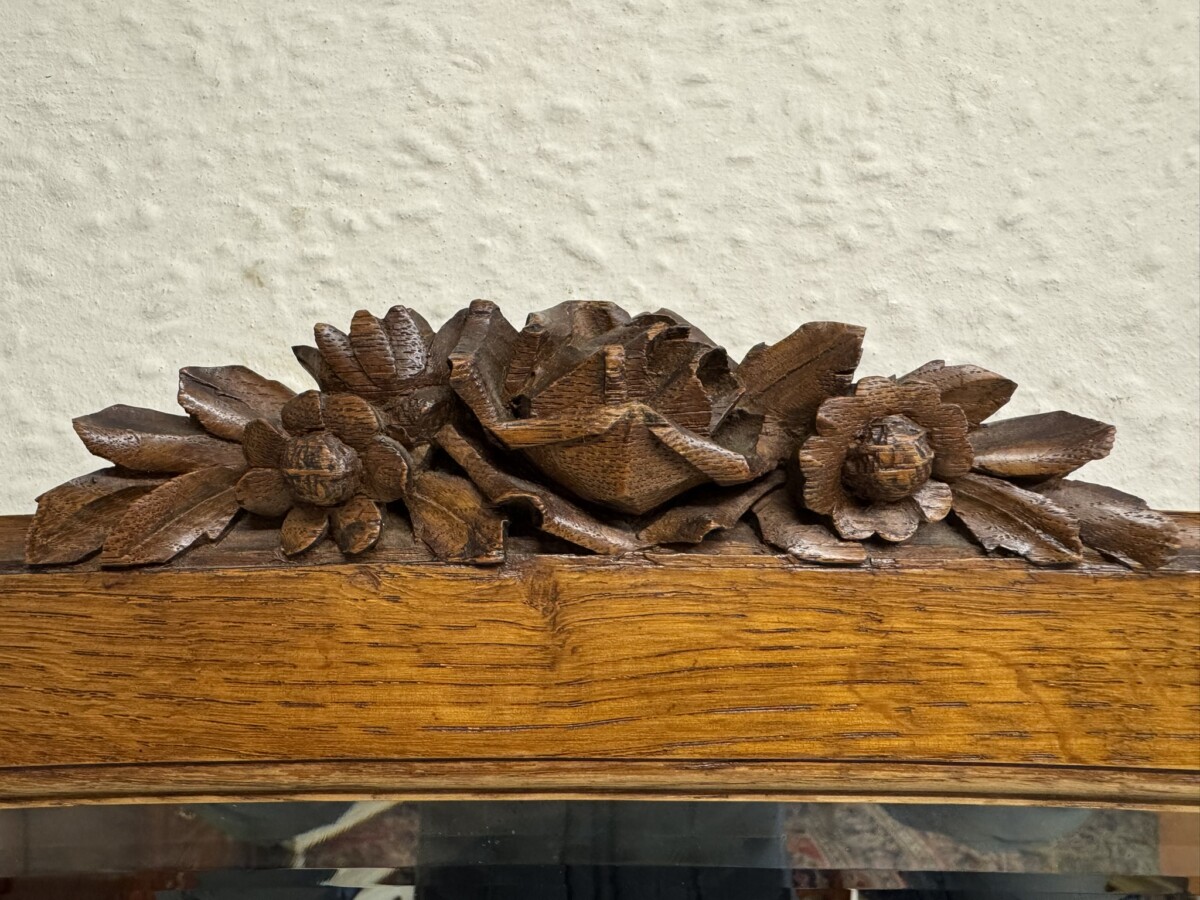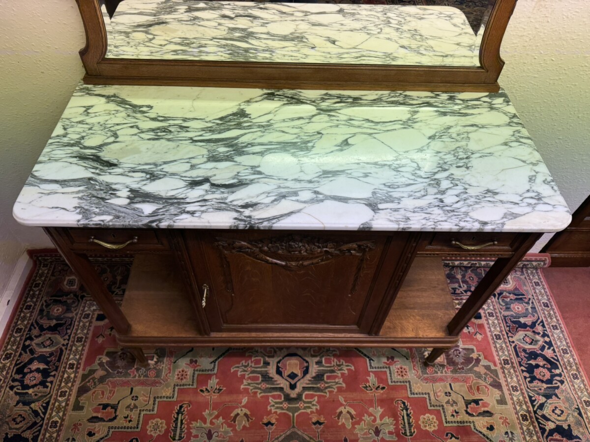 This fine French antique carved oak marble top dresser dates circa 1900. The removable shaped bevel edged mirrored back has an ornate central carving. The marble top sits above a lockable carved recessed panelled central door, the door opens to reveal a removable shelf. Flanked by a pair of drawers with open sections below and standing on four carved tapered legs with brass capped feet.