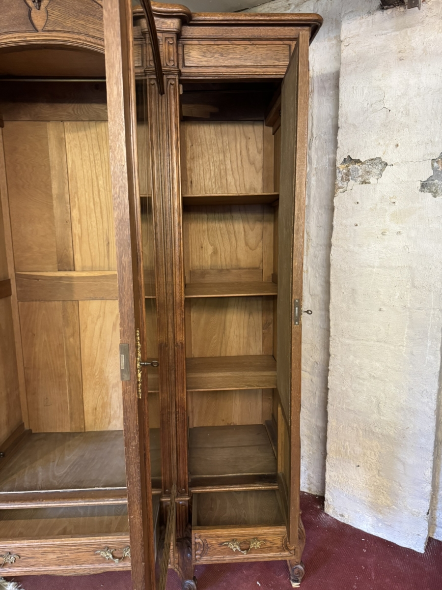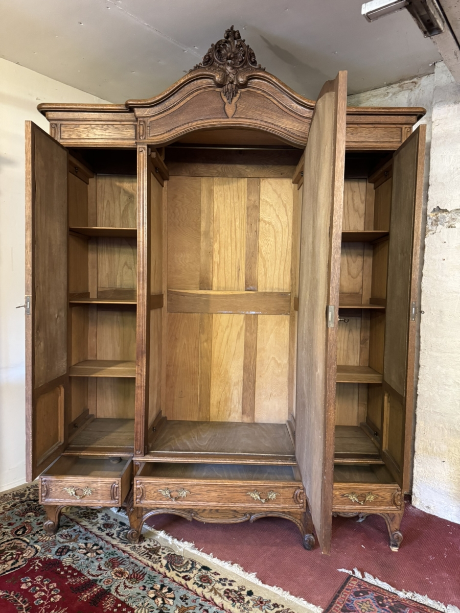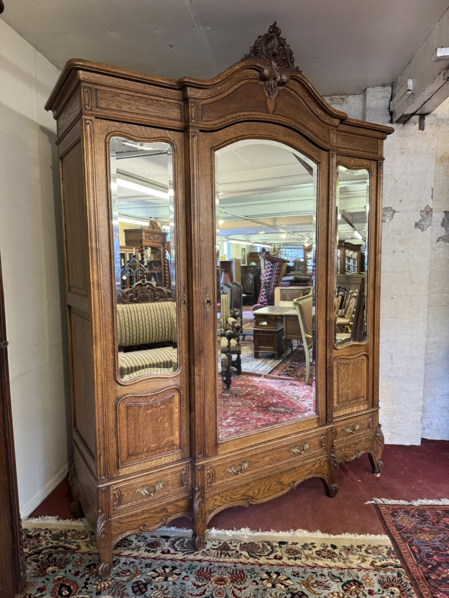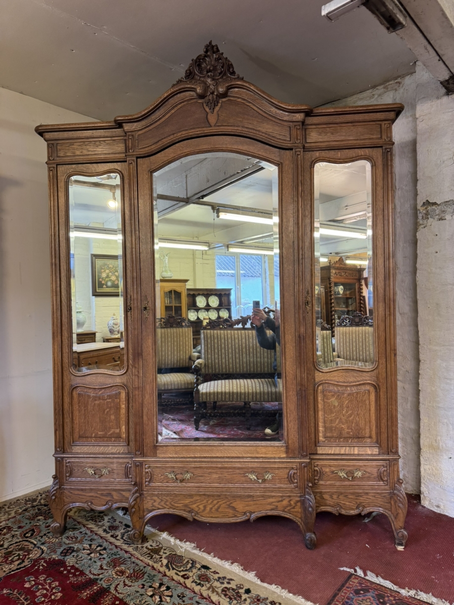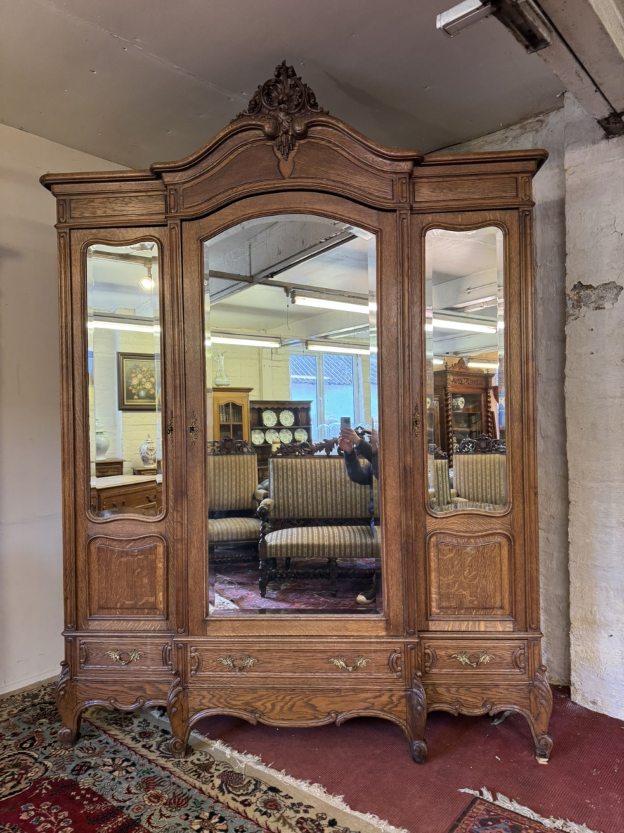 This fantastic armoire dates circa 1880 and is made in striking oak. The shaped over sailing top rises to central decorative carving, below is a central brake front mirrored door flanked by a pair of mirrored doors with shaped panel below. The left-hand door opens to reveal a hanging rail above three removable shelves. The central door opens to reveal a hanging rail. The right-hand door opens to reveal a hanging rail above three removable shelves. Below each door is a drawer – the drawers having ornate gilt brass handles. Recessed panelled sides, shaped skirt and standing on six carved cabriole shaped legs. Please note this armoire completely splits down for easy transportation and delivery into any home.