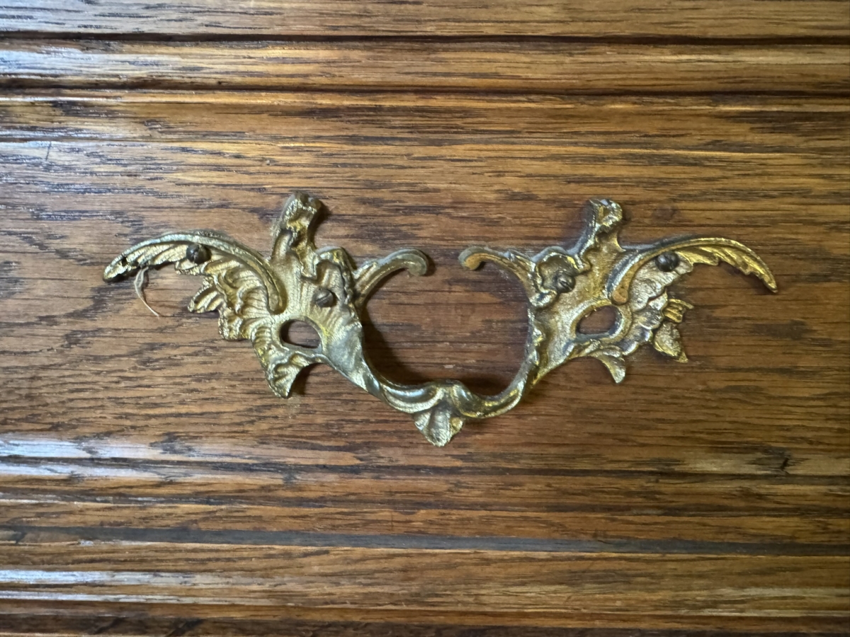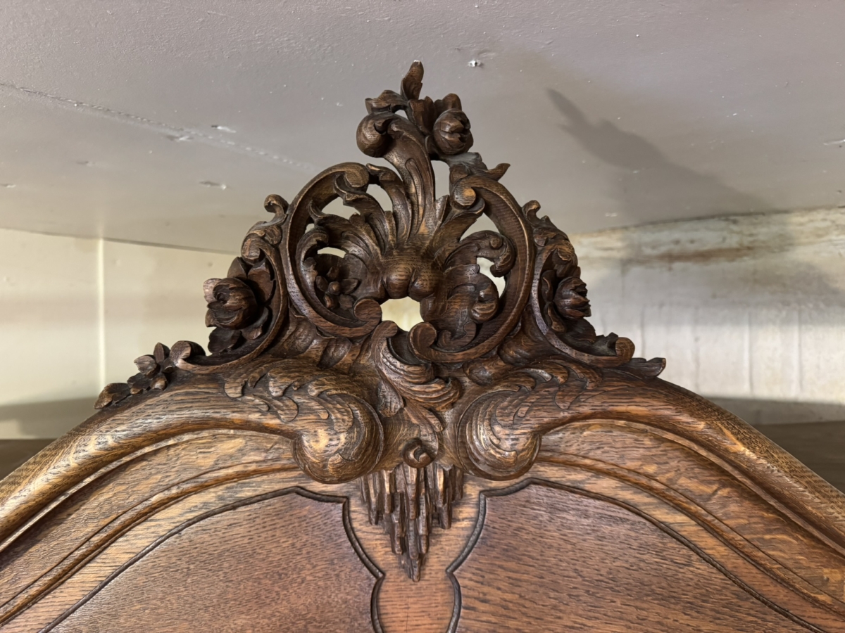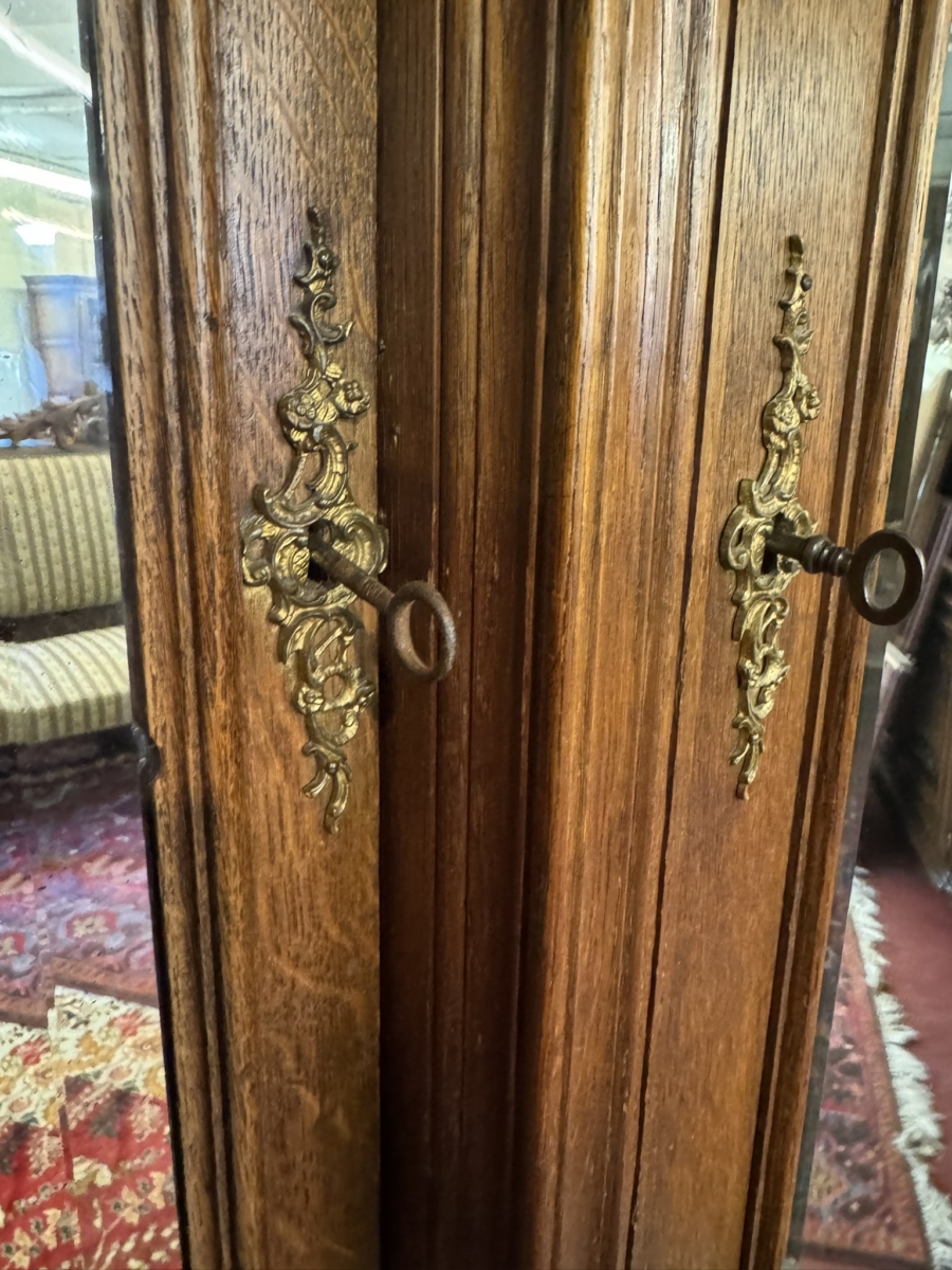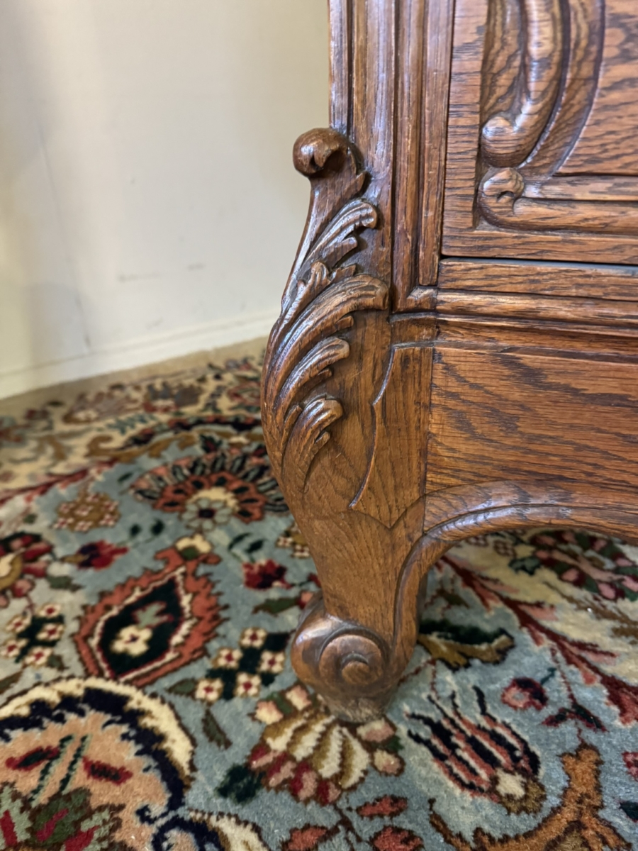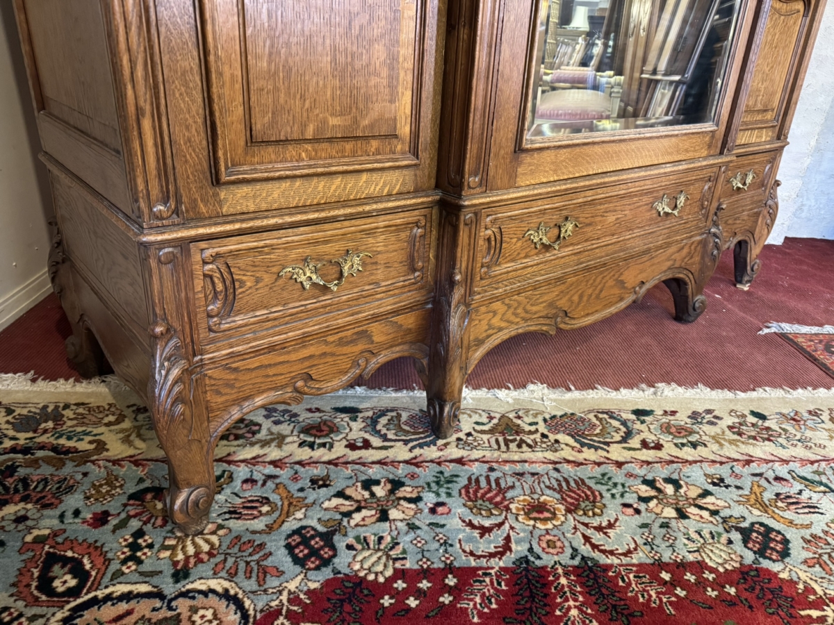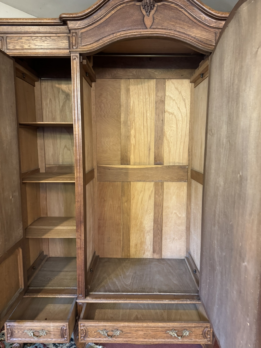 This fantastic armoire dates circa 1880 and is made in striking oak. The shaped over sailing top rises to central decorative carving, below is a central brake front mirrored door flanked by a pair of mirrored doors with shaped panel below. The left-hand door opens to reveal a hanging rail above three removable shelves. The central door opens to reveal a hanging rail. The right-hand door opens to reveal a hanging rail above three removable shelves. Below each door is a drawer – the drawers having ornate gilt brass handles. Recessed panelled sides, shaped skirt and standing on six carved cabriole shaped legs. Please note this armoire completely splits down for easy transportation and delivery into any home.