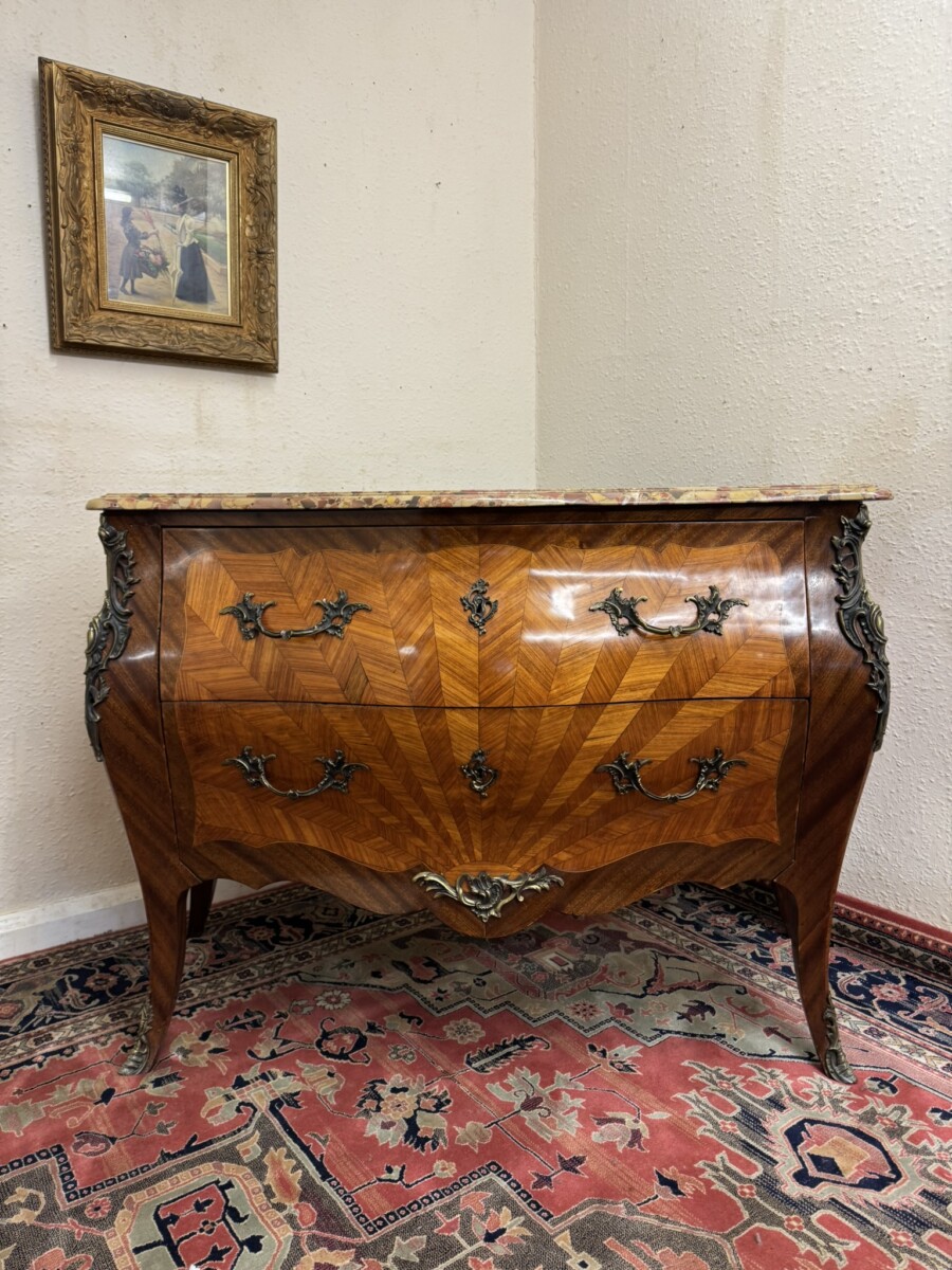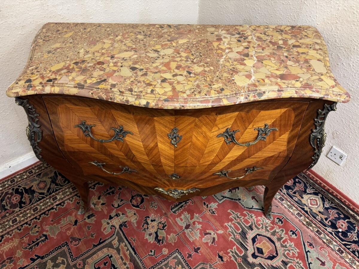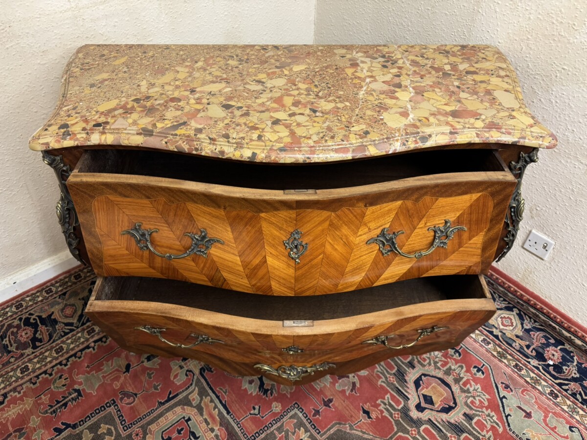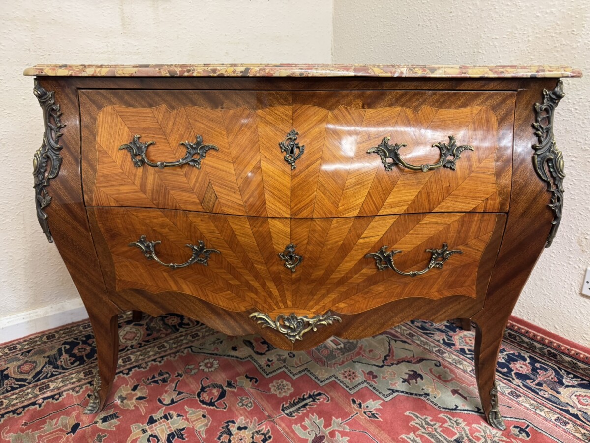 This fine commode dates circa 1890. Shaped marble top sits above a pair of drawers, each drawer has a striking sun burst marquetry inlay and a pair of ormolu gilt handles with ormolu gilt escutcheon’s. To the base is an ormolu decorative mount. Striking quarter veneered sides, impressive ormolu gilt mounts, out swept feet with ormolu gilt mounts to the front. A stunning commode.