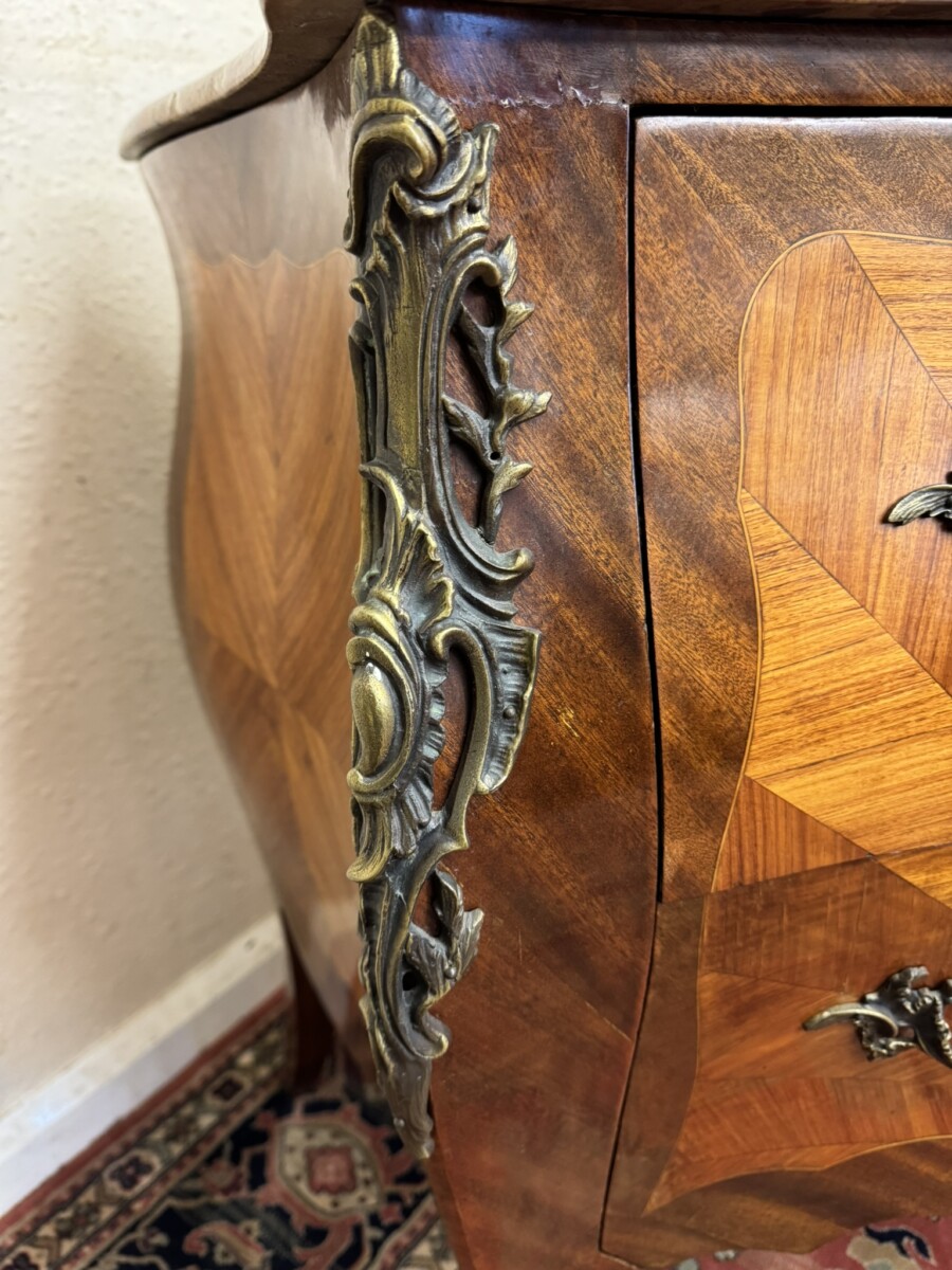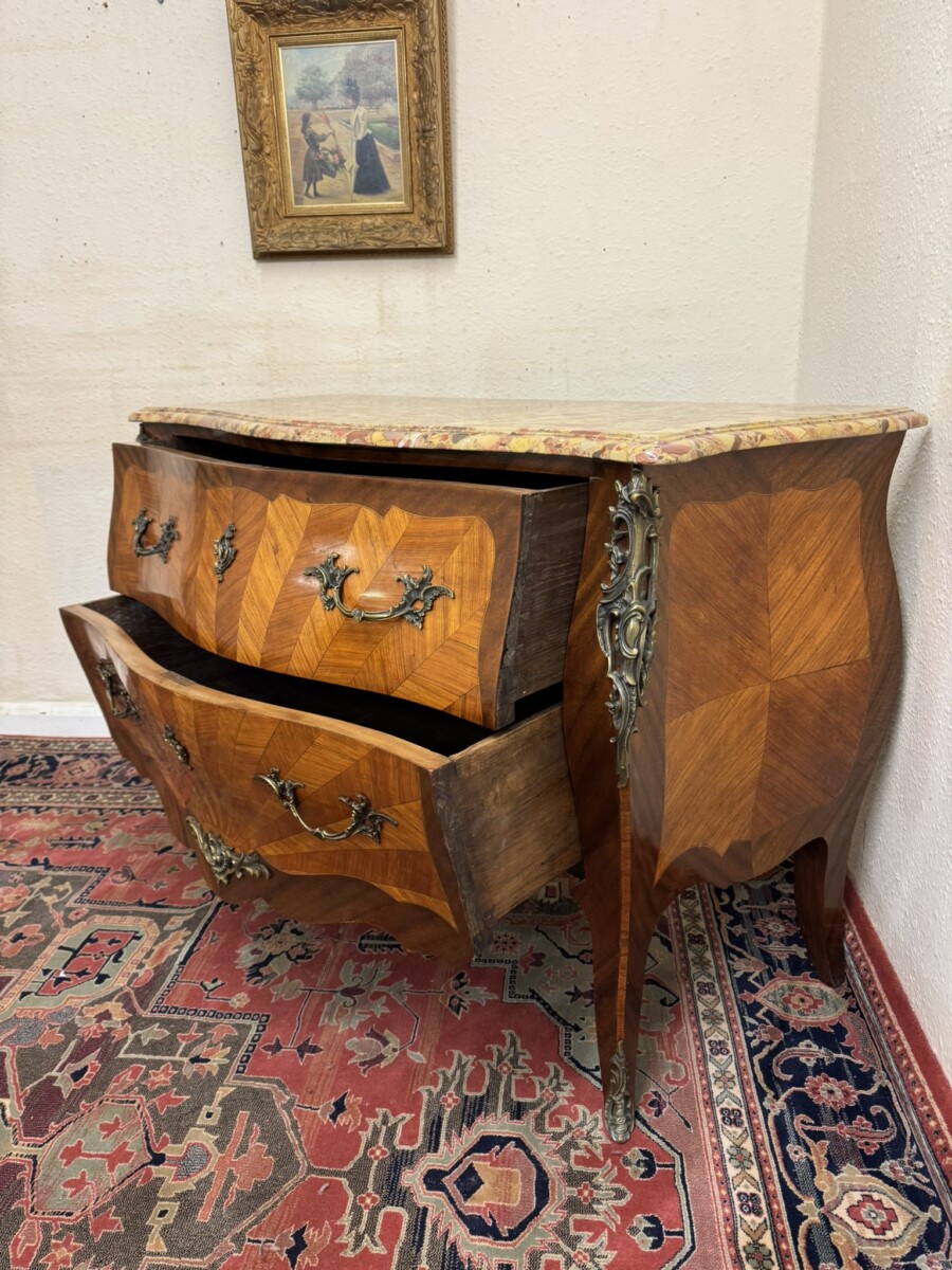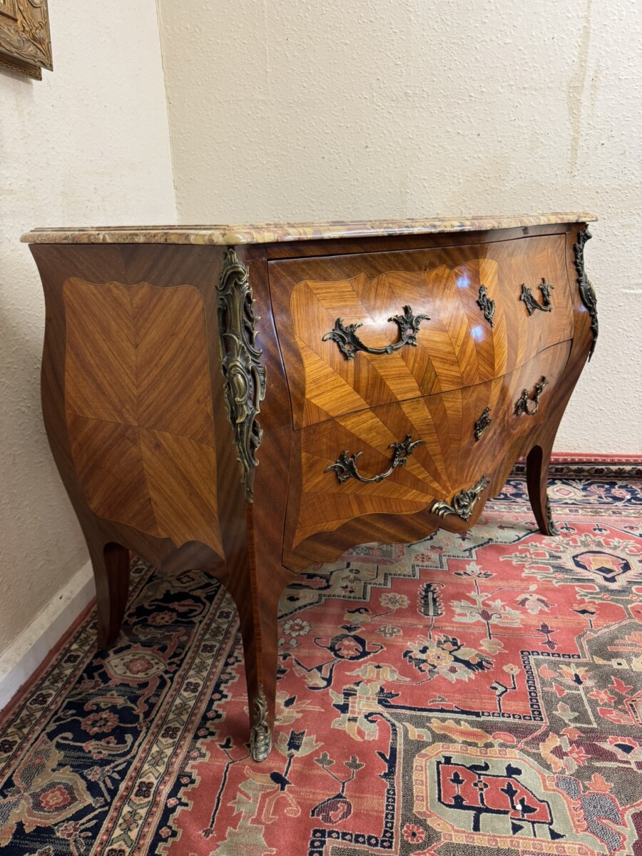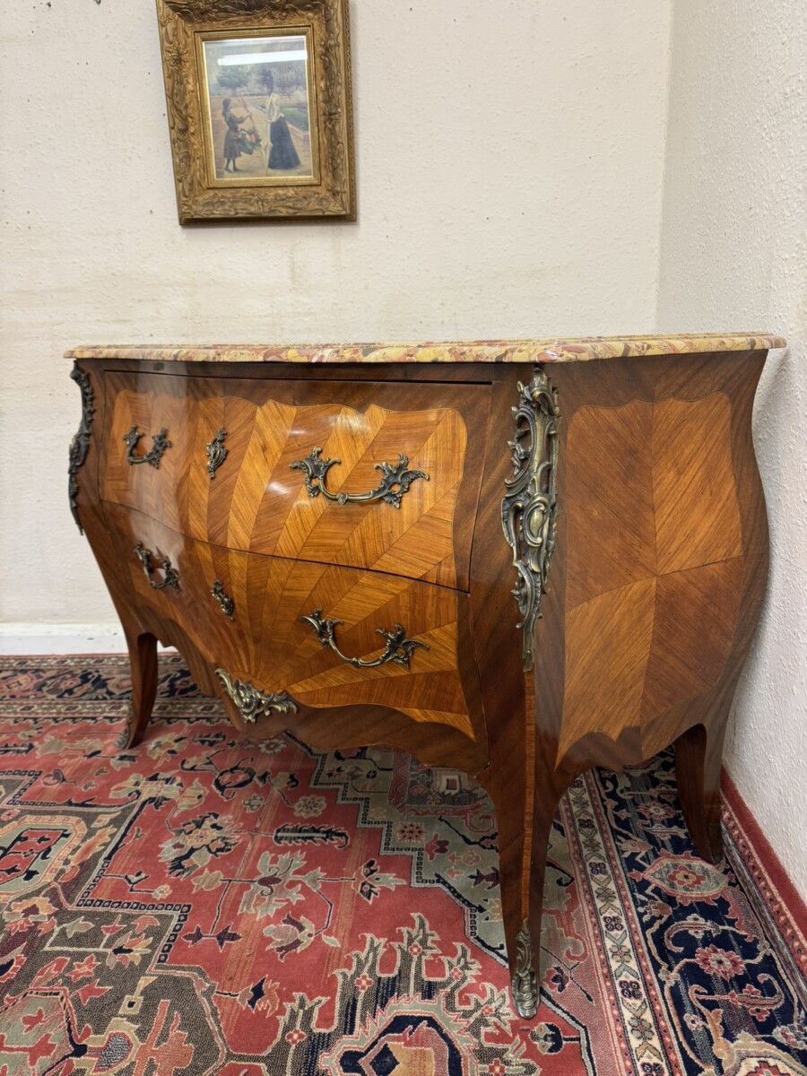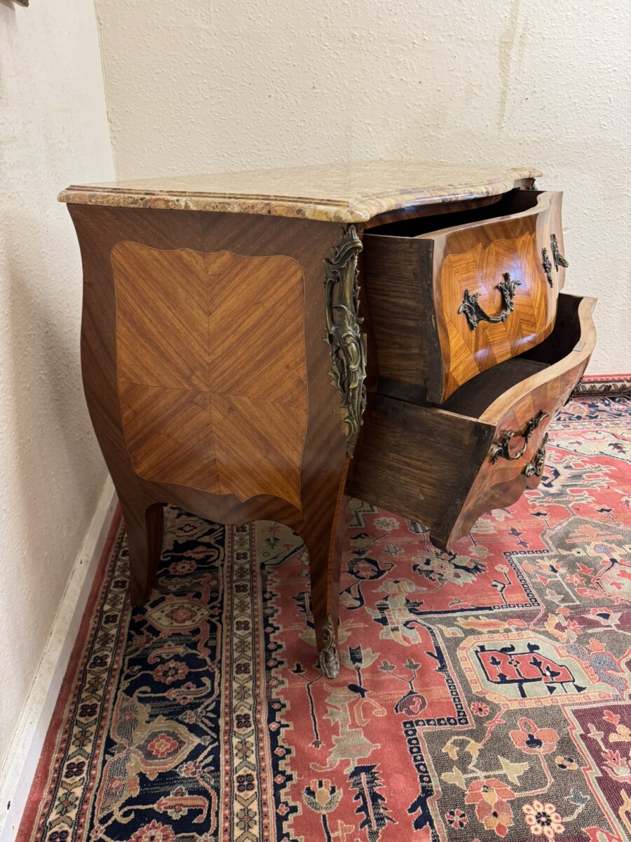 This fine commode dates circa 1890. Shaped marble top sits above a pair of drawers, each drawer has a striking sun burst marquetry inlay and a pair of ormolu gilt handles with ormolu gilt escutcheon’s. To the base is an ormolu decorative mount. Striking quarter veneered sides, impressive ormolu gilt mounts, out swept feet with ormolu gilt mounts to the front. A stunning commode.