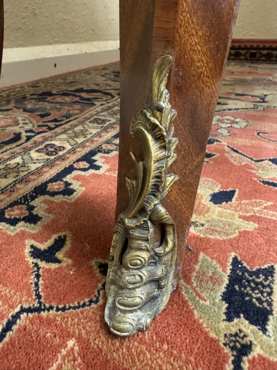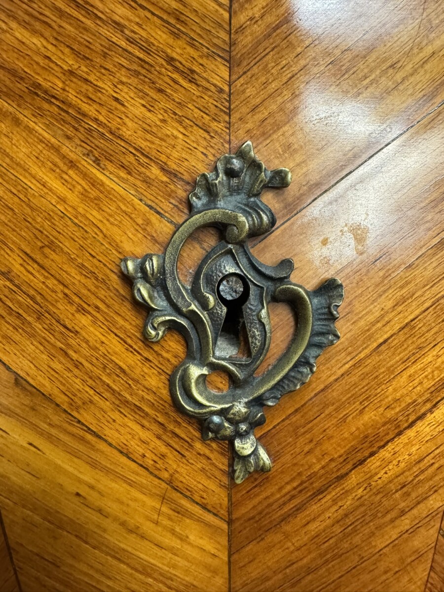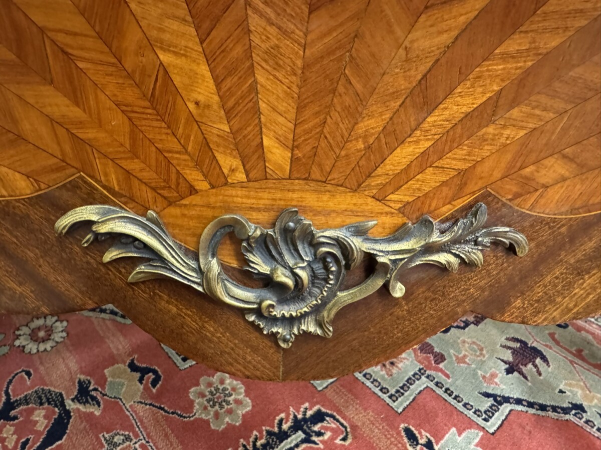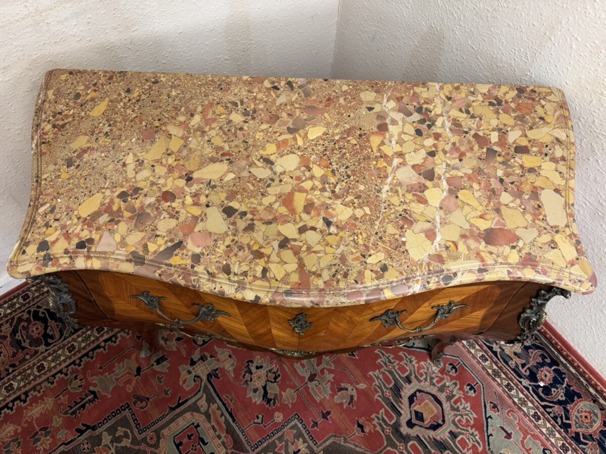 This fine commode dates circa 1890. Shaped marble top sits above a pair of drawers, each drawer has a striking sun burst marquetry inlay and a pair of ormolu gilt handles with ormolu gilt escutcheon’s. To the base is an ormolu decorative mount. Striking quarter veneered sides, impressive ormolu gilt mounts, out swept feet with ormolu gilt mounts to the front. A stunning commode.