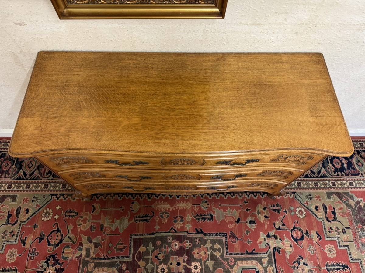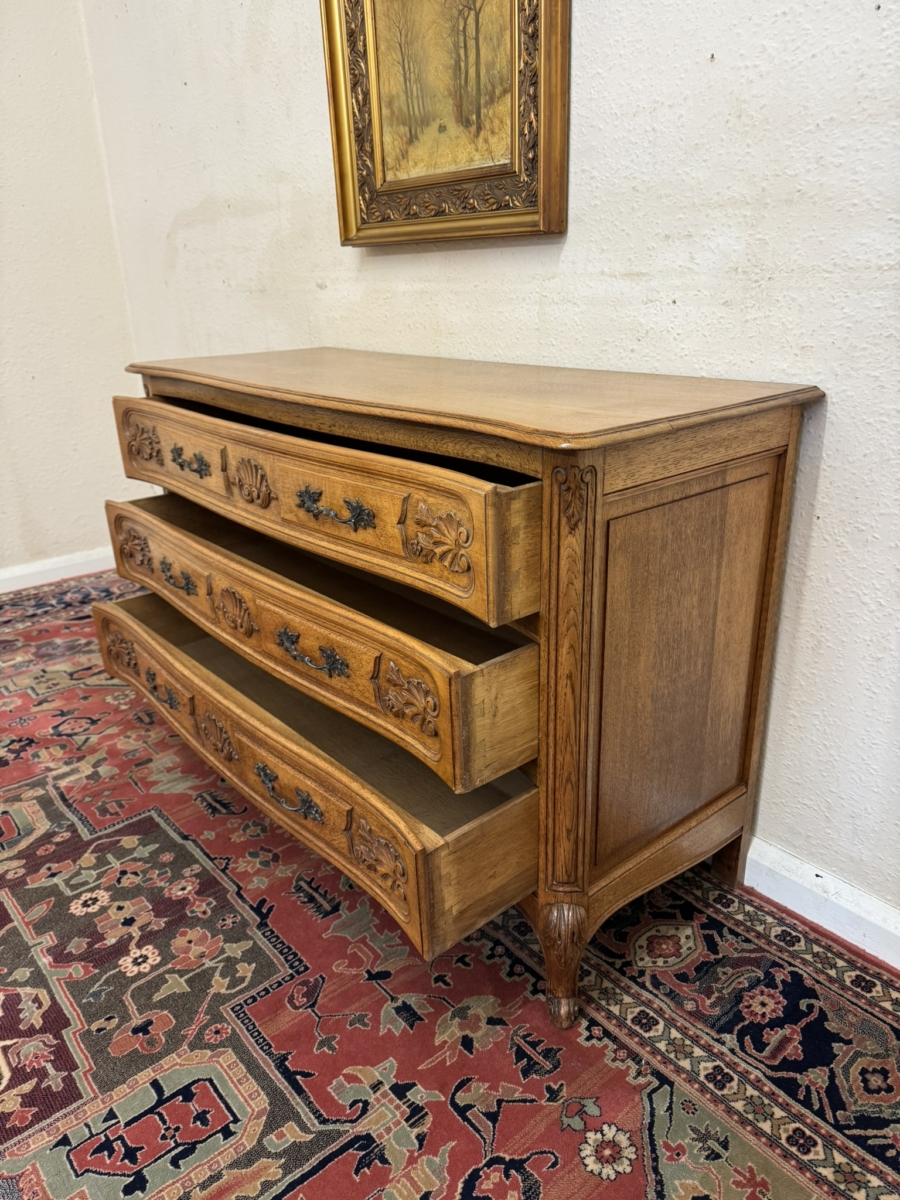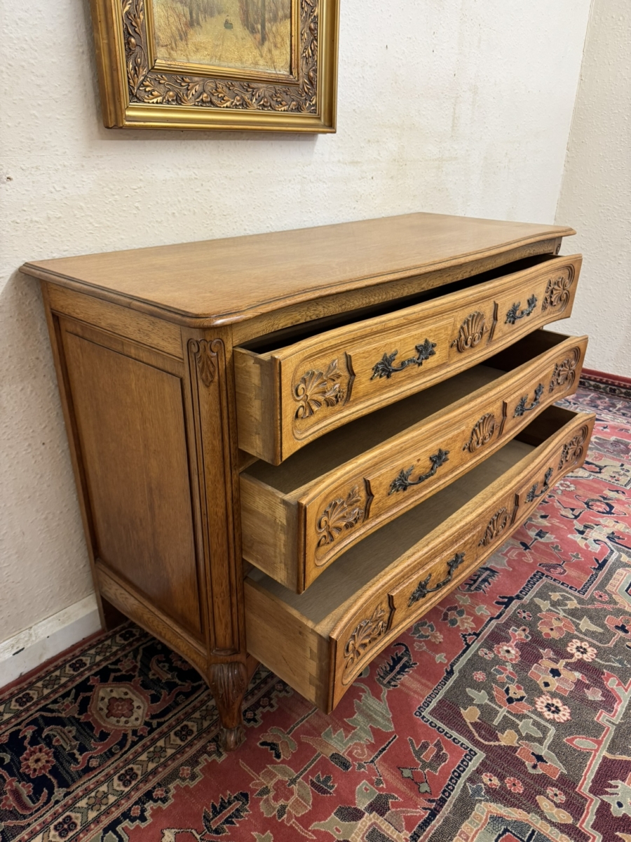 This fine quality antique French oak chest of drawers dates circa 1920 and is in excellent condition. The shaped over sailing top sits above three carved serpentine shaped drawers, each drawer has a pair of ornate brass handles. Fielded panelled sides, shaped skirt with decorative central carving and standing on two carved cabriole shaped legs to the front.