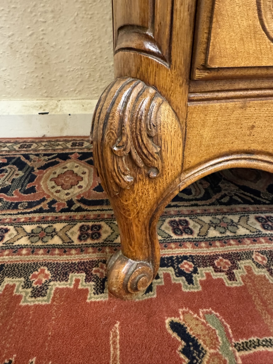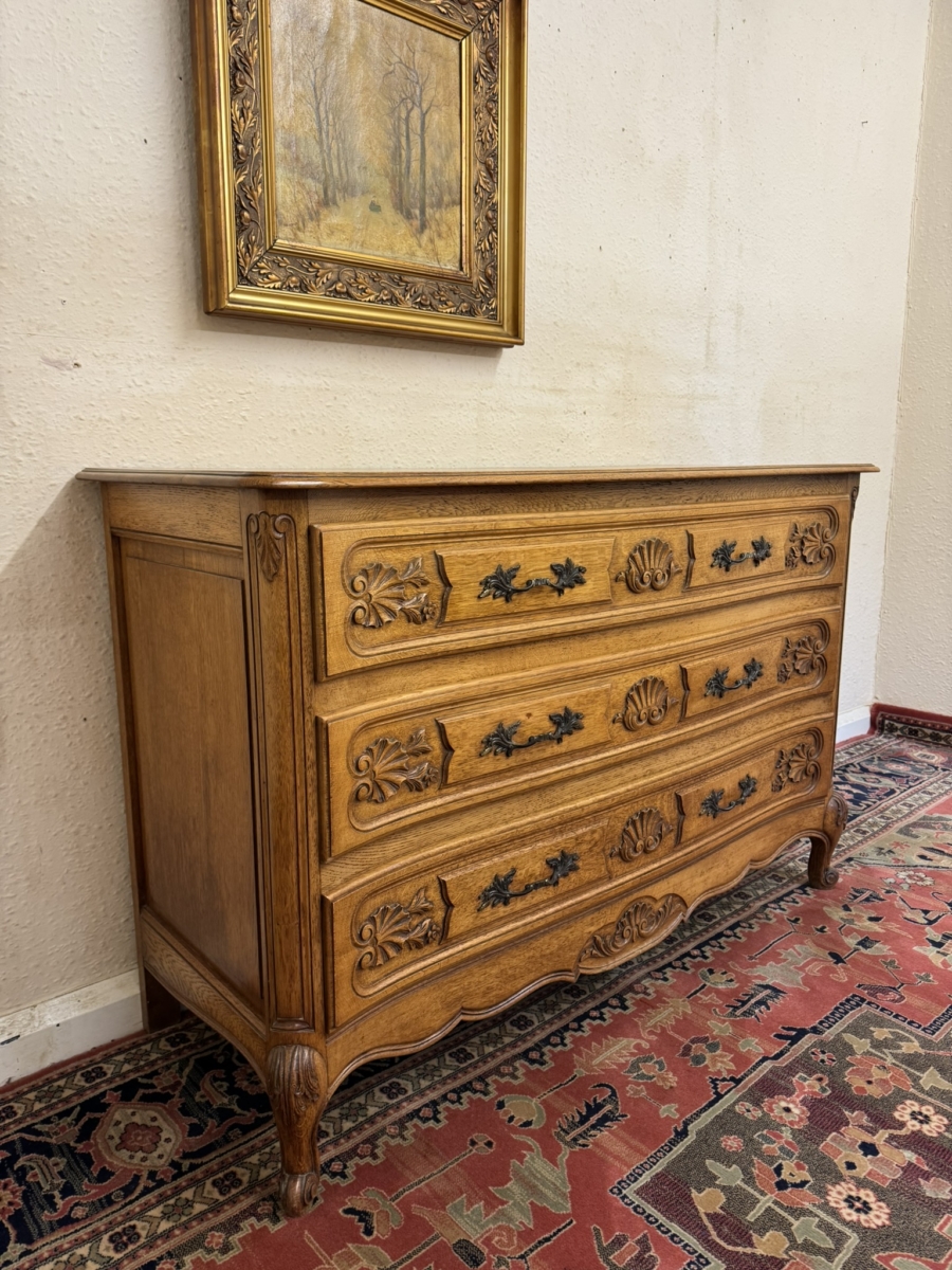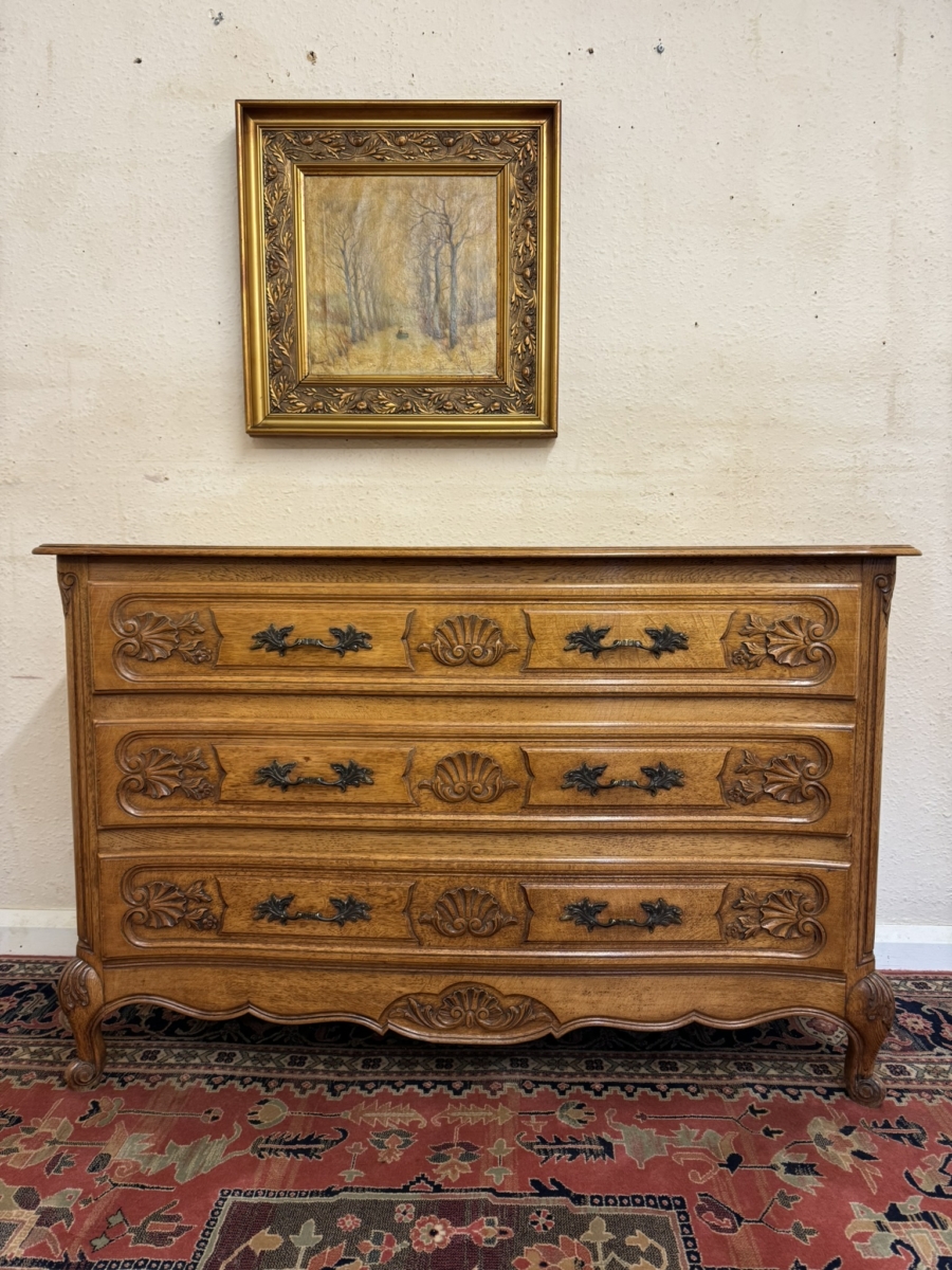 This fine quality antique French oak chest of drawers dates circa 1920 and is in excellent condition. The shaped over sailing top sits above three carved serpentine shaped drawers, each drawer has a pair of ornate brass handles. Fielded panelled sides, shaped skirt with decorative central carving and standing on two carved cabriole shaped legs to the front.