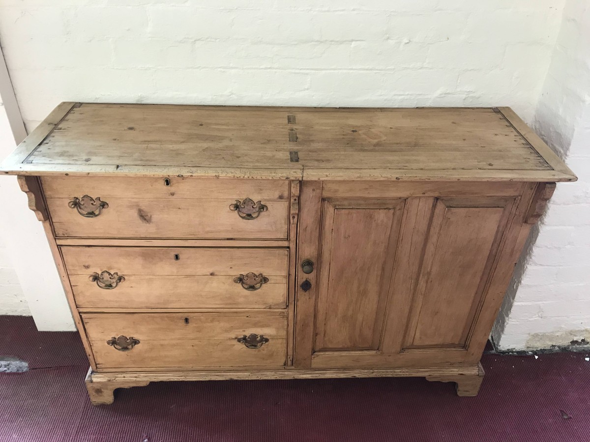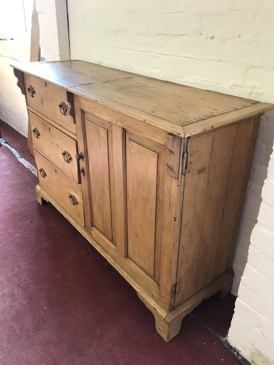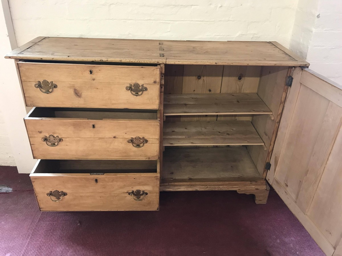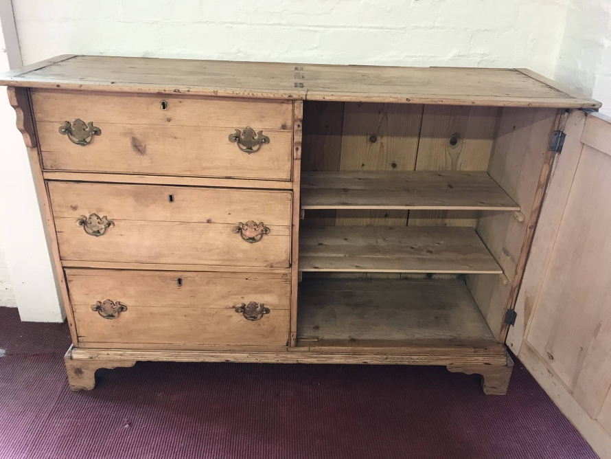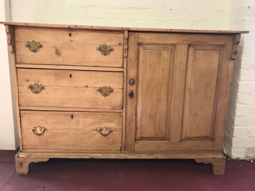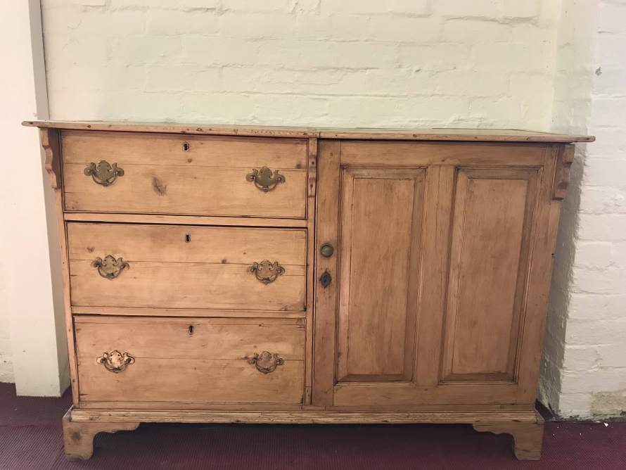 A great pine cupboard which offers ample storage. The three drawers each have a pair of brass handles, to the right is a lockable cupboard door which as a brass knob handle the door opens to reveal to removable shelves. The cabinet stands on four bracket feet. A functional antique item of pine furniture.