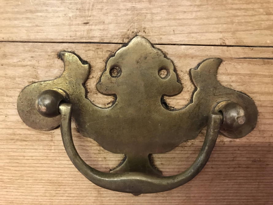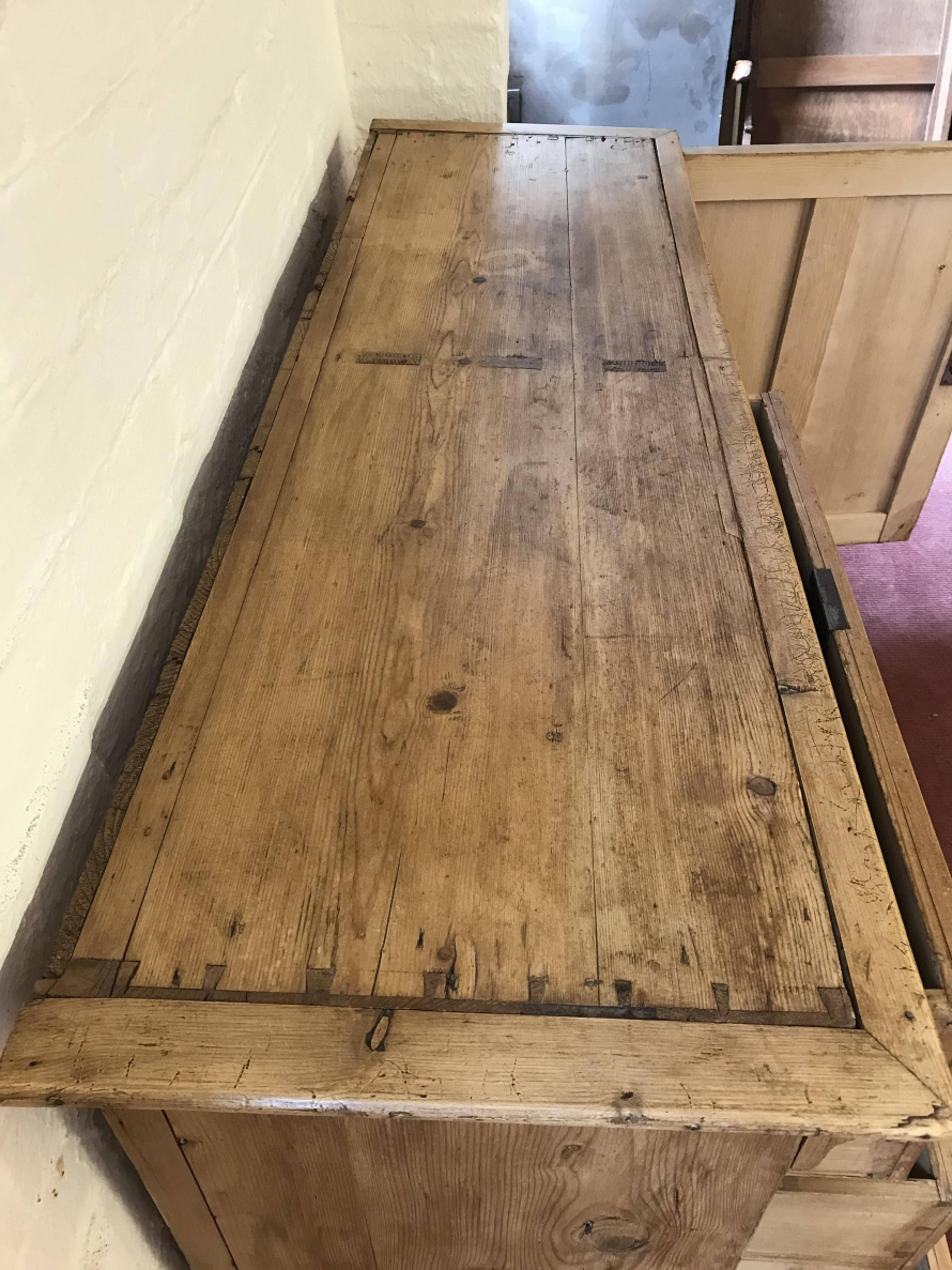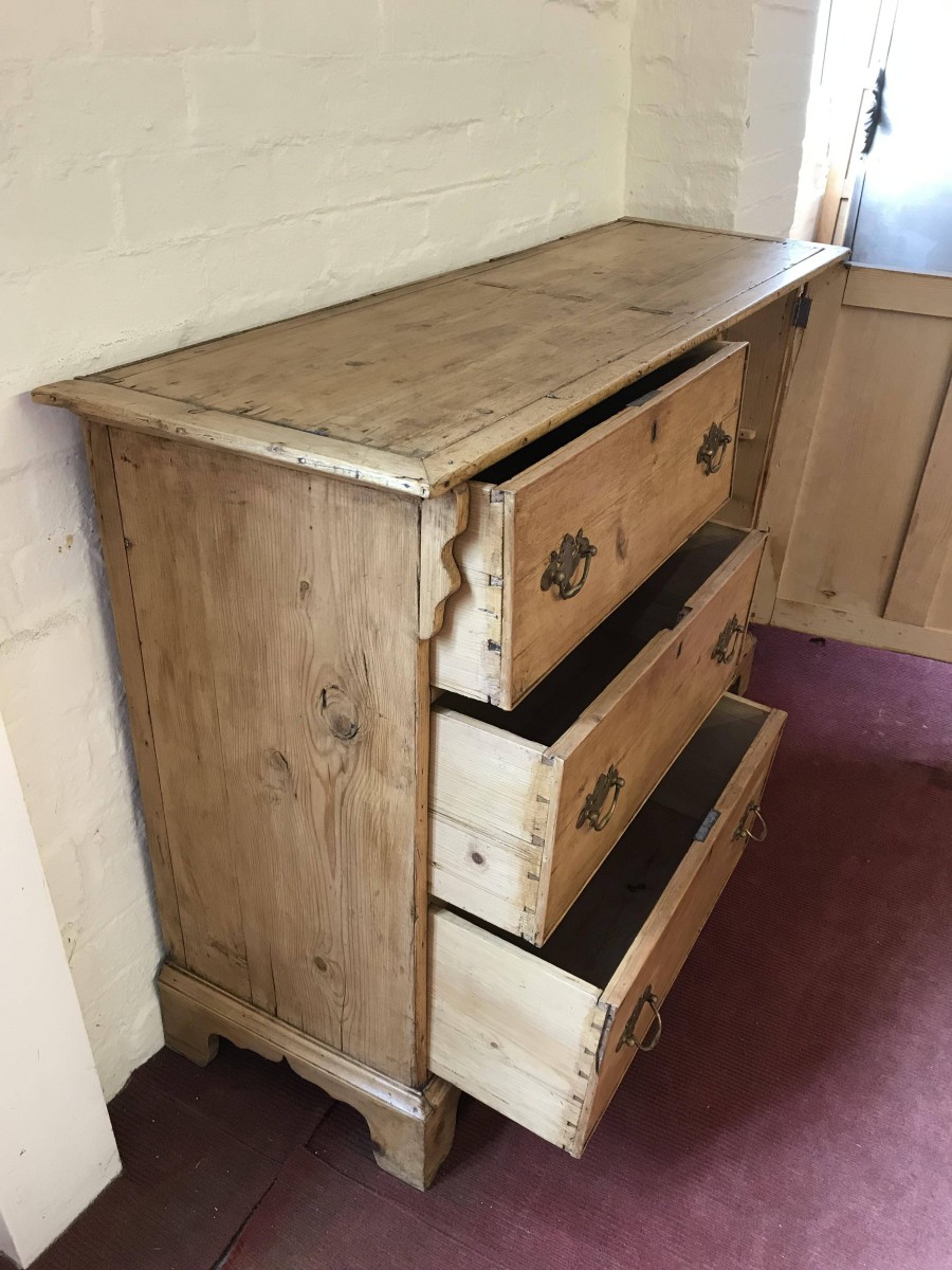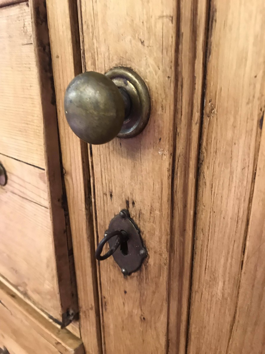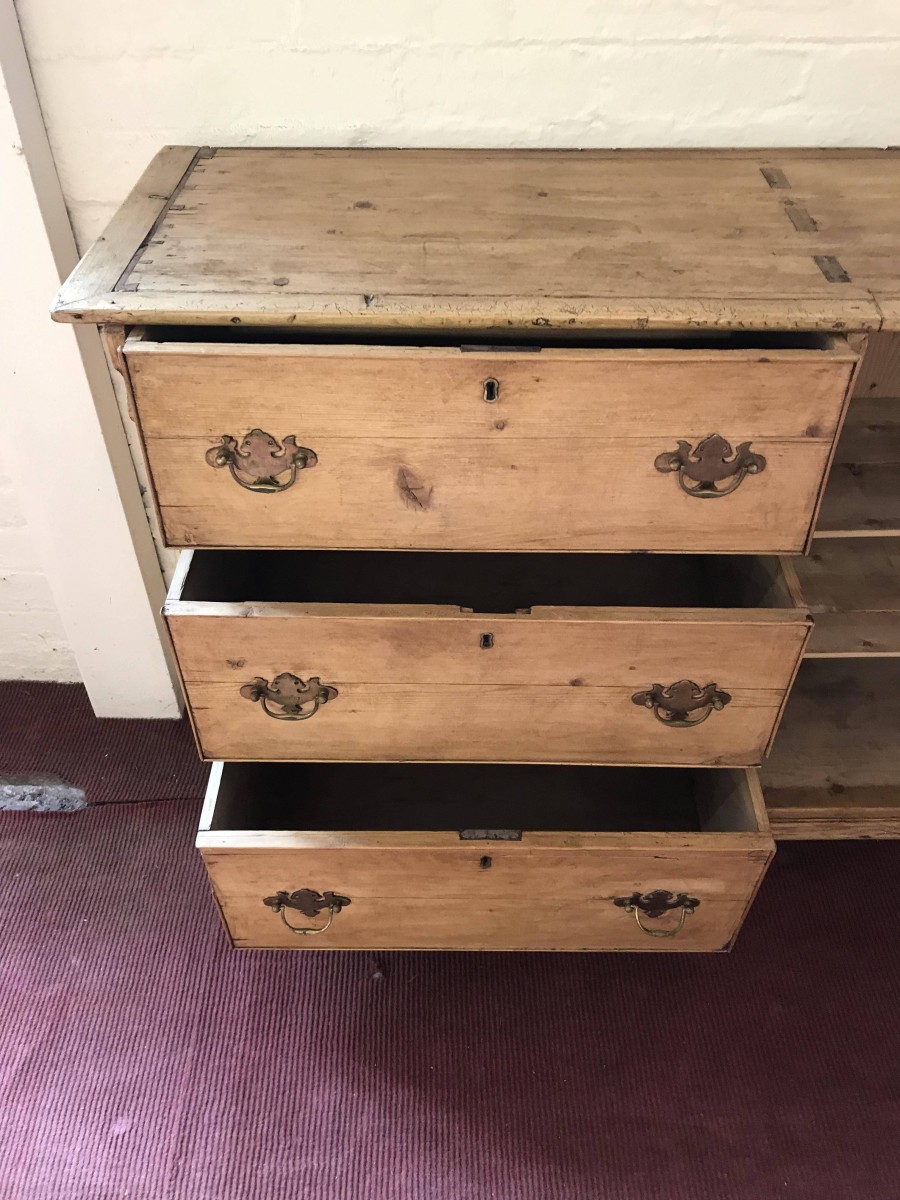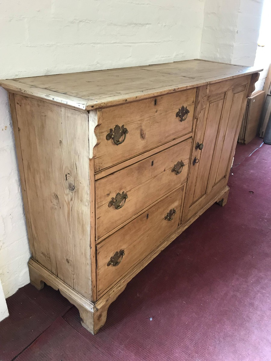 A great pine cupboard which offers ample storage. The three drawers each have a pair of brass handles, to the right is a lockable cupboard door which as a brass knob handle the door opens to reveal to removable shelves. The cabinet stands on four bracket feet. A functional antique item of pine furniture.