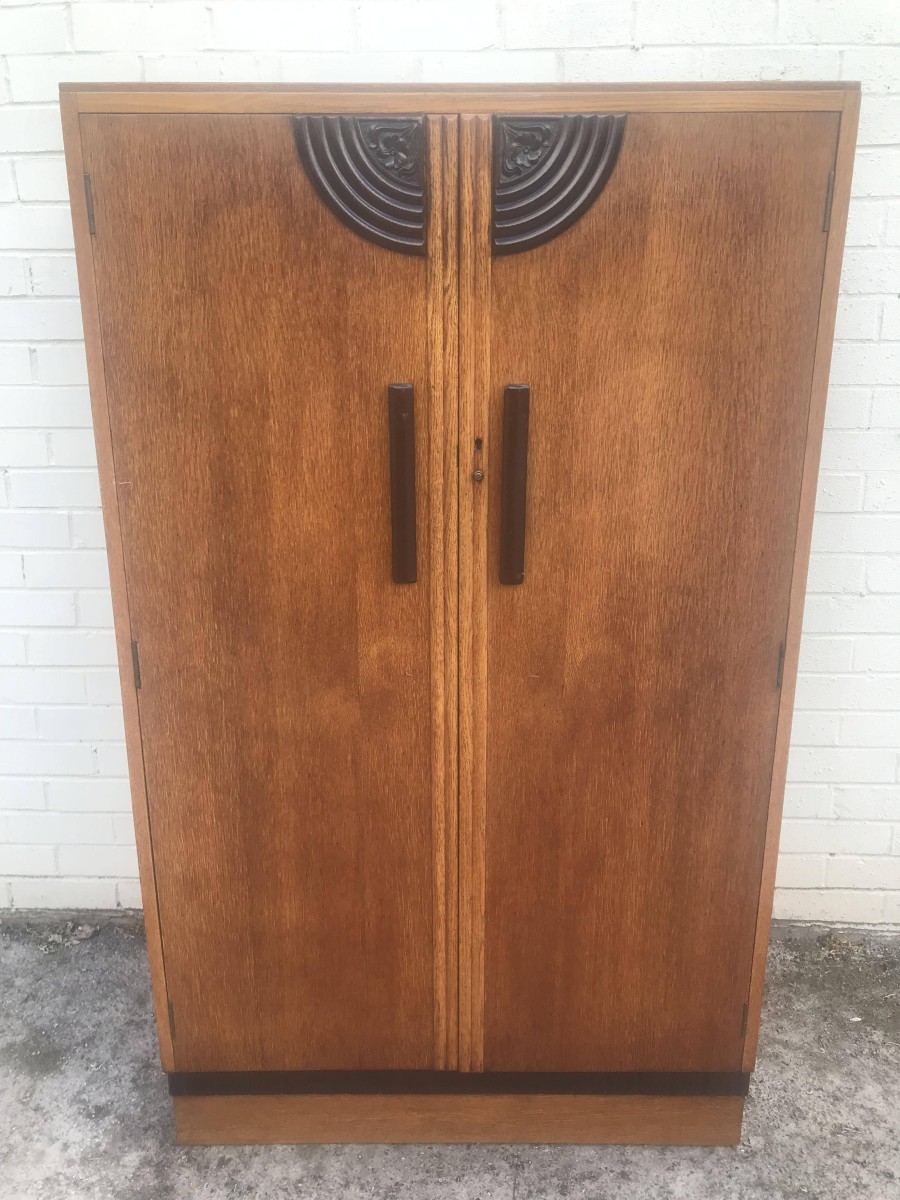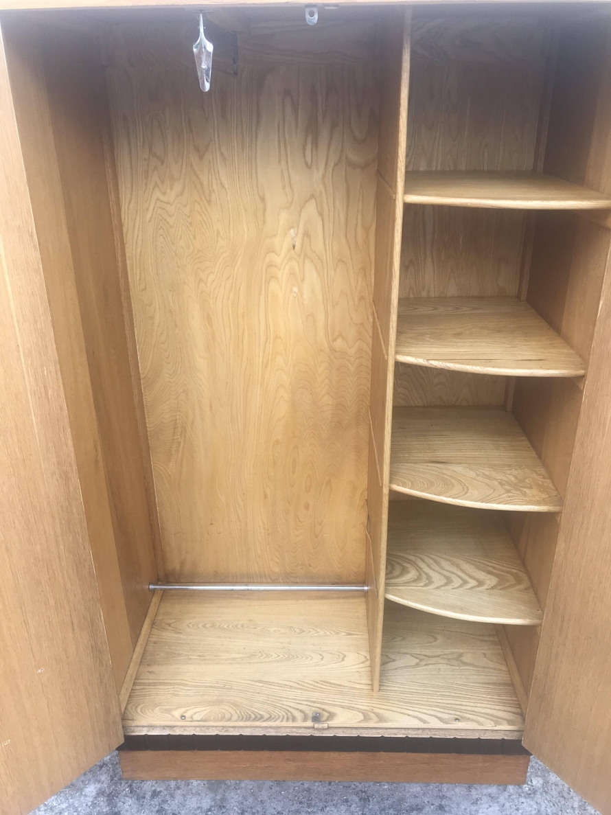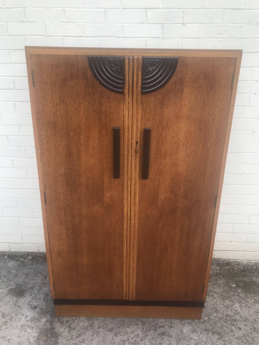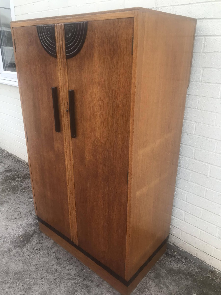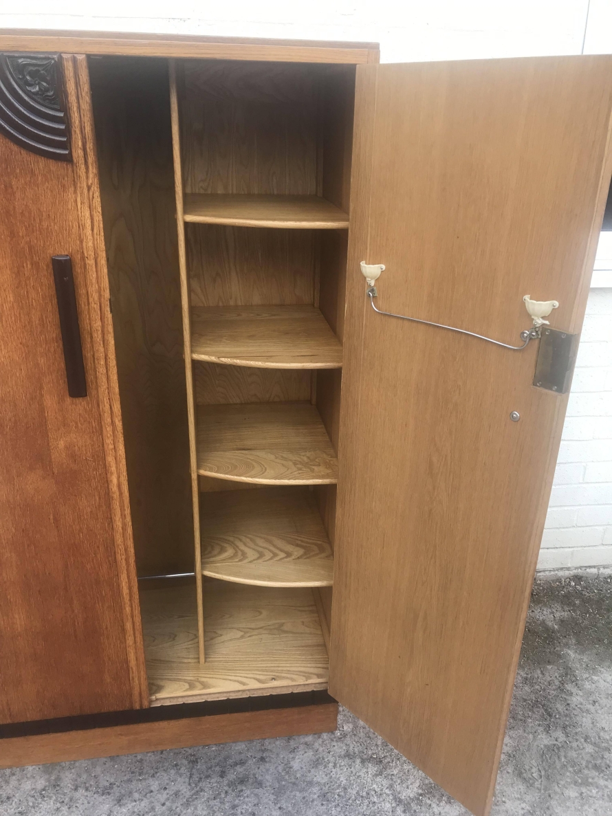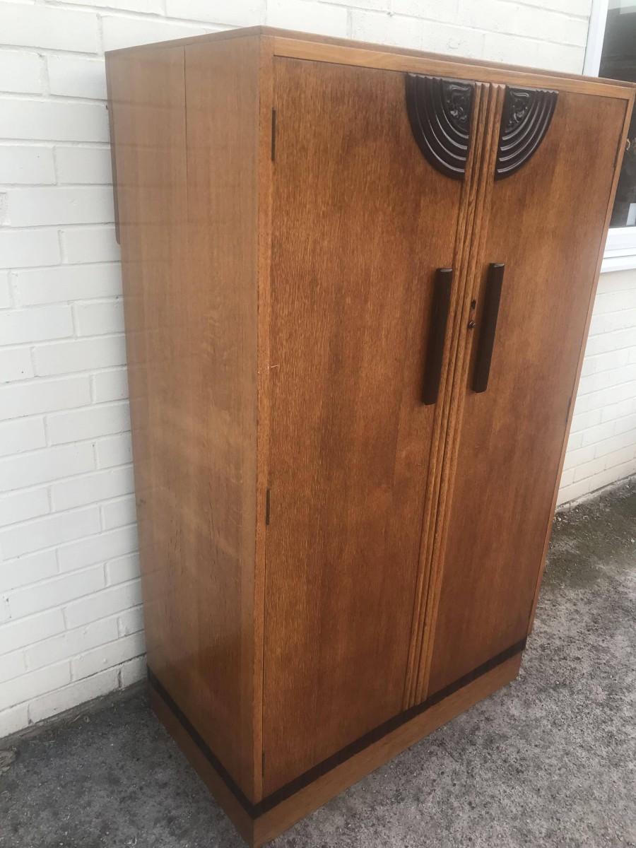 A fantastic stylish Art Deco fitted gentleman's wardrobe which is in excellent condition. To the top of the doors is walnut decoration, black handles and a decorative walnut above the plinth base. The right hand door opens to reveal shelving and a tie hanger on the back of the door, the left hand door opens to reveal a hanging rail.