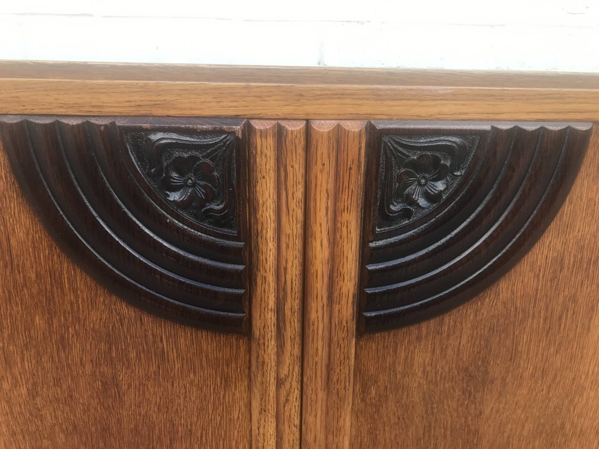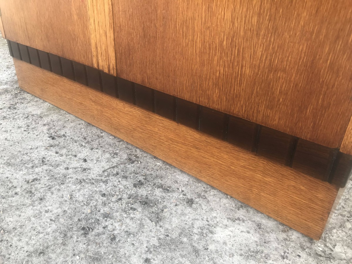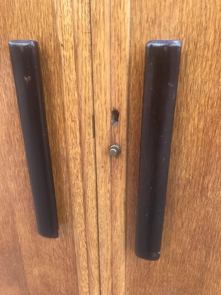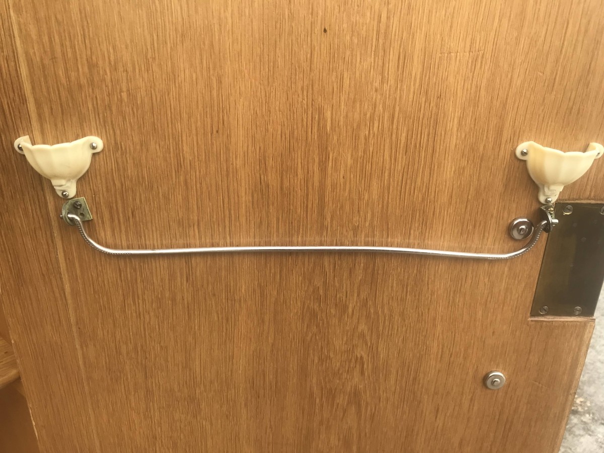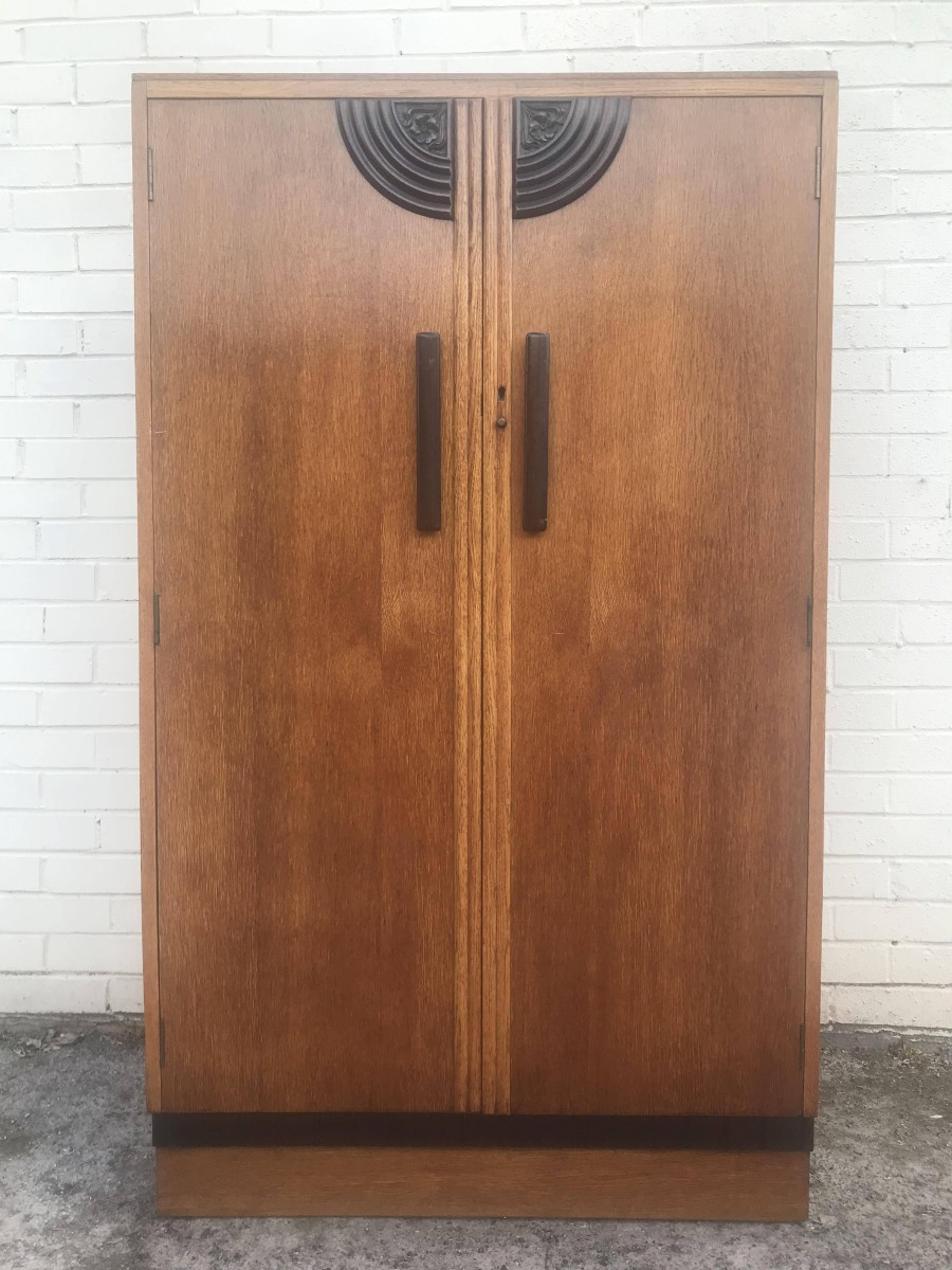 A fantastic stylish Art Deco fitted gentleman's wardrobe which is in excellent condition. To the top of the doors is walnut decoration, black handles and a decorative walnut above the plinth base. The right hand door opens to reveal shelving and a tie hanger on the back of the door, the left hand door opens to reveal a hanging rail.
