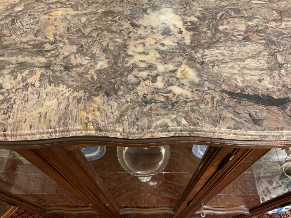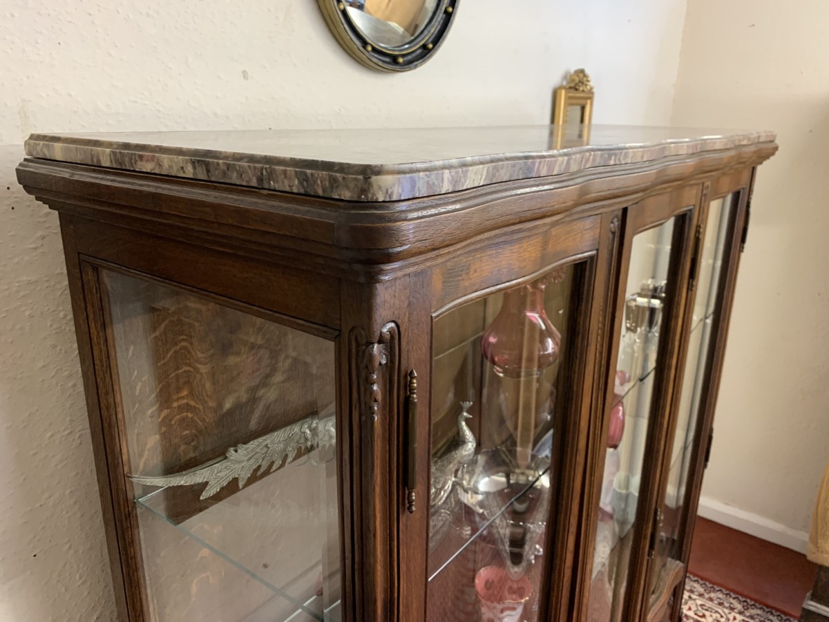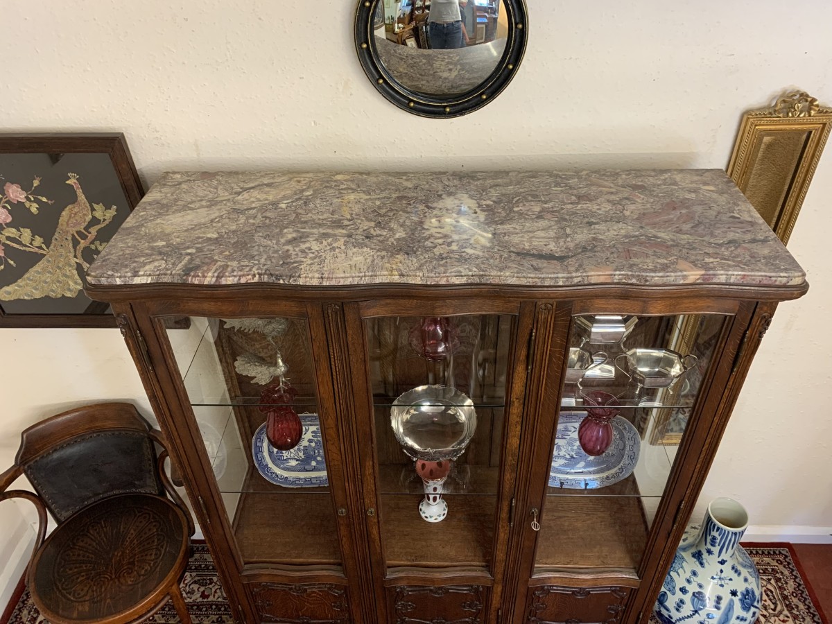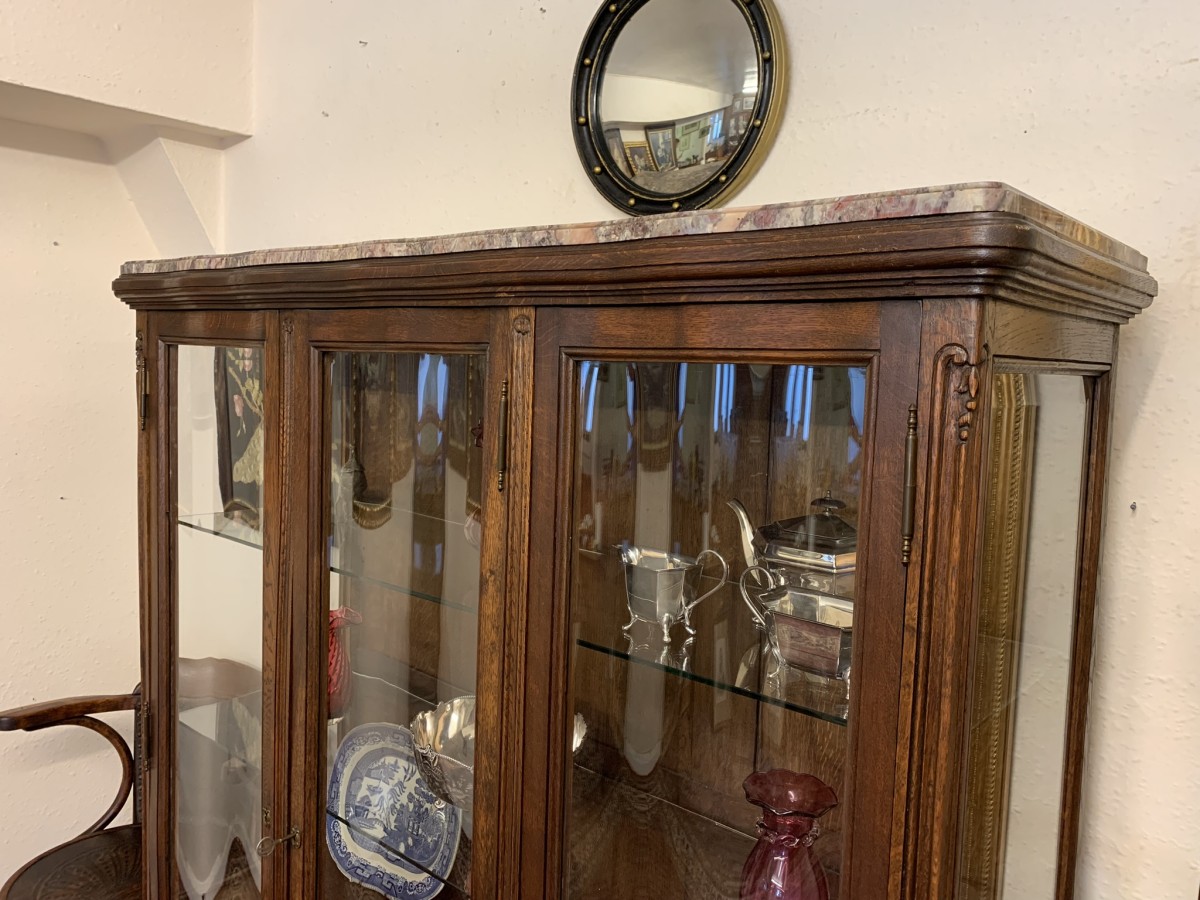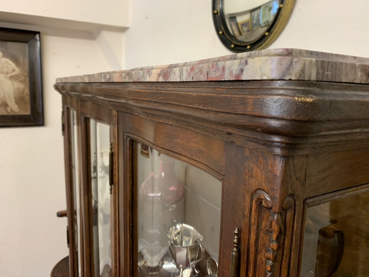 The French cabinet dates circa 1920. Having a shaped marble top which sits above three lockable doors, each door having curved glass with a shaped carved panel below. The doors open to reveal two glass shelves and a wooden shelf. Glass sides with a recessed panel below, ornate carved skirt this beautiful cabinet stands on six carved cabriole shaped legs.