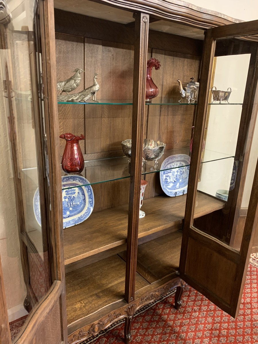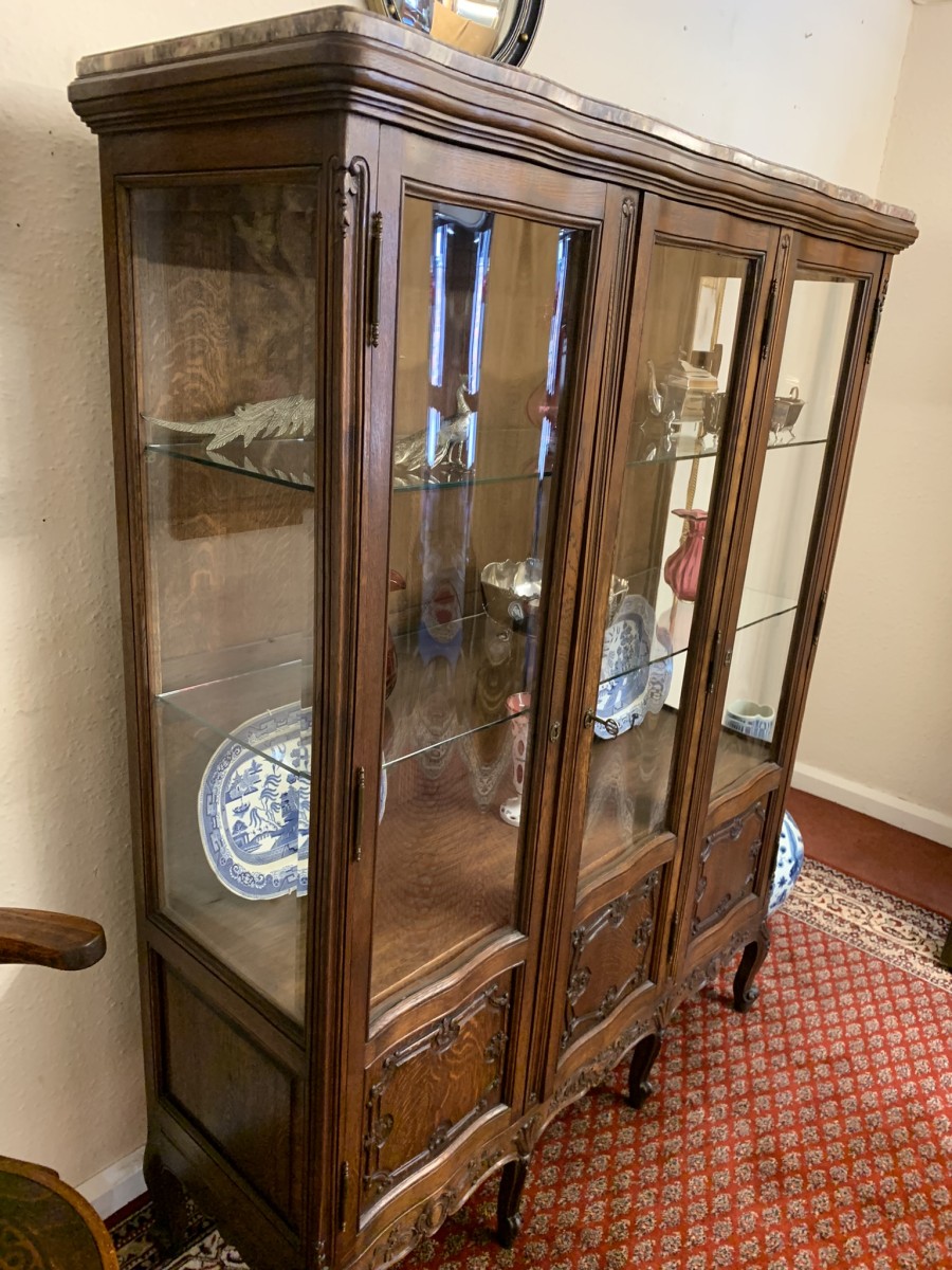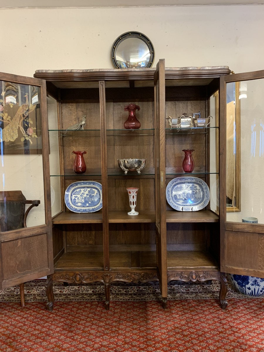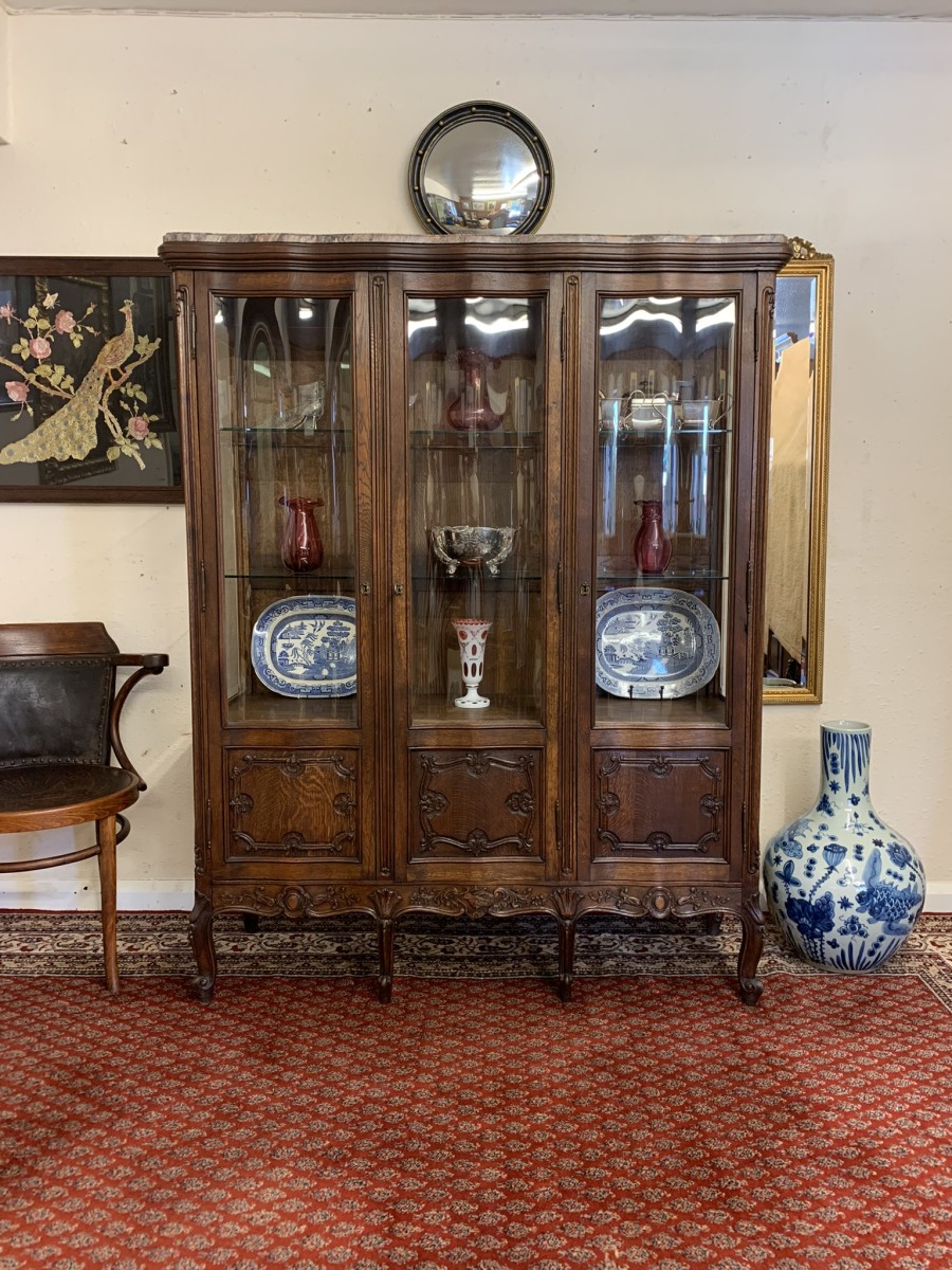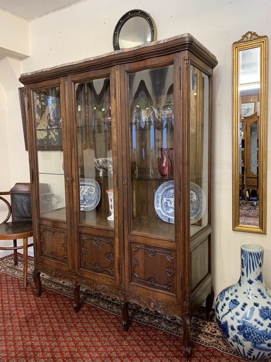 The French cabinet dates circa 1920. Having a shaped marble top which sits above three lockable doors, each door having curved glass with a shaped carved panel below. The doors open to reveal two glass shelves and a wooden shelf. Glass sides with a recessed panel below, ornate carved skirt this beautiful cabinet stands on six carved cabriole shaped legs.