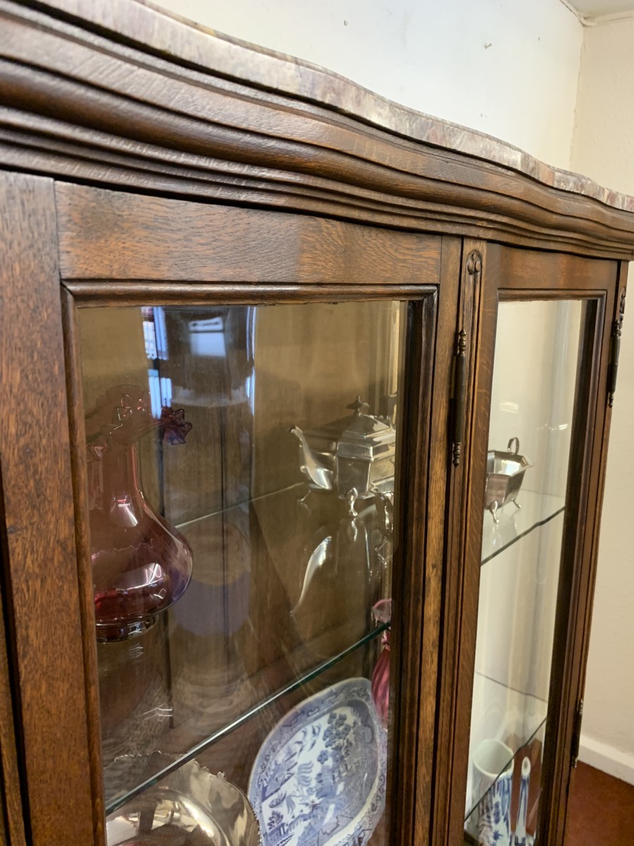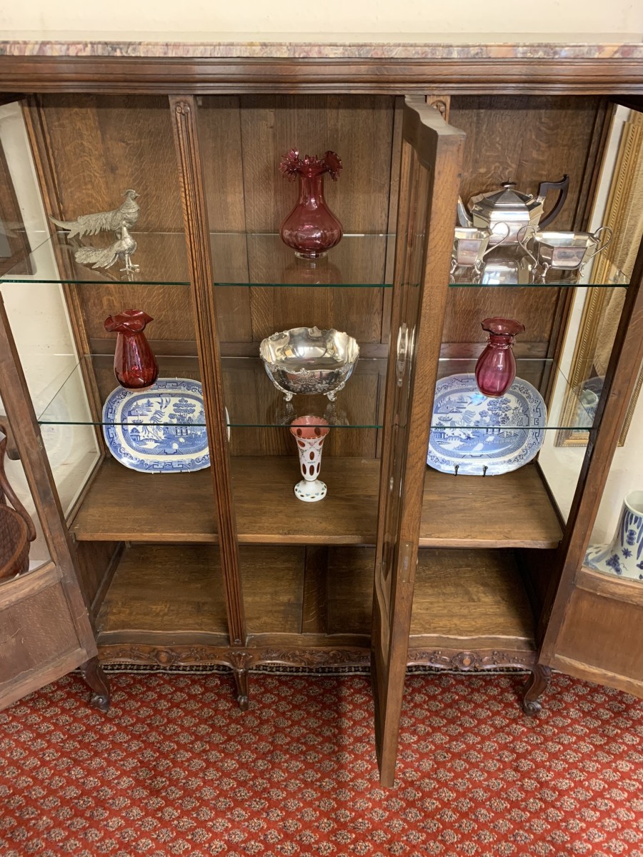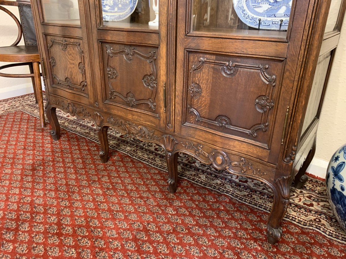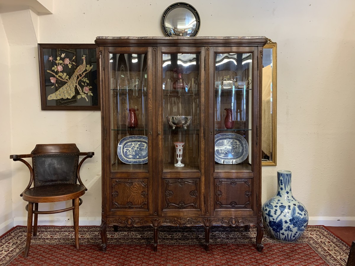 The French cabinet dates circa 1920. Having a shaped marble top which sits above three lockable doors, each door having curved glass with a shaped carved panel below. The doors open to reveal two glass shelves and a wooden shelf. Glass sides with a recessed panel below, ornate carved skirt this beautiful cabinet stands on six carved cabriole shaped legs.