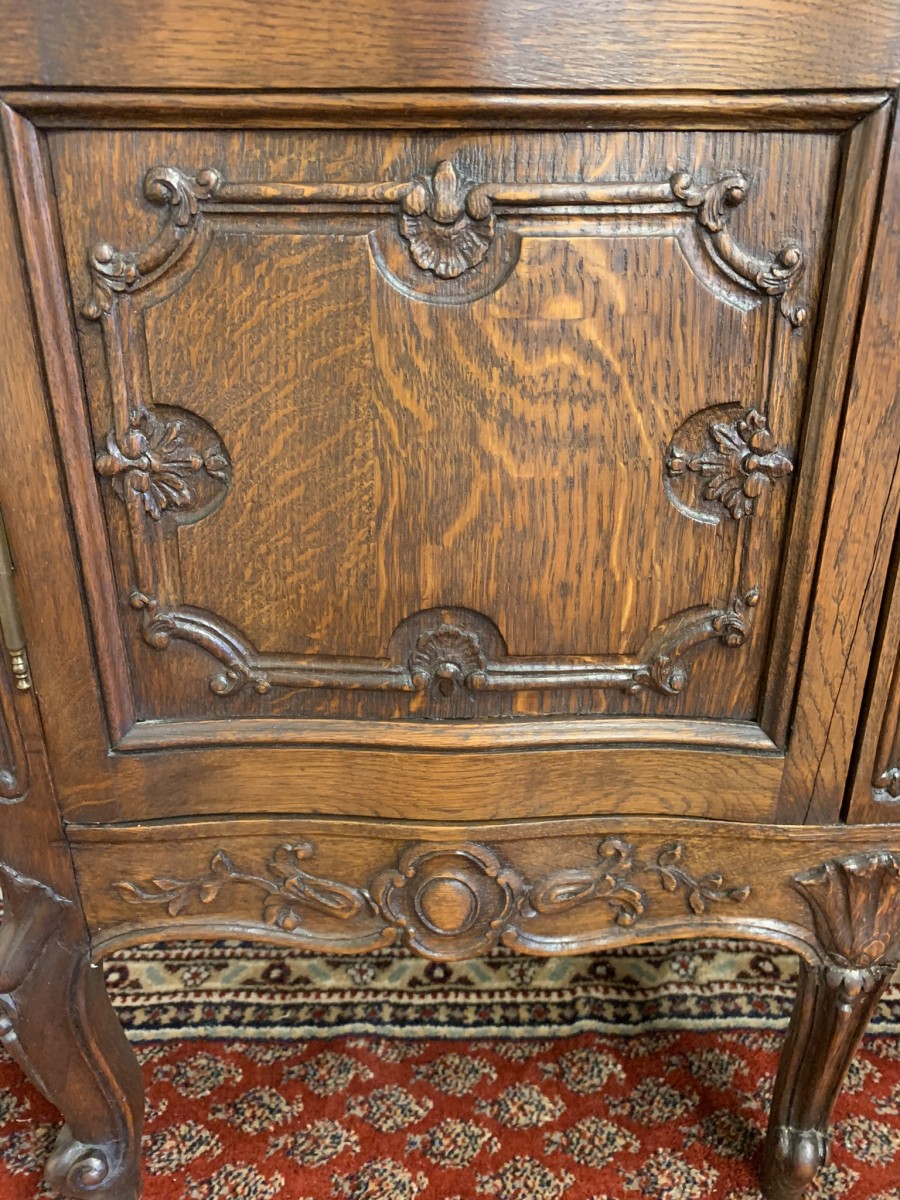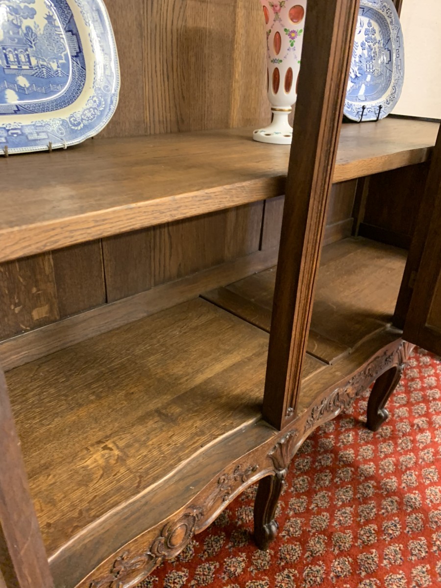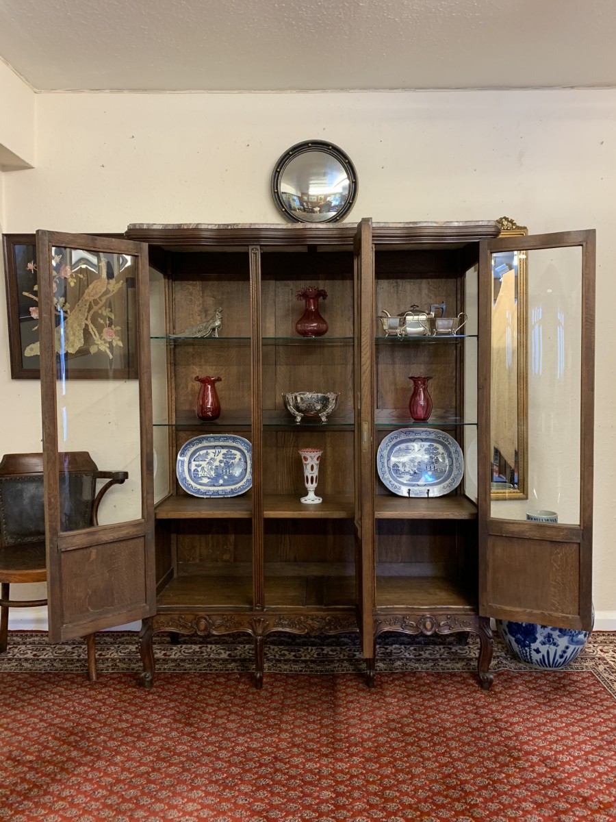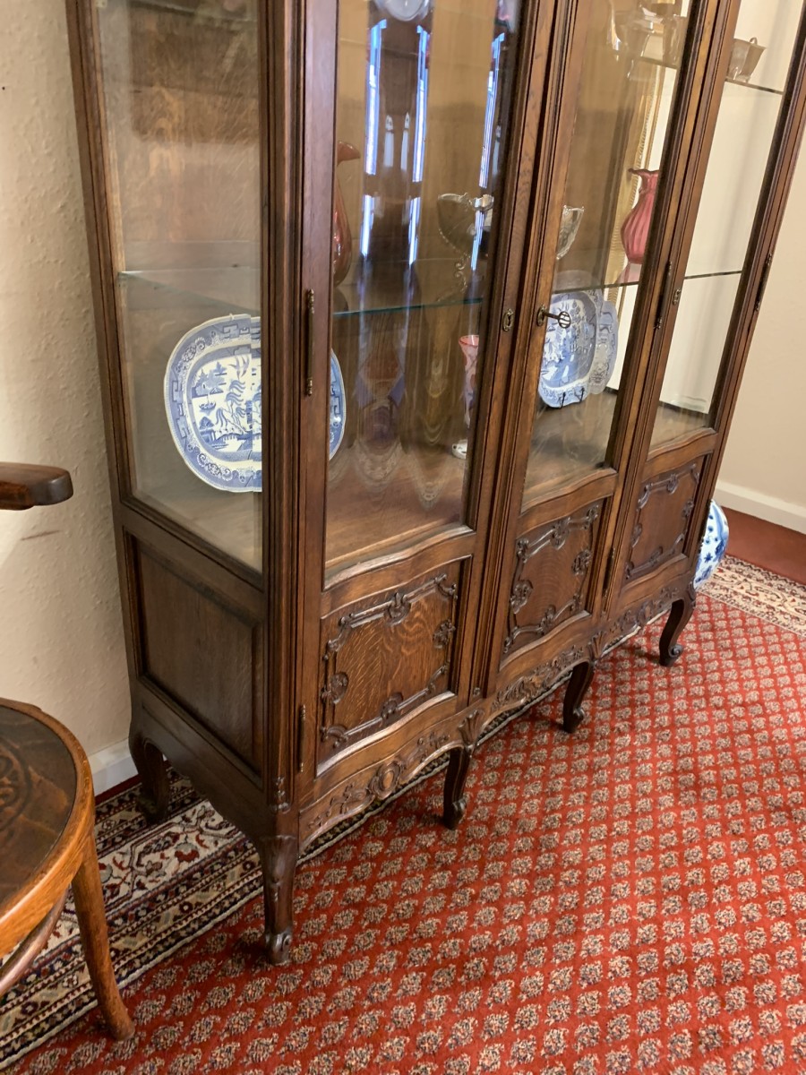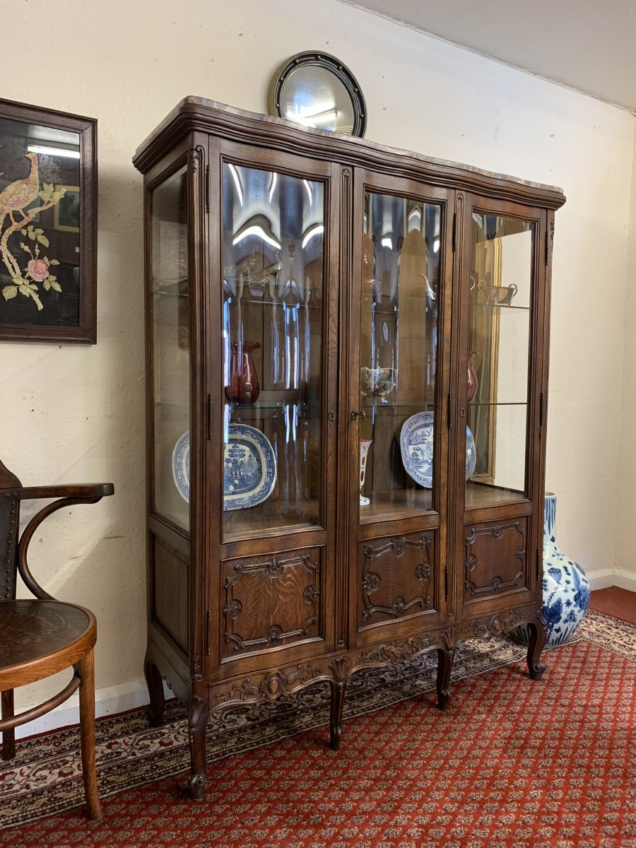 The French cabinet dates circa 1920. Having a shaped marble top which sits above three lockable doors, each door having curved glass with a shaped carved panel below. The doors open to reveal two glass shelves and a wooden shelf. Glass sides with a recessed panel below, ornate carved skirt this beautiful cabinet stands on six carved cabriole shaped legs.