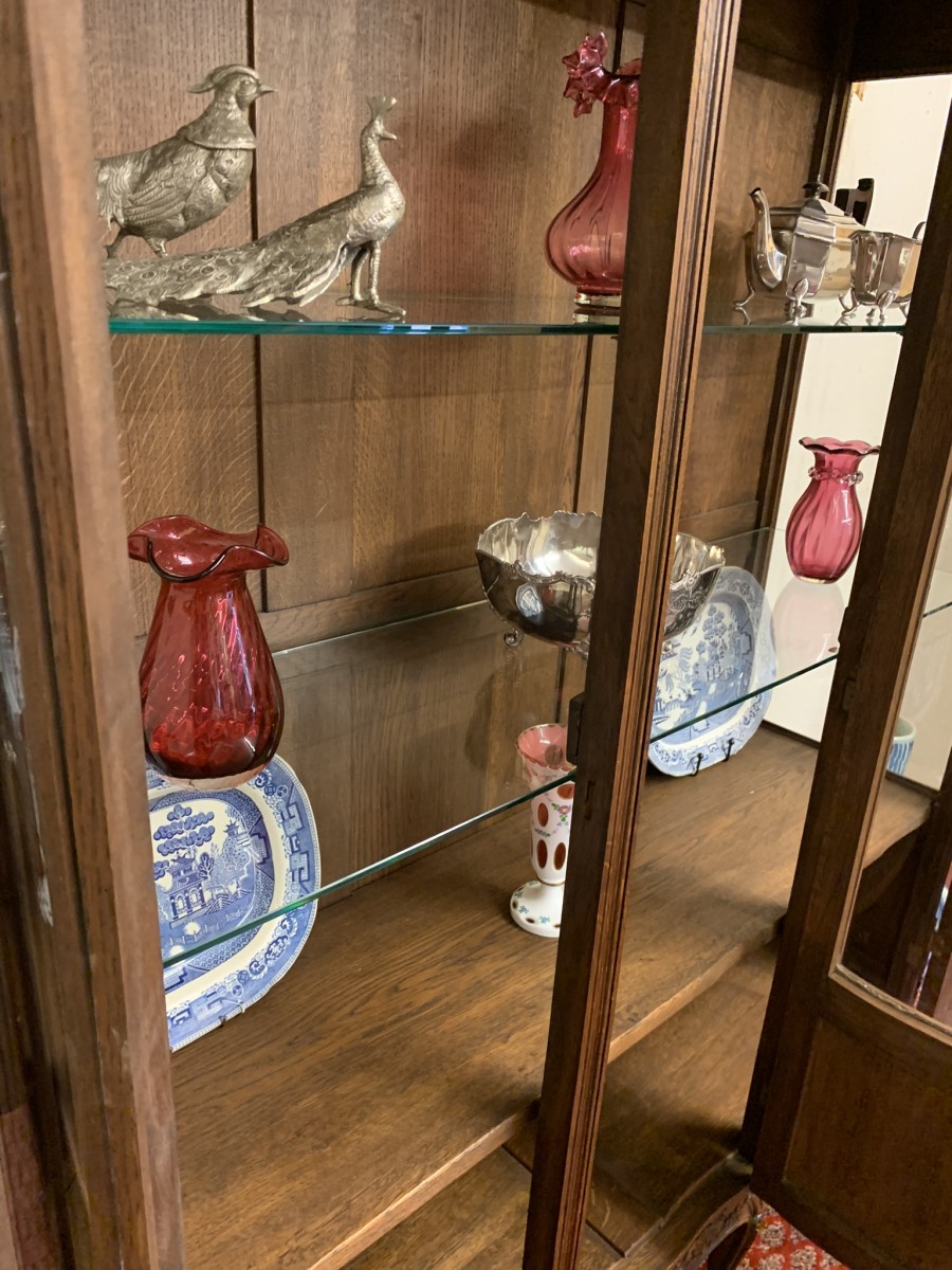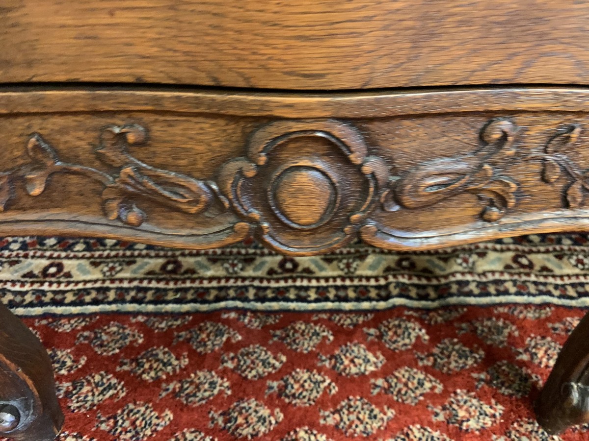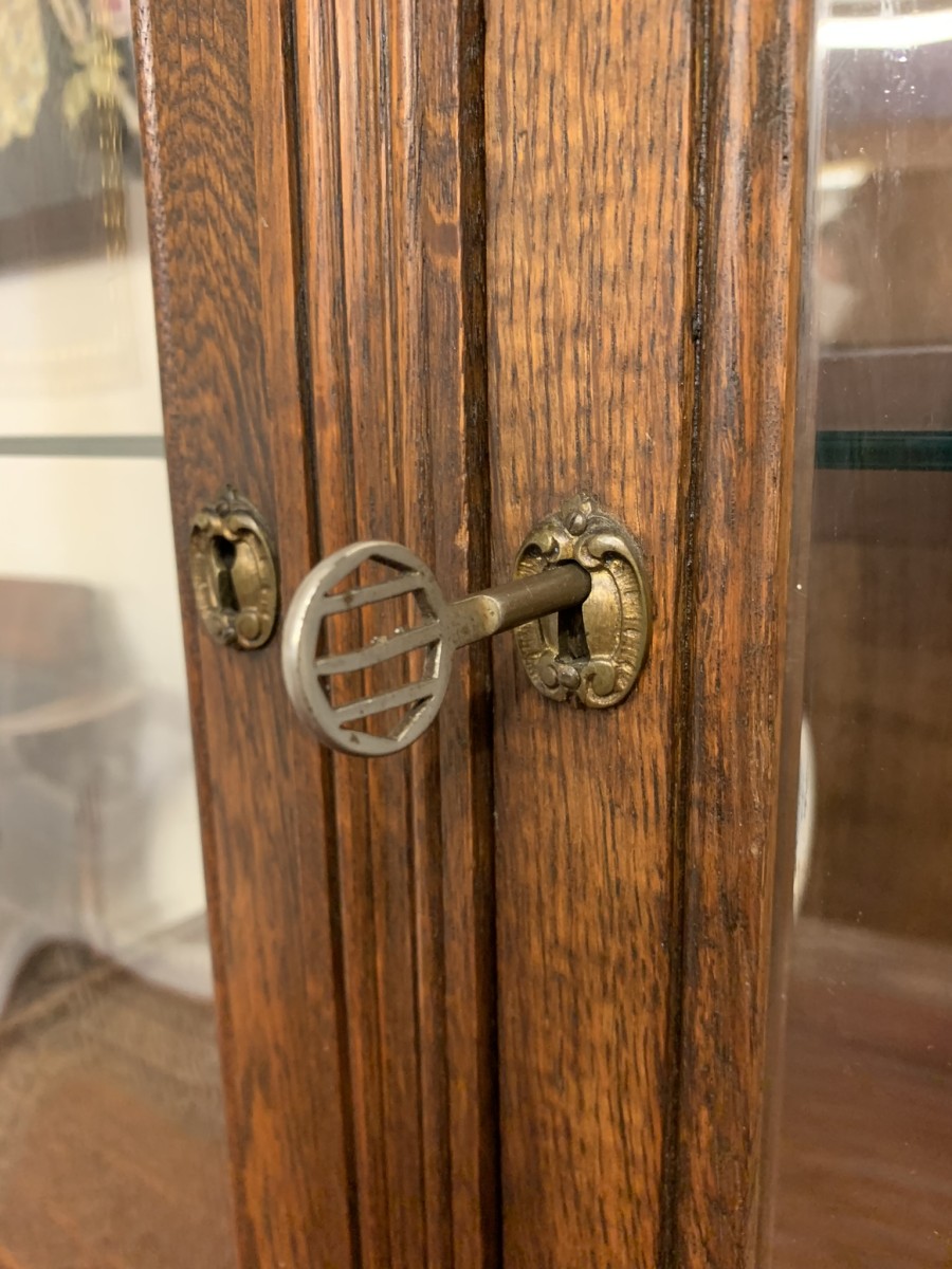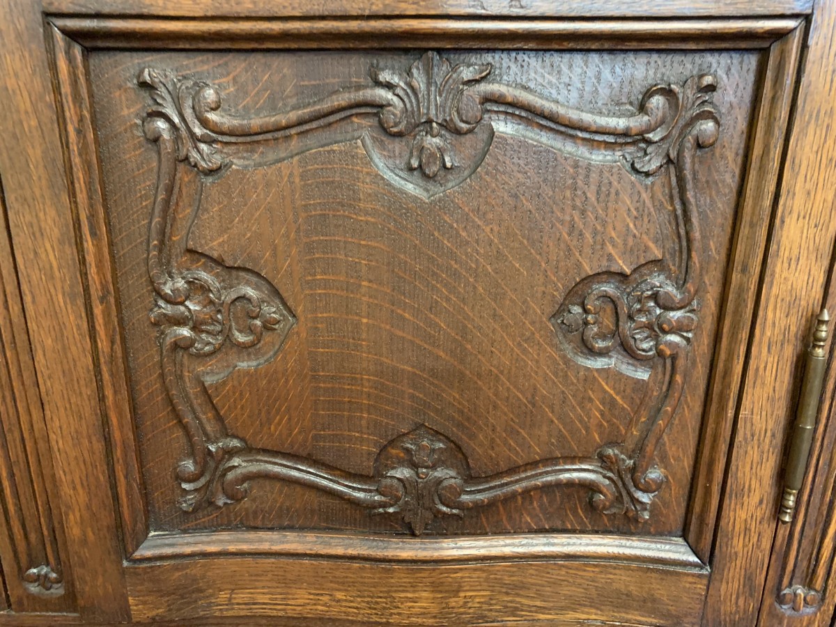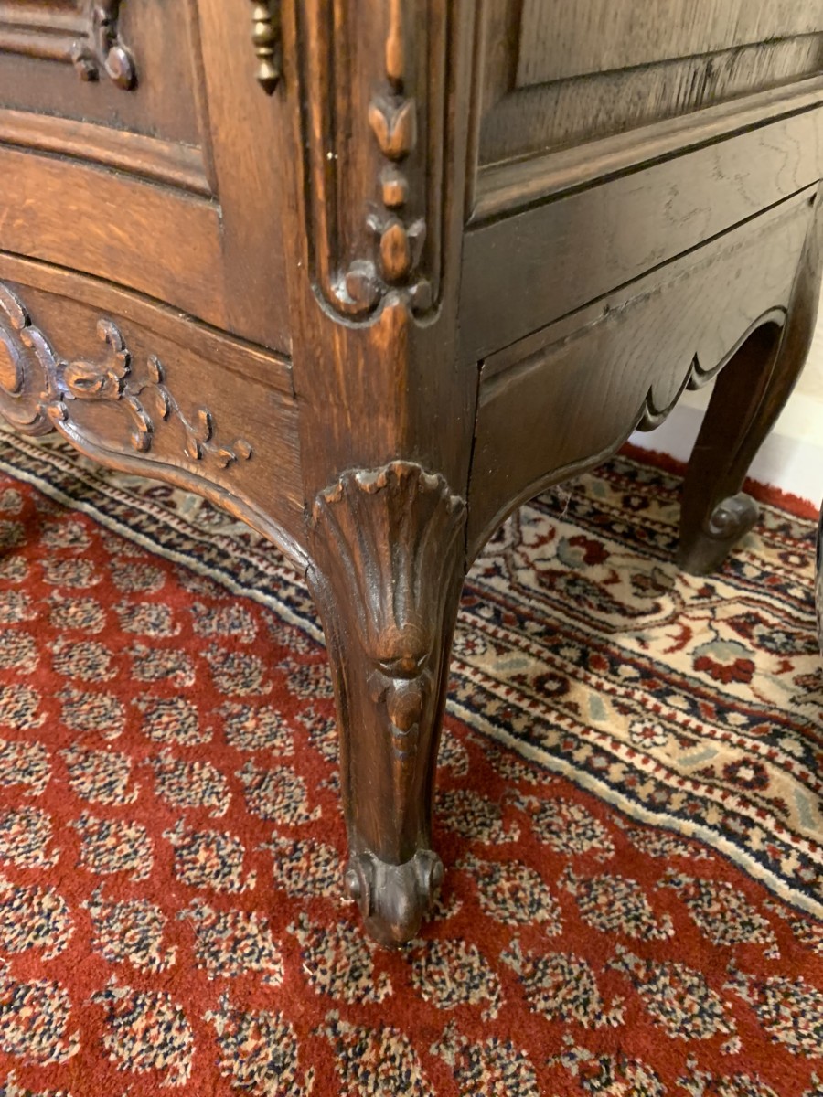 The French cabinet dates circa 1920. Having a shaped marble top which sits above three lockable doors, each door having curved glass with a shaped carved panel below. The doors open to reveal two glass shelves and a wooden shelf. Glass sides with a recessed panel below, ornate carved skirt this beautiful cabinet stands on six carved cabriole shaped legs.