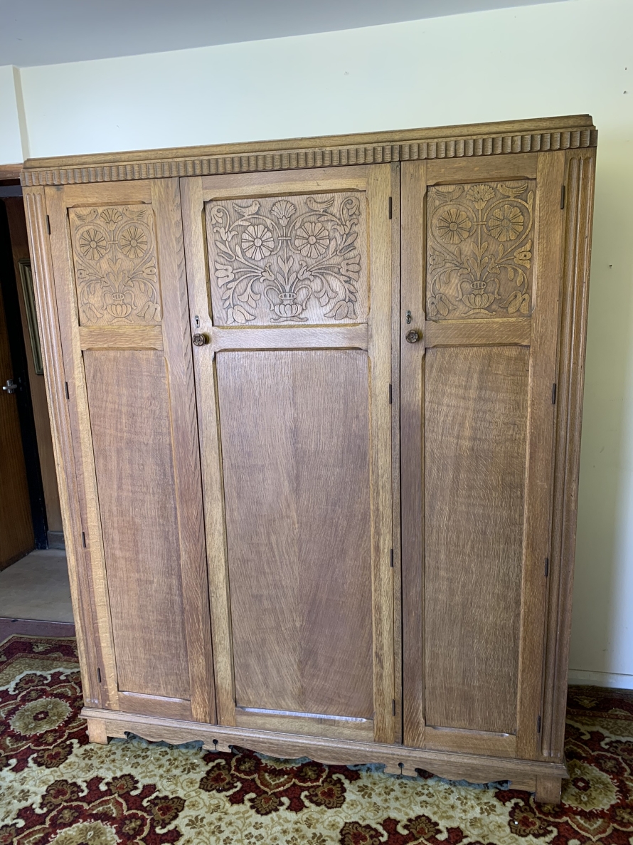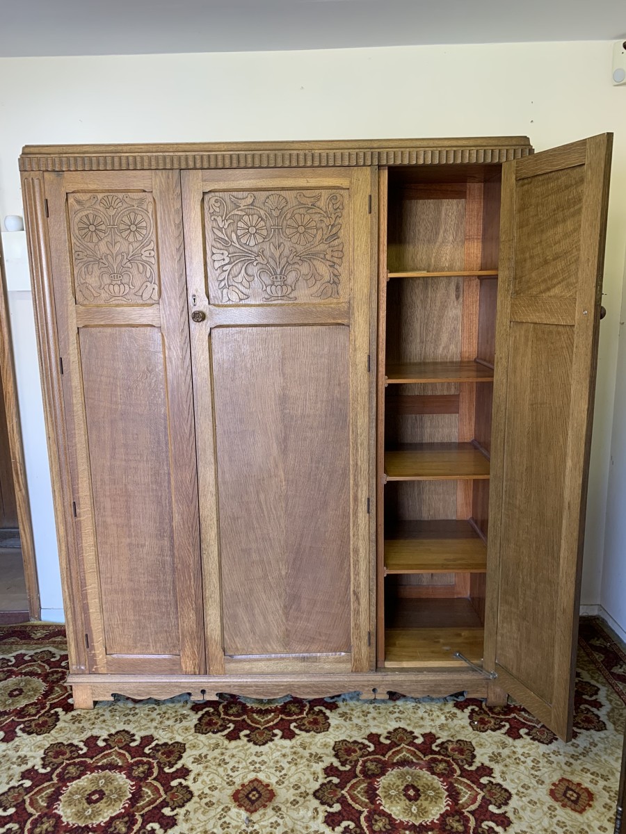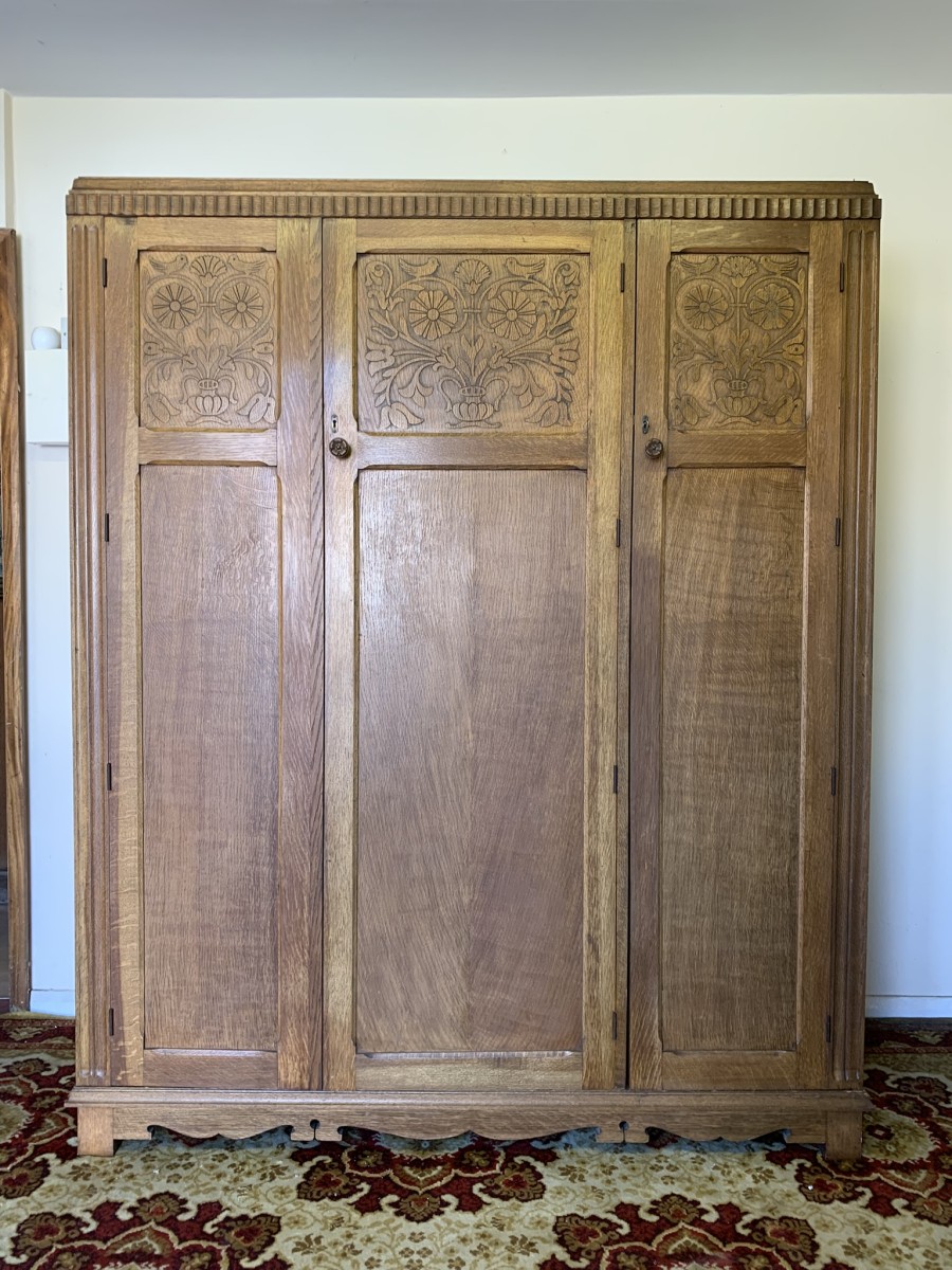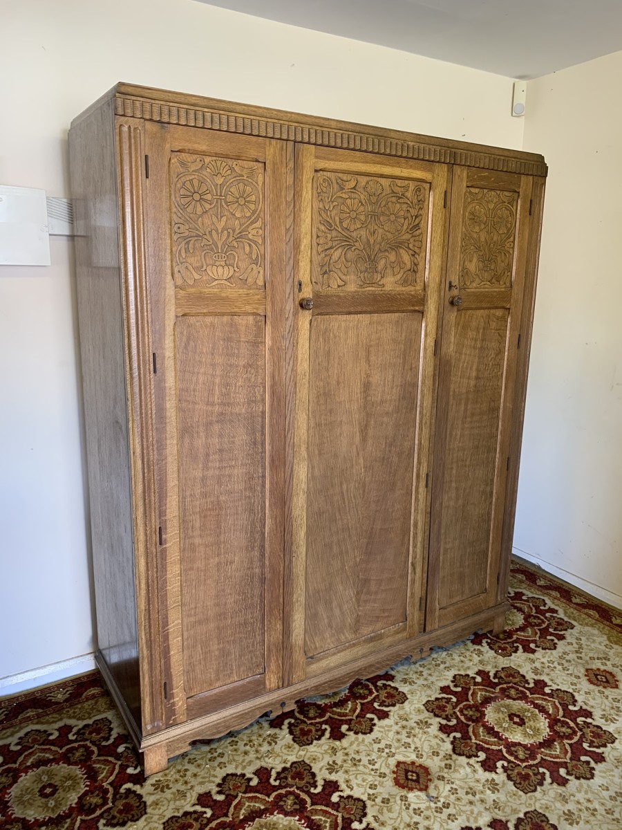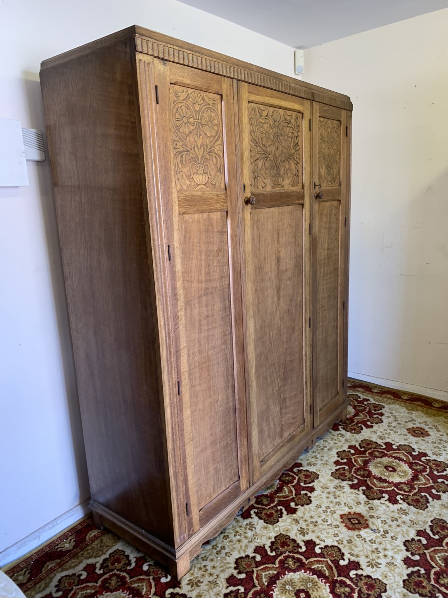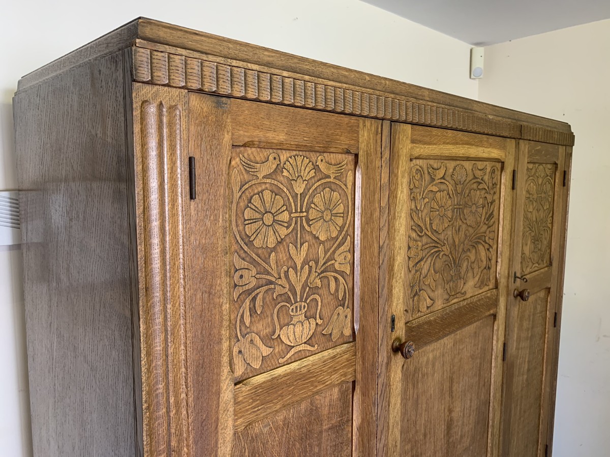 This beautiful wardrobe made with glorious solid oak dates circa 1930. The three lockable doors each have a top carved recessed panel in the William Morris style depicting flora and forna. The left-hand door and central door open to reveal a shelf above a brass hanging rail, brass hooks and a shoe rail to the bottom. The right-hand door opens to reveal four fixed shelves. The base having arts and crafts carving to the skirt. Please note this wardrobe splits down for easy transportation and delivery.
