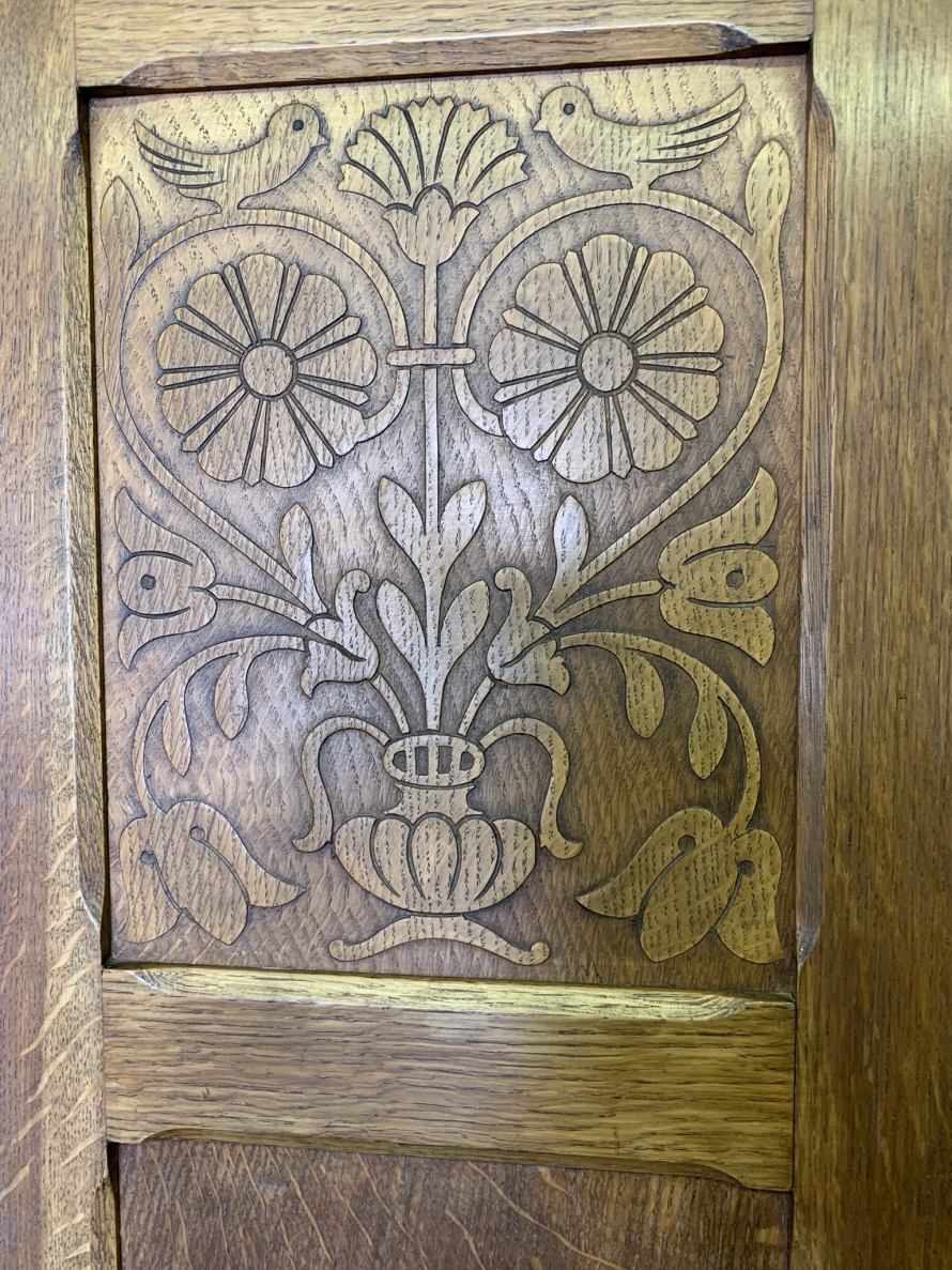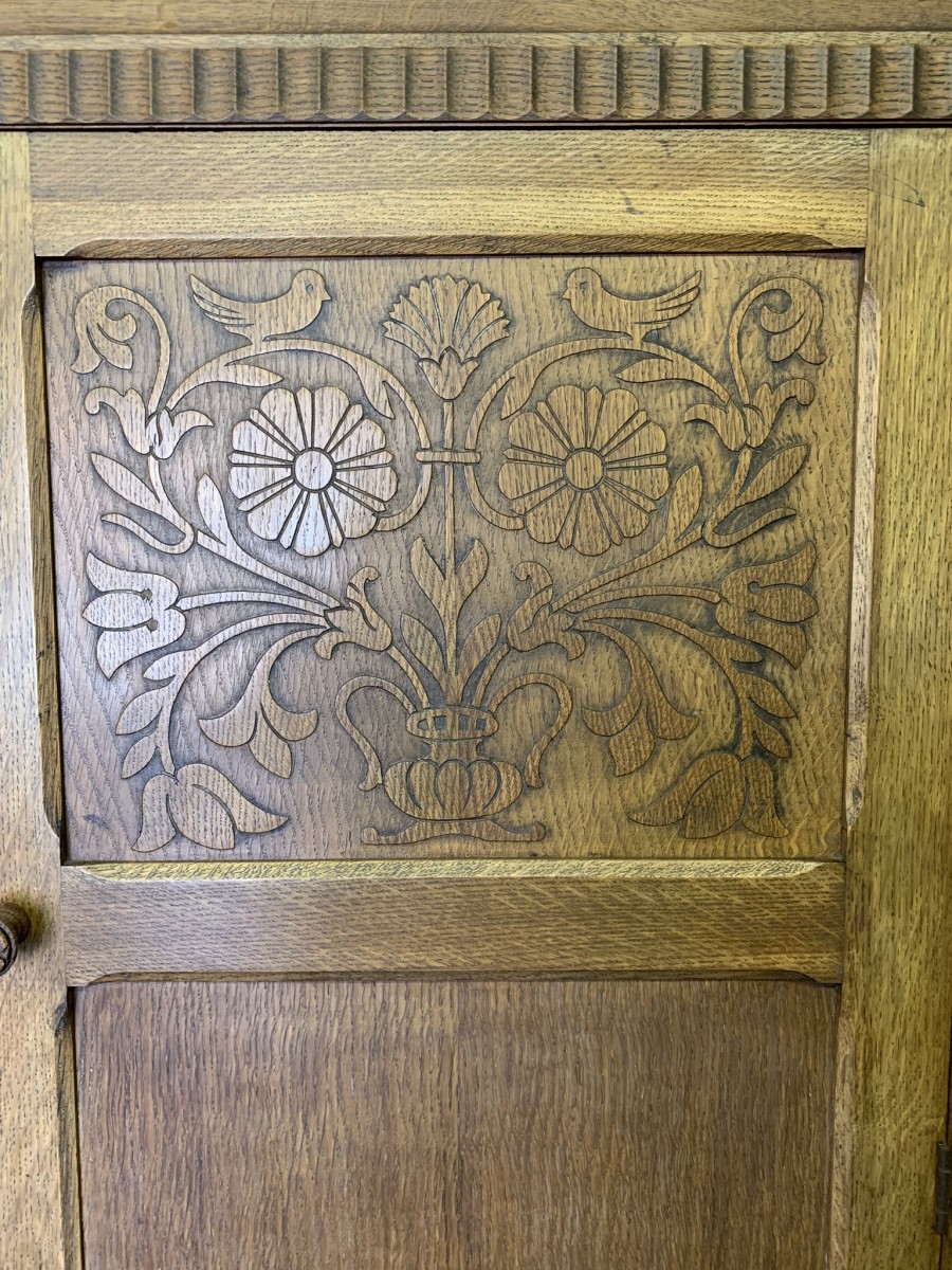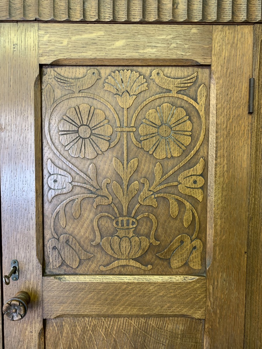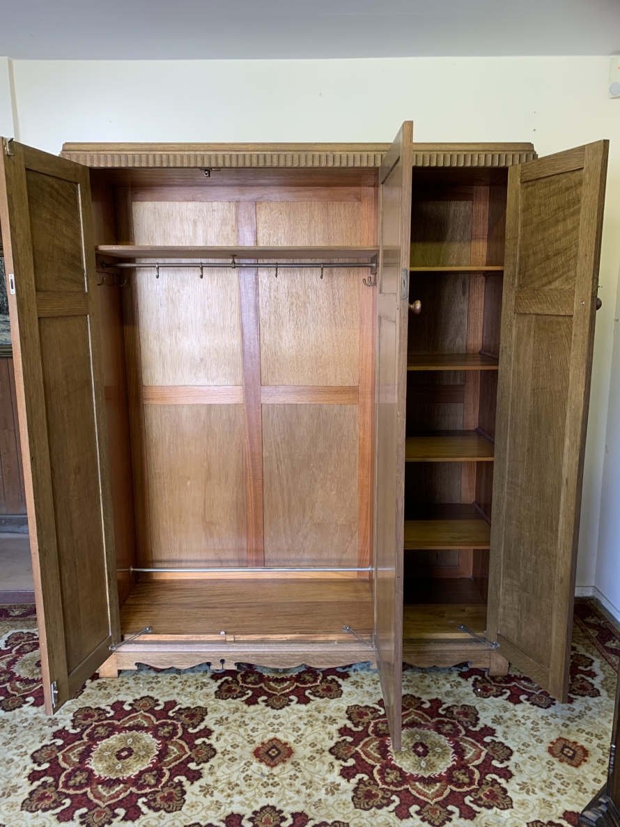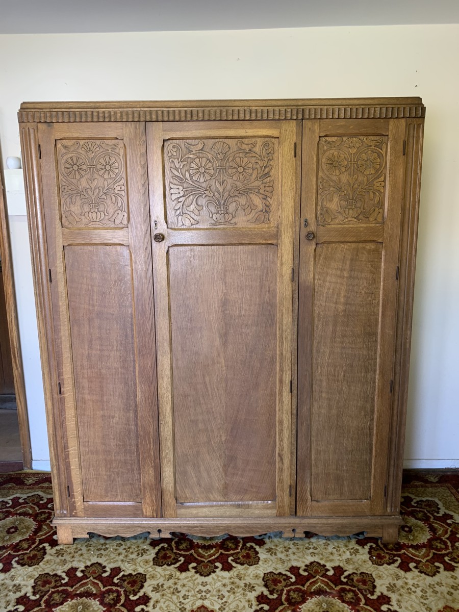 This beautiful wardrobe made with glorious solid oak dates circa 1930. The three lockable doors each have a top carved recessed panel in the William Morris style depicting flora and forna. The left-hand door and central door open to reveal a shelf above a brass hanging rail, brass hooks and a shoe rail to the bottom. The right-hand door opens to reveal four fixed shelves. The base having arts and crafts carving to the skirt. Please note this wardrobe splits down for easy transportation and delivery.
