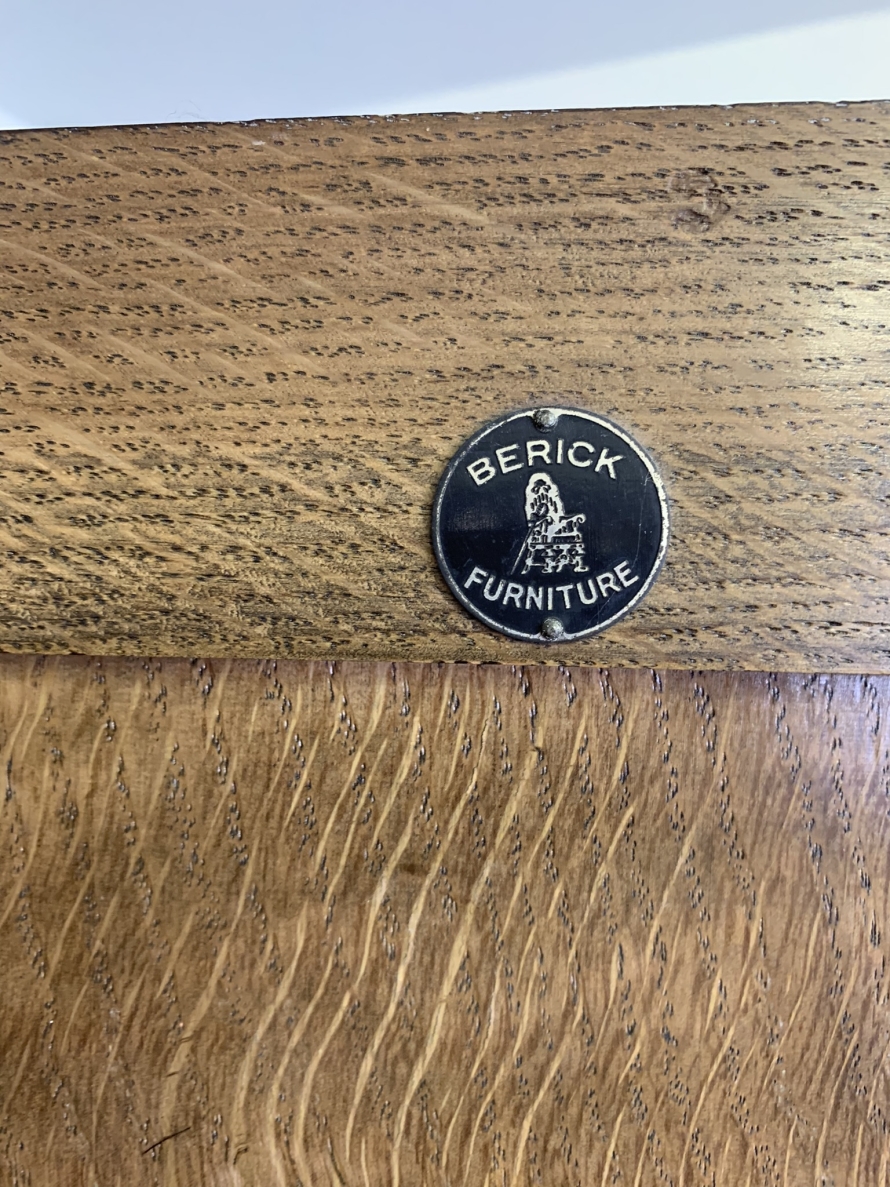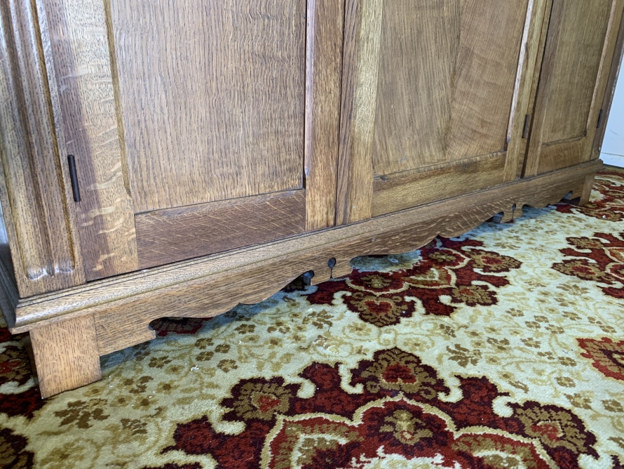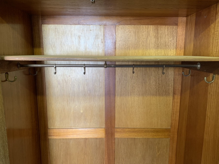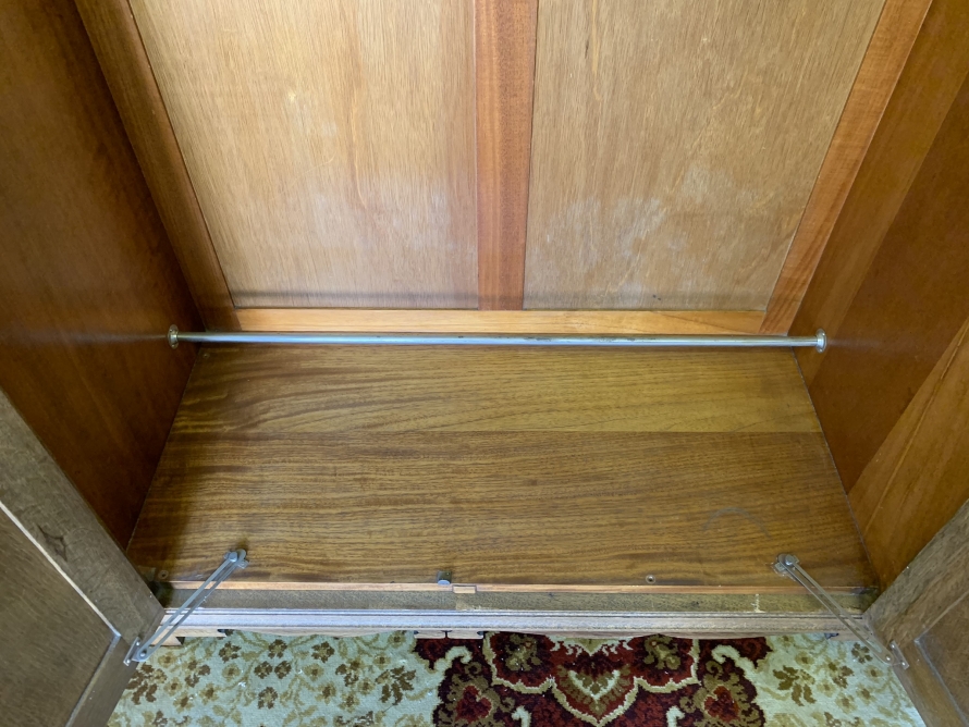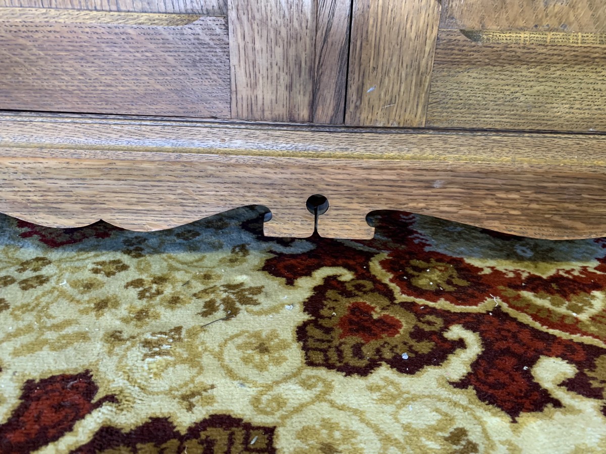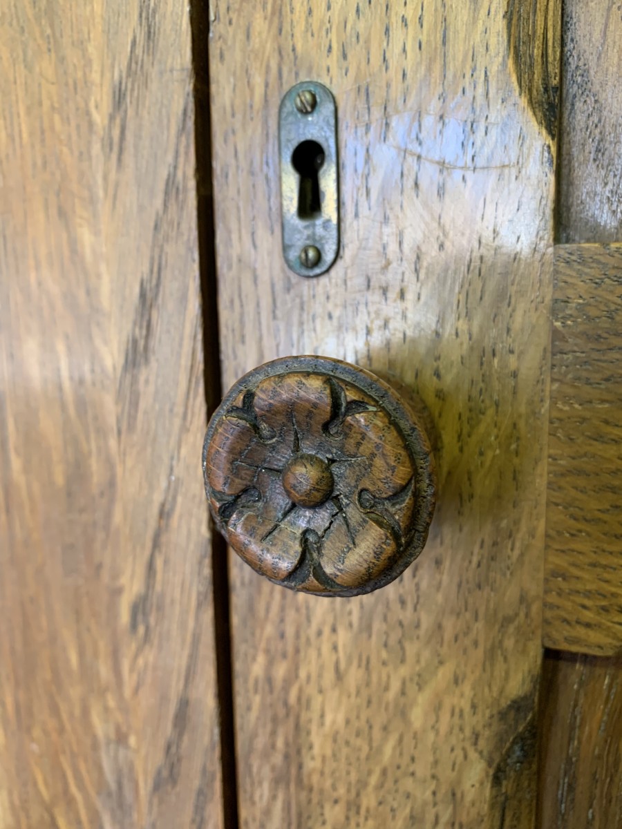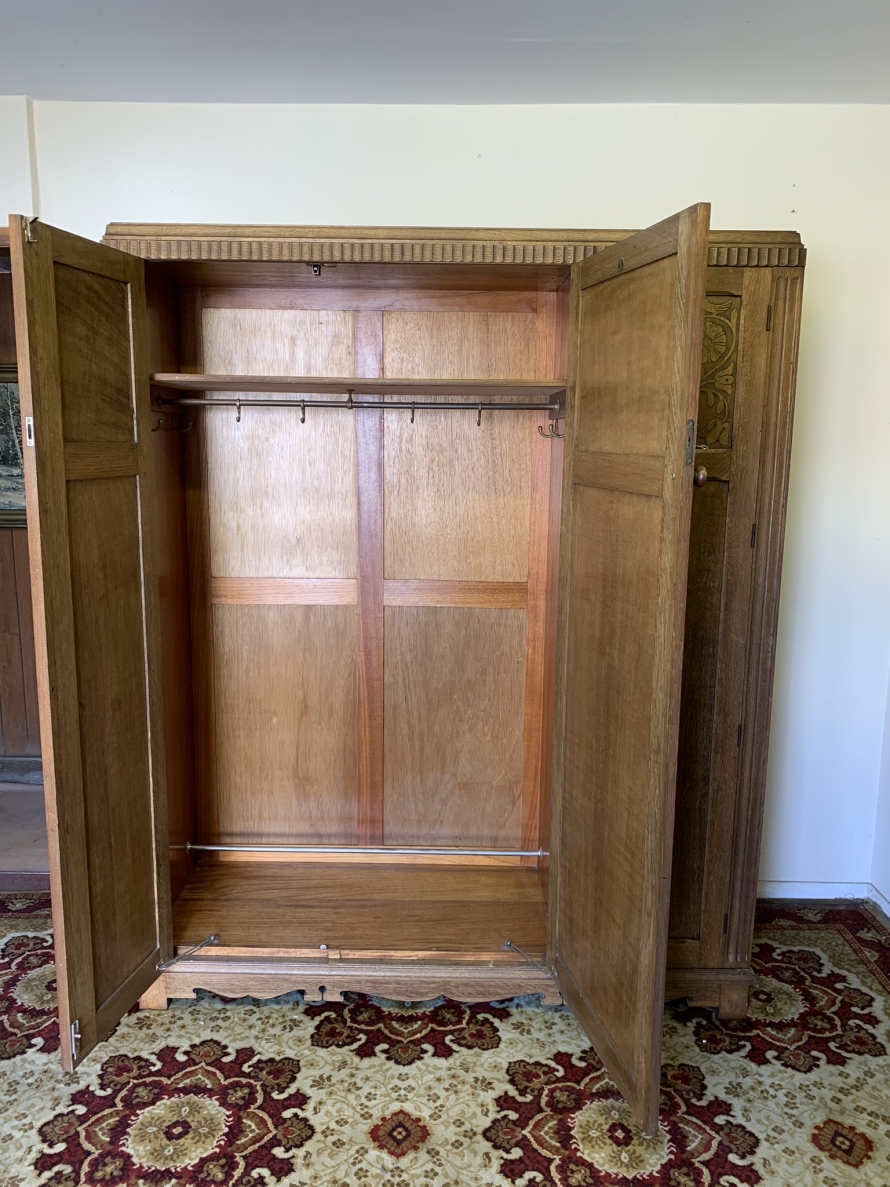 This beautiful wardrobe made with glorious solid oak dates circa 1930. The three lockable doors each have a top carved recessed panel in the William Morris style depicting flora and forna. The left-hand door and central door open to reveal a shelf above a brass hanging rail, brass hooks and a shoe rail to the bottom. The right-hand door opens to reveal four fixed shelves. The base having arts and crafts carving to the skirt. Please note this wardrobe splits down for easy transportation and delivery.
