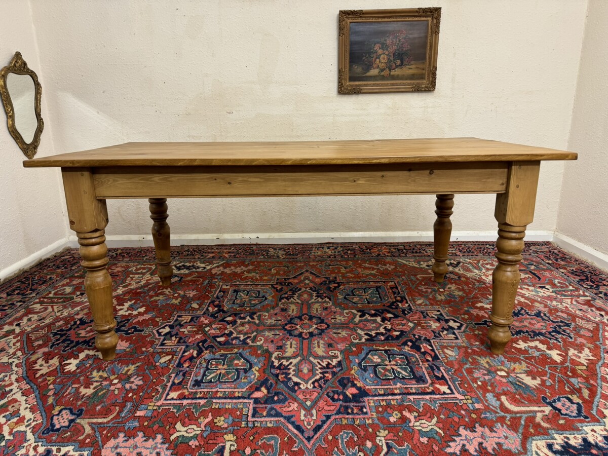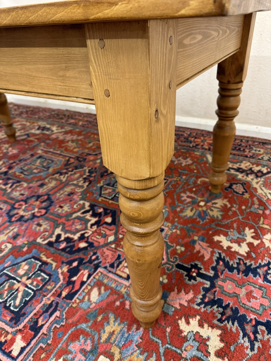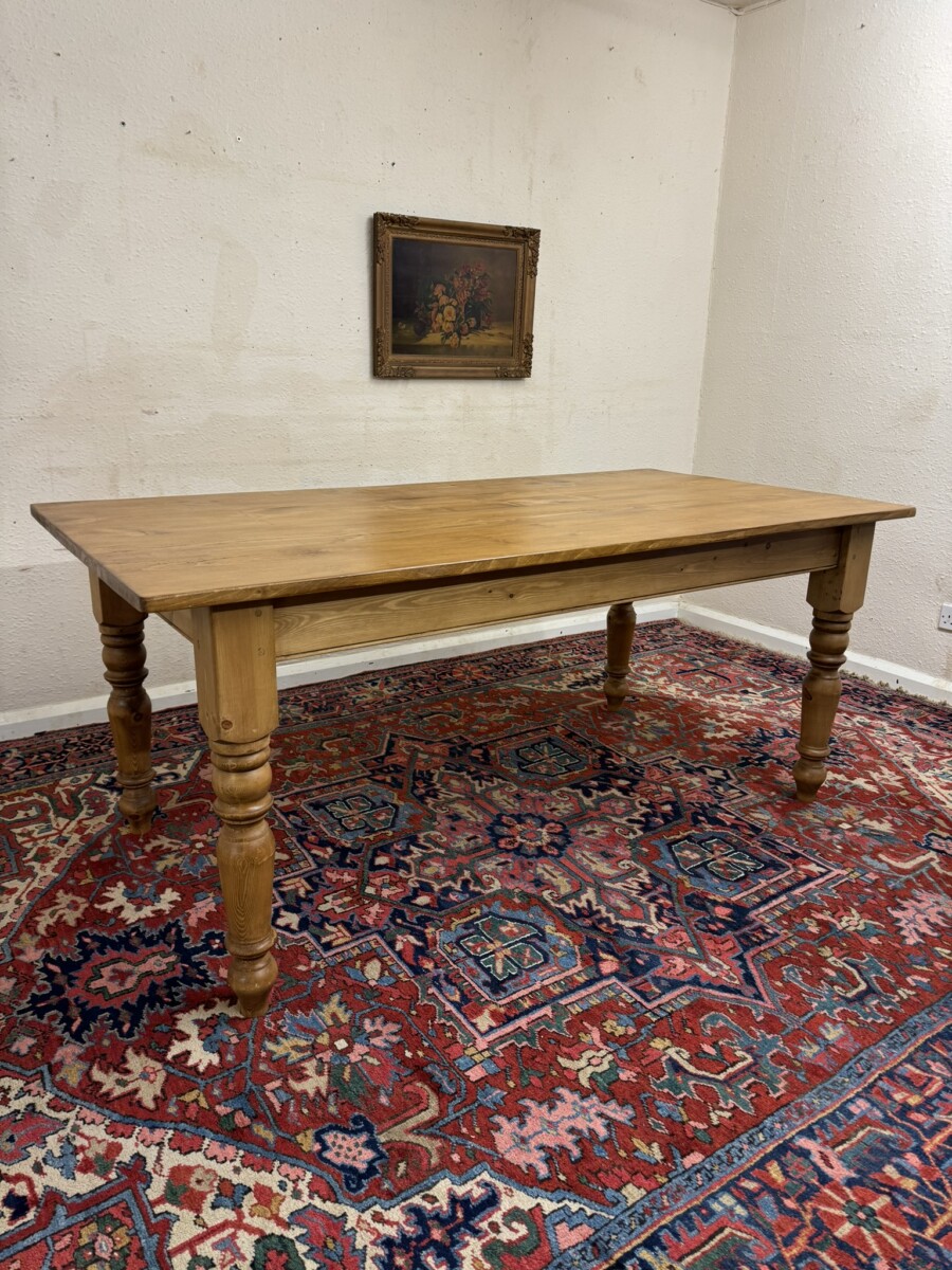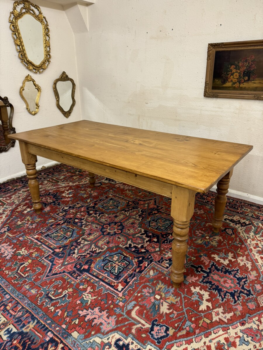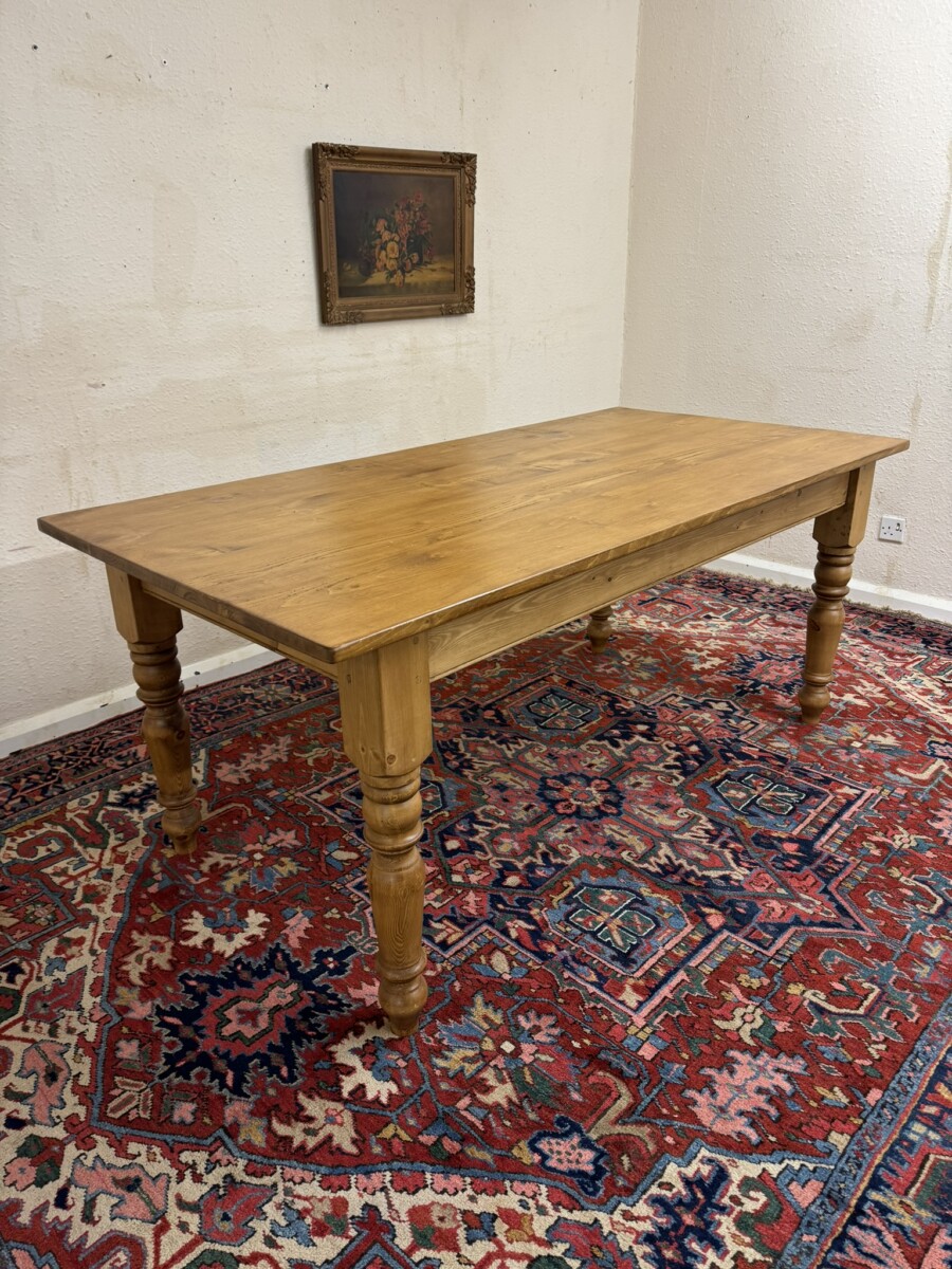 This lovely table is made in solid pine and is in excellent condition. The table comfortably seats six people. The thick top sits on four impressive turned legs.