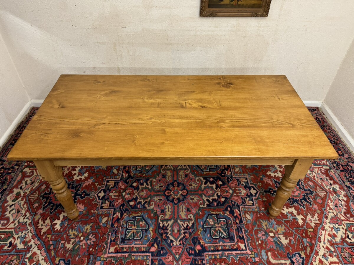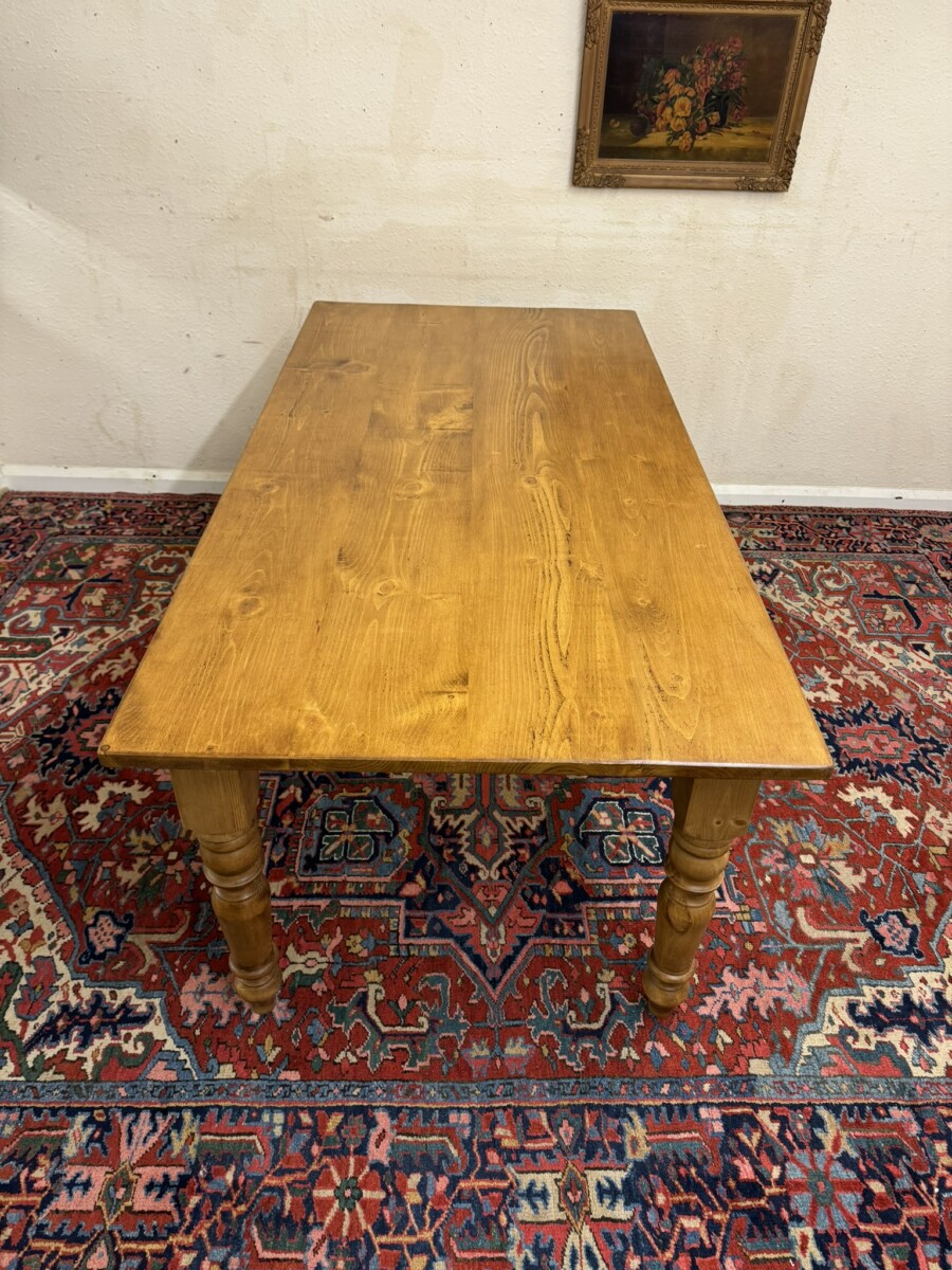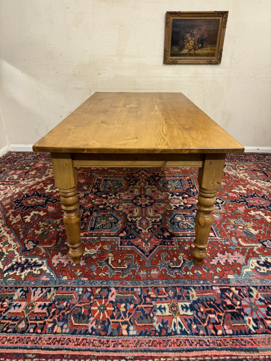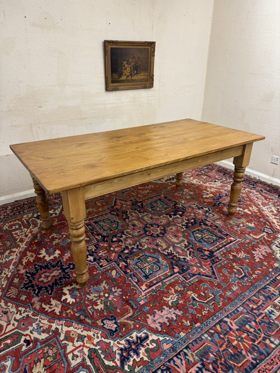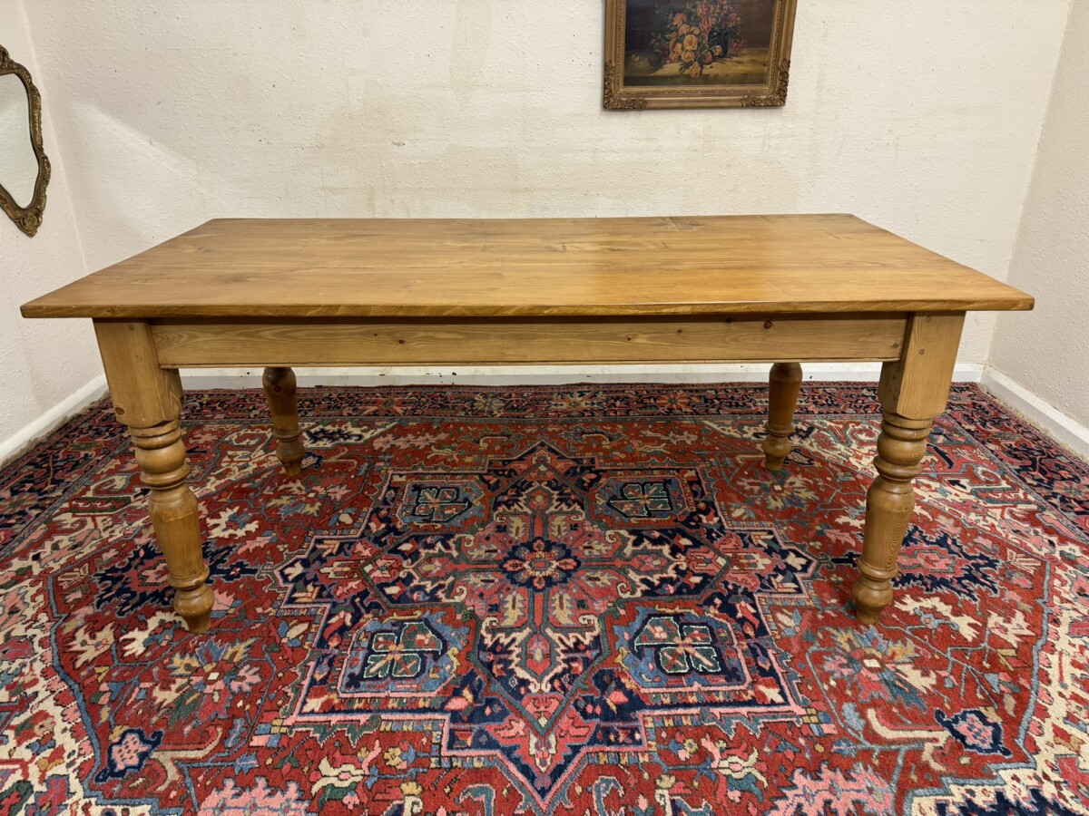 This lovely table is made in solid pine and is in excellent condition. The table comfortably seats six people. The thick top sits on four impressive turned legs.