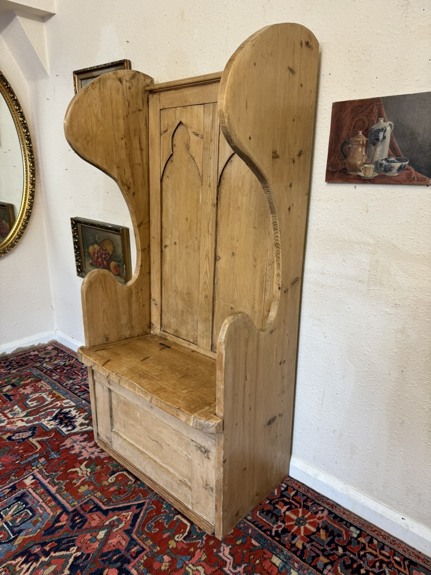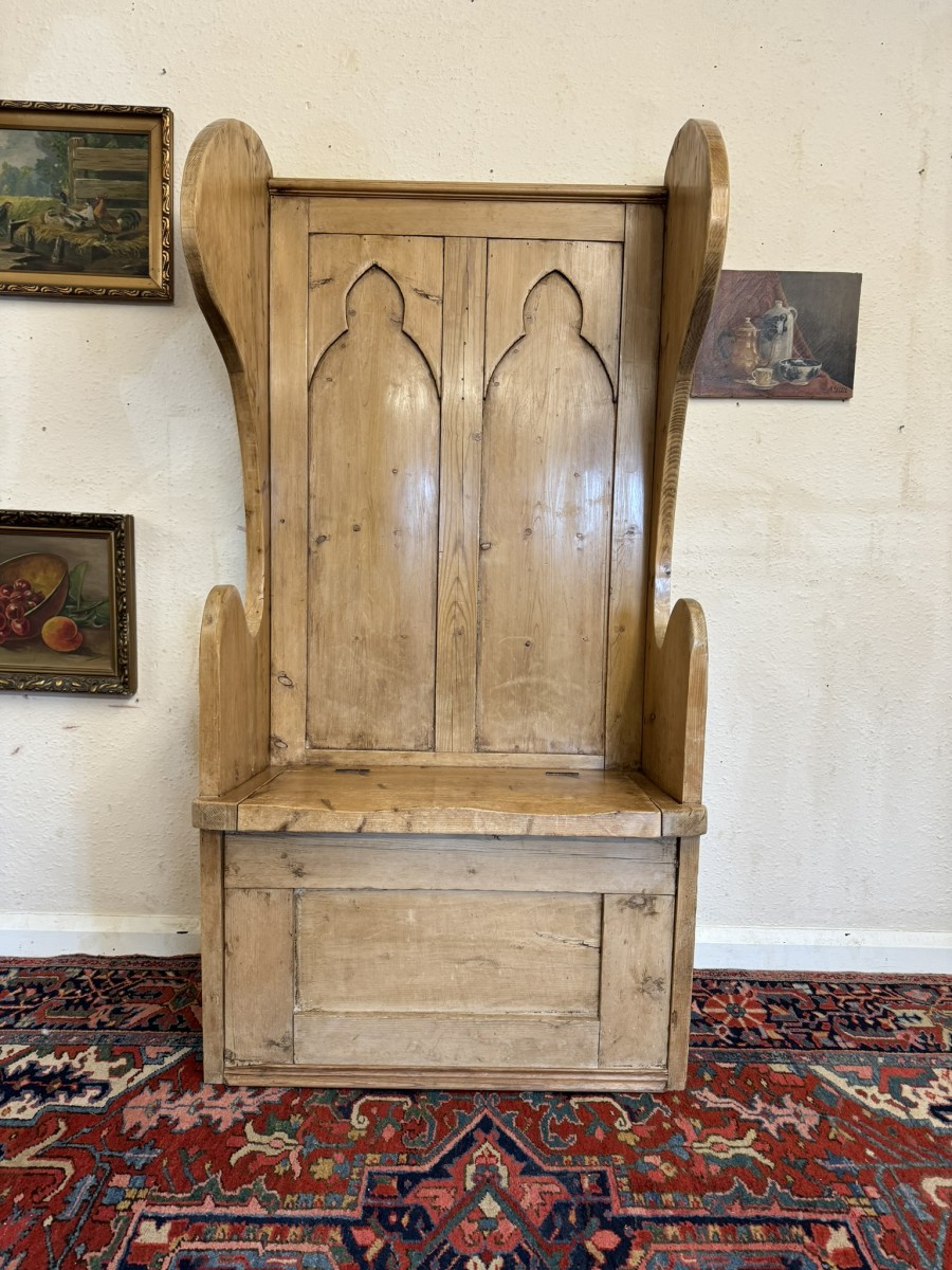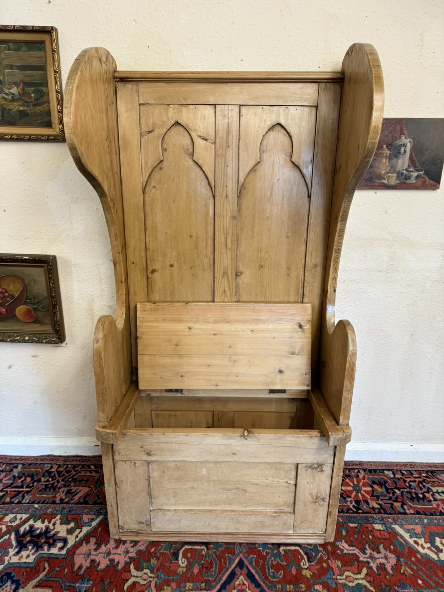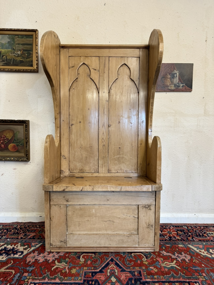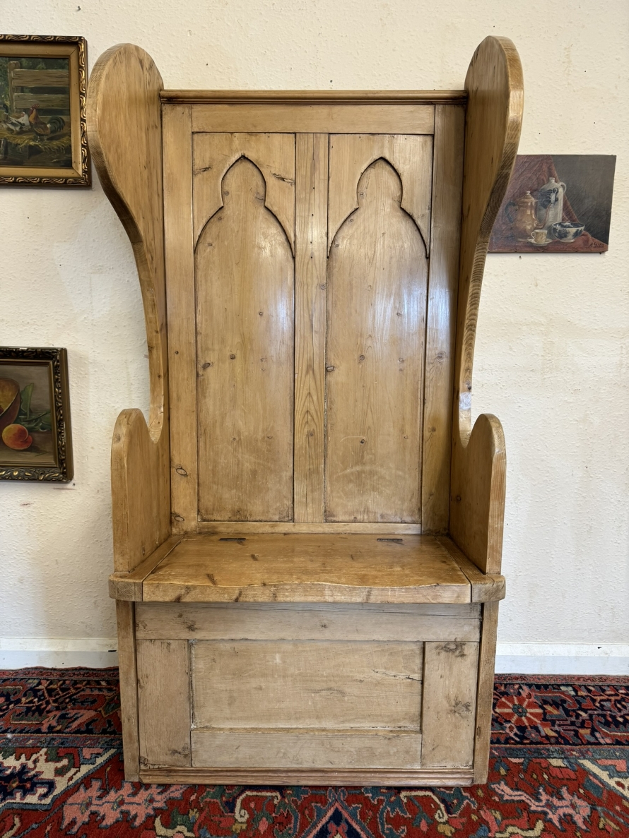 This this charming lambing chair has a high recessed panelled back, shaped wing arms, lift up seat which offers storage. Recessed panelled to the front, such a fabulous chair.