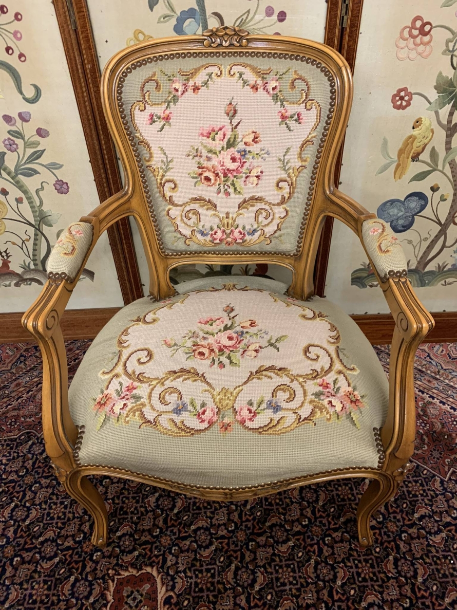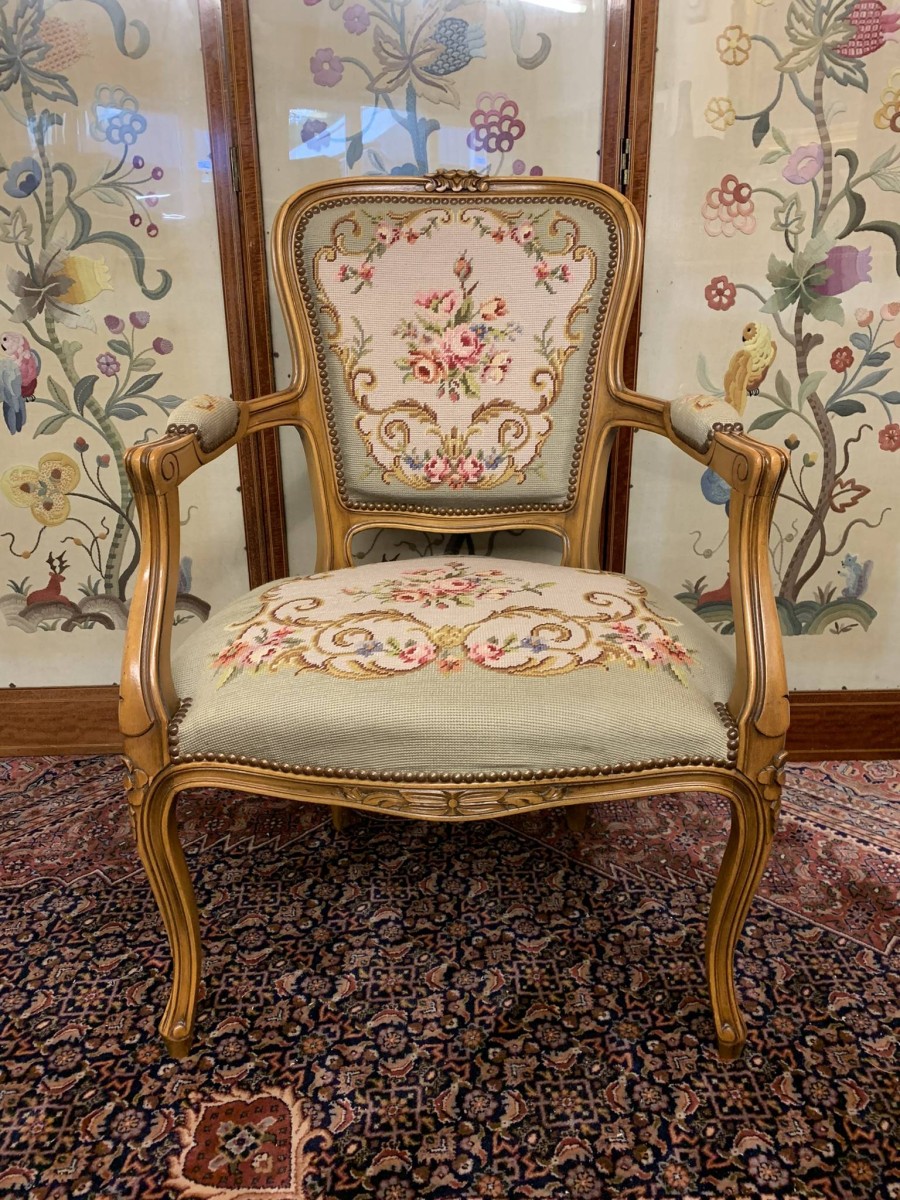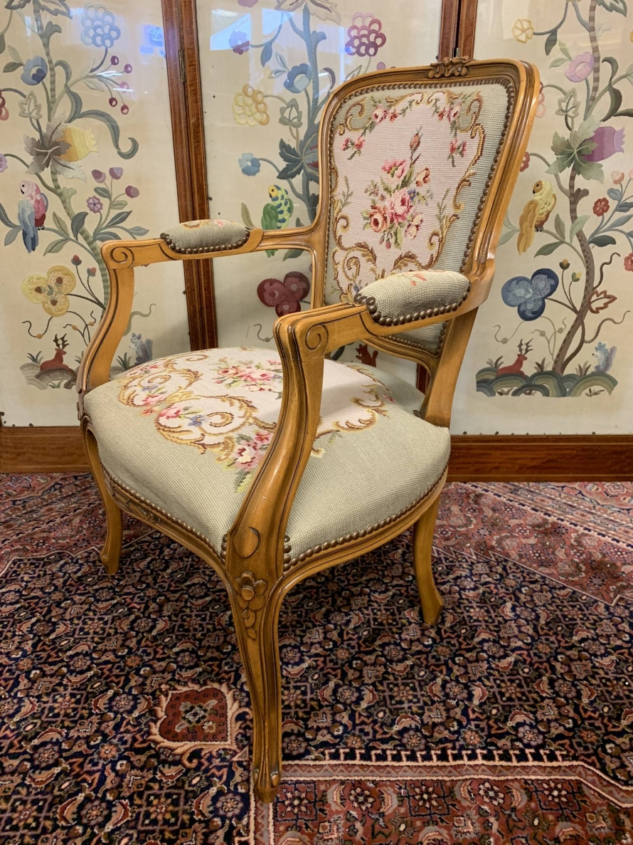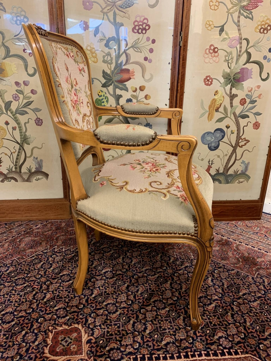 This attractive French chair has a shaped needlepoint upholstered back with carved decoration above. Two shaped arms with needlepoint cushioned armrests, cushioned needlepoint seat, shaped skirt with central carving and standing on two carved cabriole shaped legs to the front.