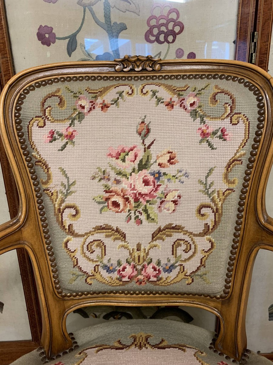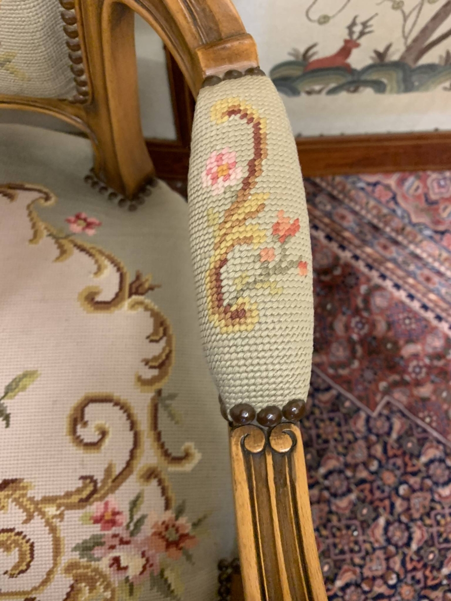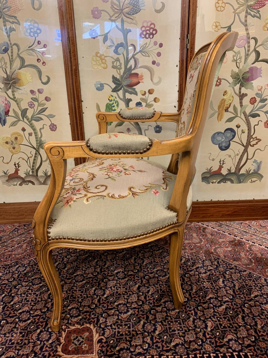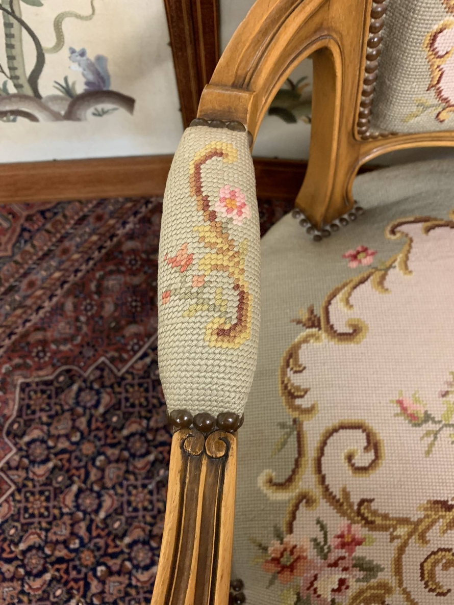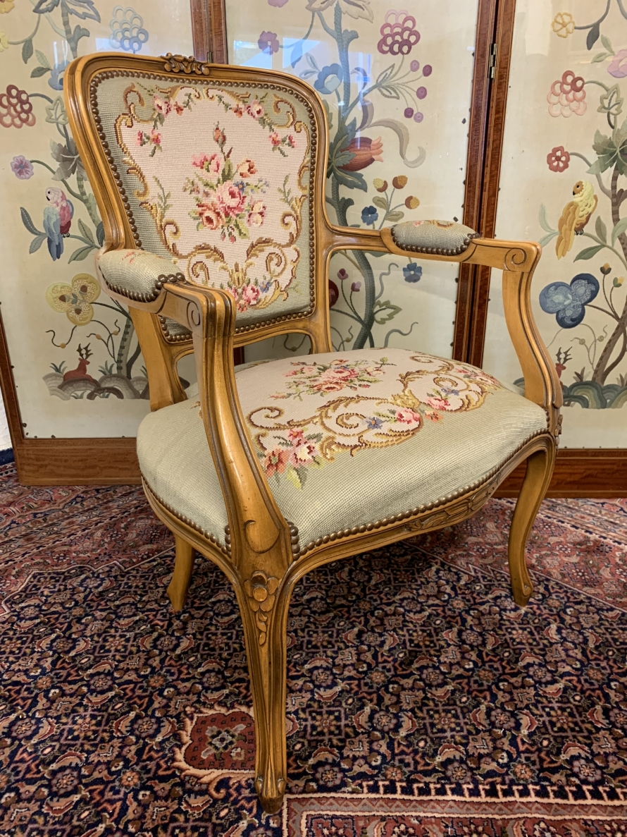 This attractive French chair has a shaped needlepoint upholstered back with carved decoration above. Two shaped arms with needlepoint cushioned armrests, cushioned needlepoint seat, shaped skirt with central carving and standing on two carved cabriole shaped legs to the front.