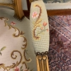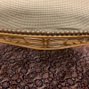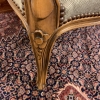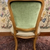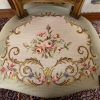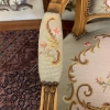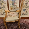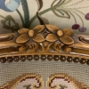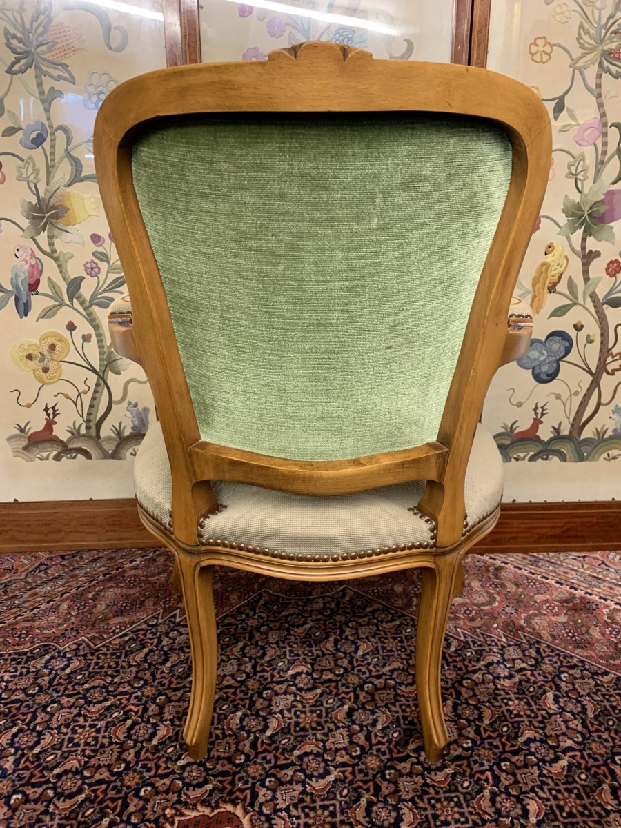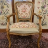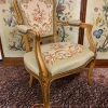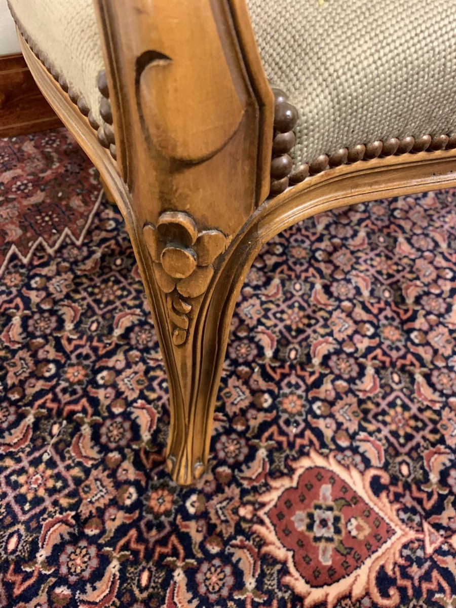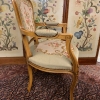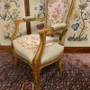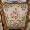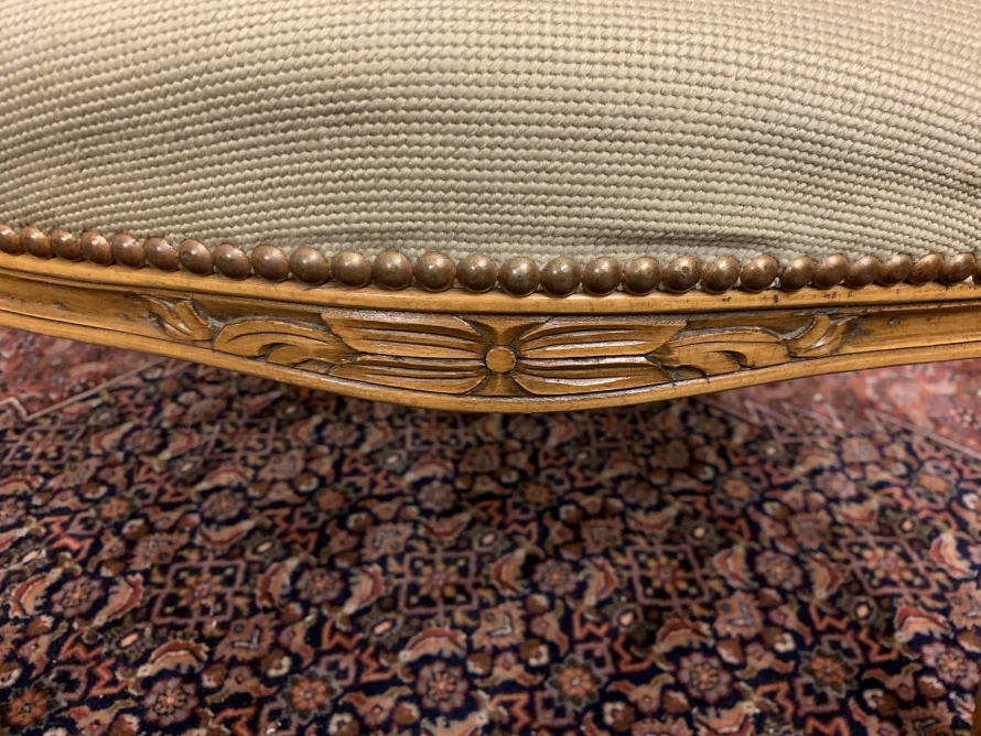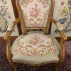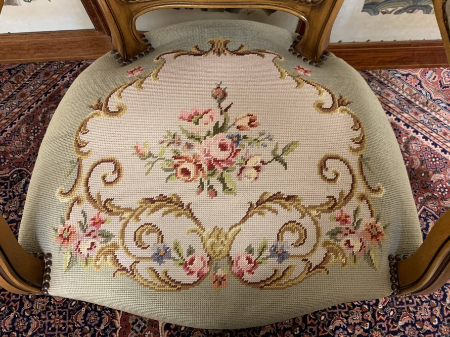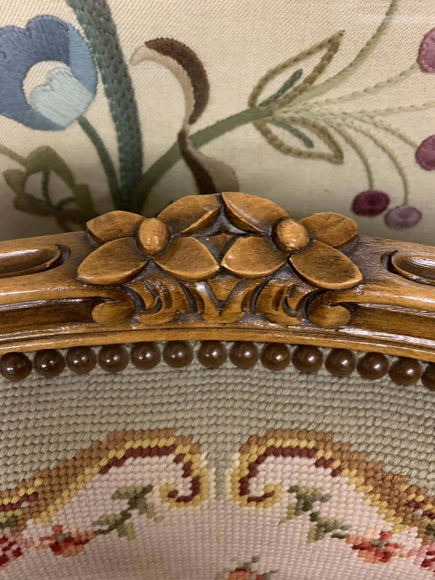 This attractive French chair has a shaped needlepoint upholstered back with carved decoration above. Two shaped arms with needlepoint cushioned armrests, cushioned needlepoint seat, shaped skirt with central carving and standing on two carved cabriole shaped legs to the front.