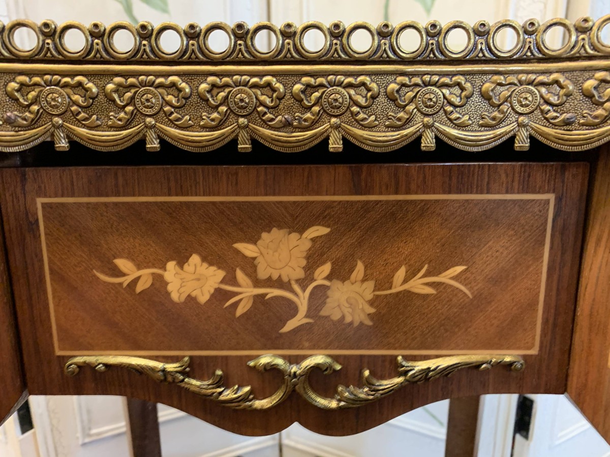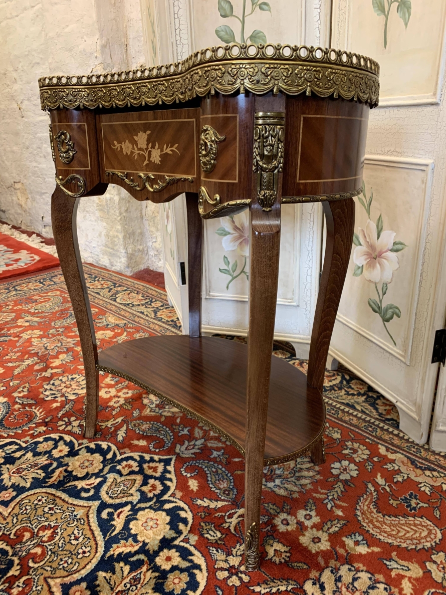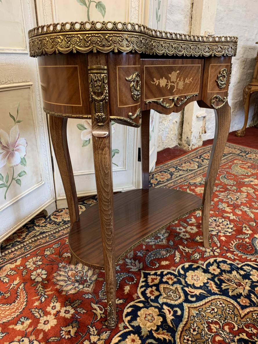 This beautiful French side table has a shaped marble top with an ornate carved ormolu gallery. Below is a shaped marquetry inlaid drawer with ormolu decoration. Shaped sides and front , having inlay and ormolu decoration. This superb item stands on four cabriole shaped legs each having ormolu decoration to the base.