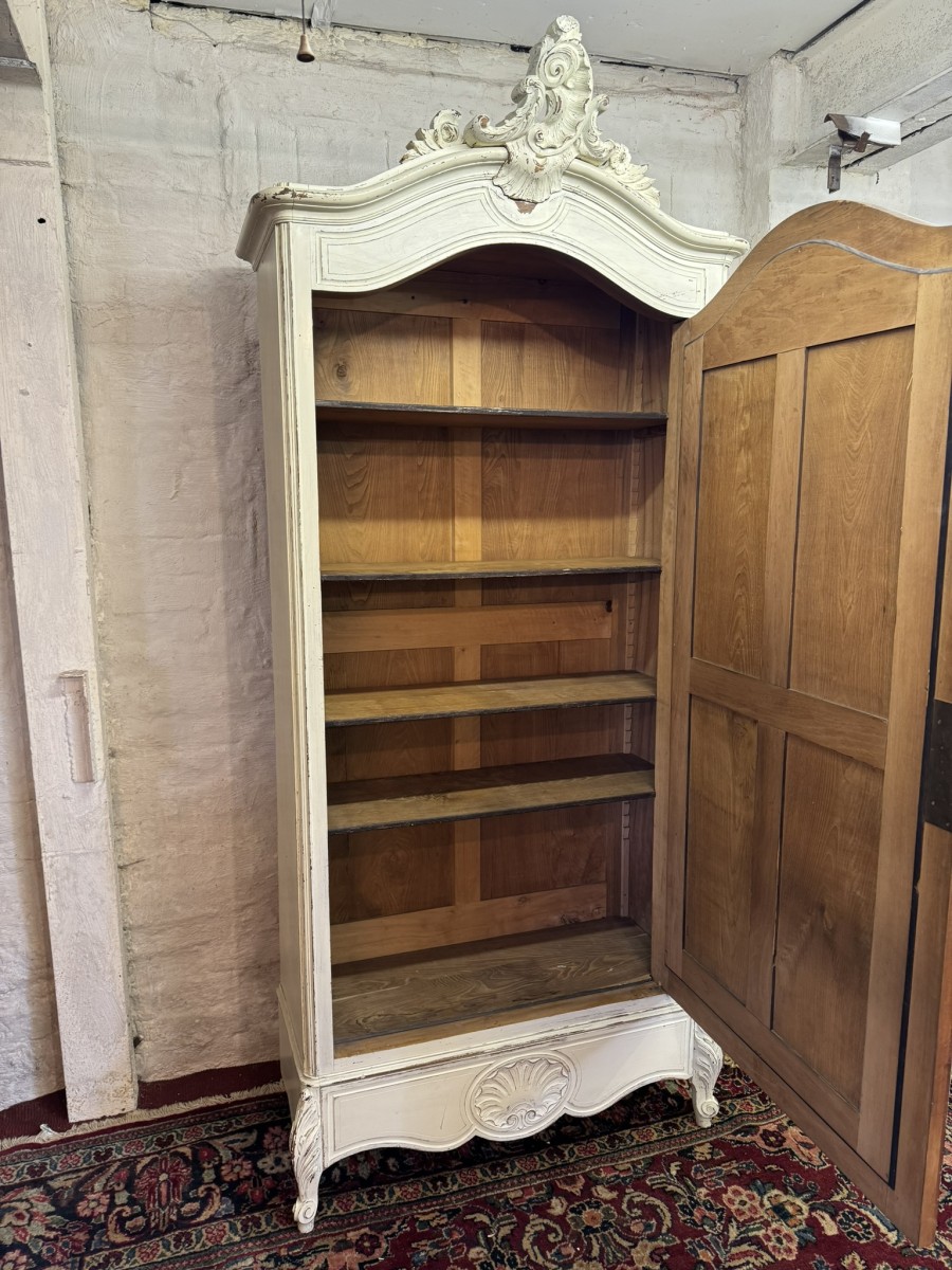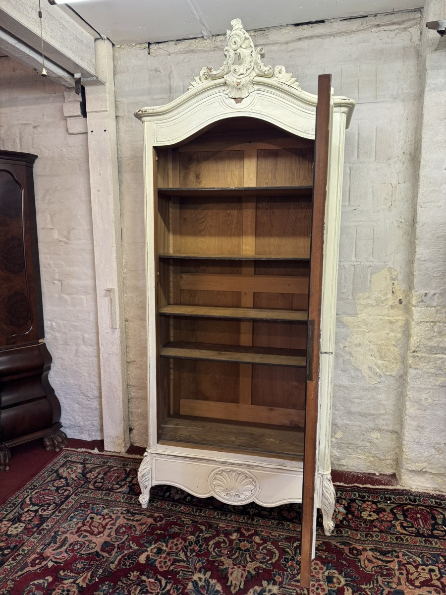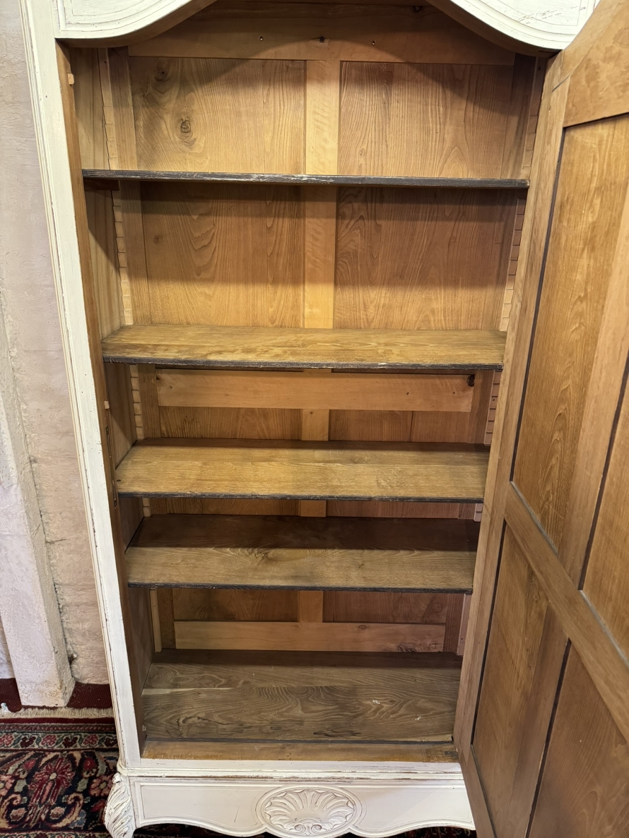 The oversailing top rises to a fabulous central carving, below is a bevel edged mirrored lockable full length door. The door opens to reveal four adjustable and removable shelves. Shaped carved drawer below this stunning French linen cabinet/armoire stands on two carved cabriole legs to the front.