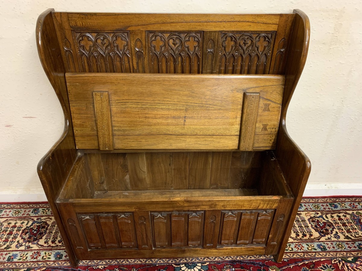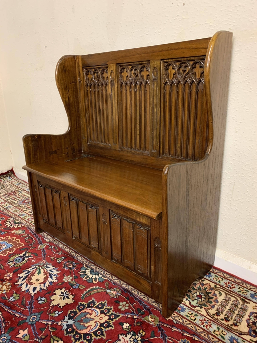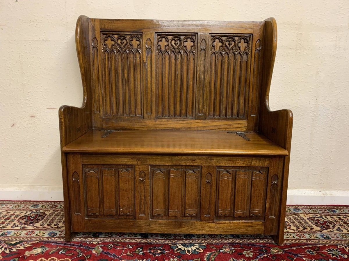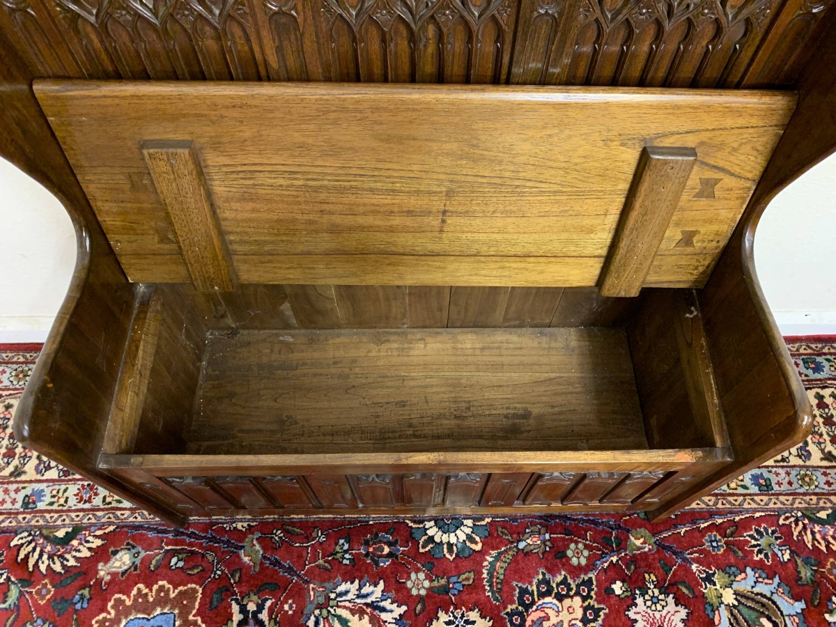 The back rest is carved in traditional Gothic style. Shaped arms, lift up lid with decorative brass hinges. The lid rises to offer ample storage. The front has linen fold decoration.