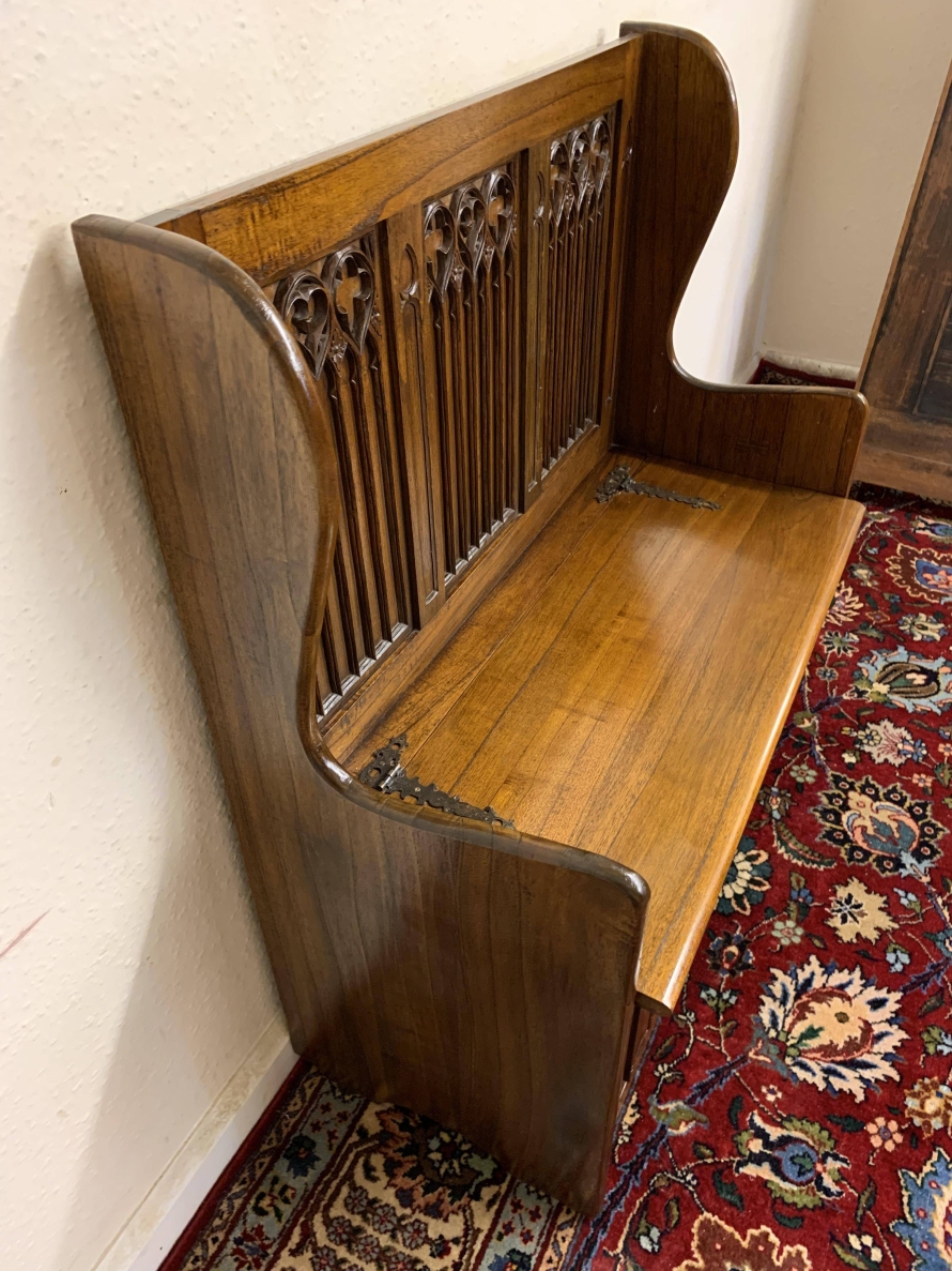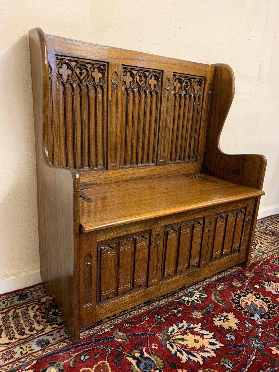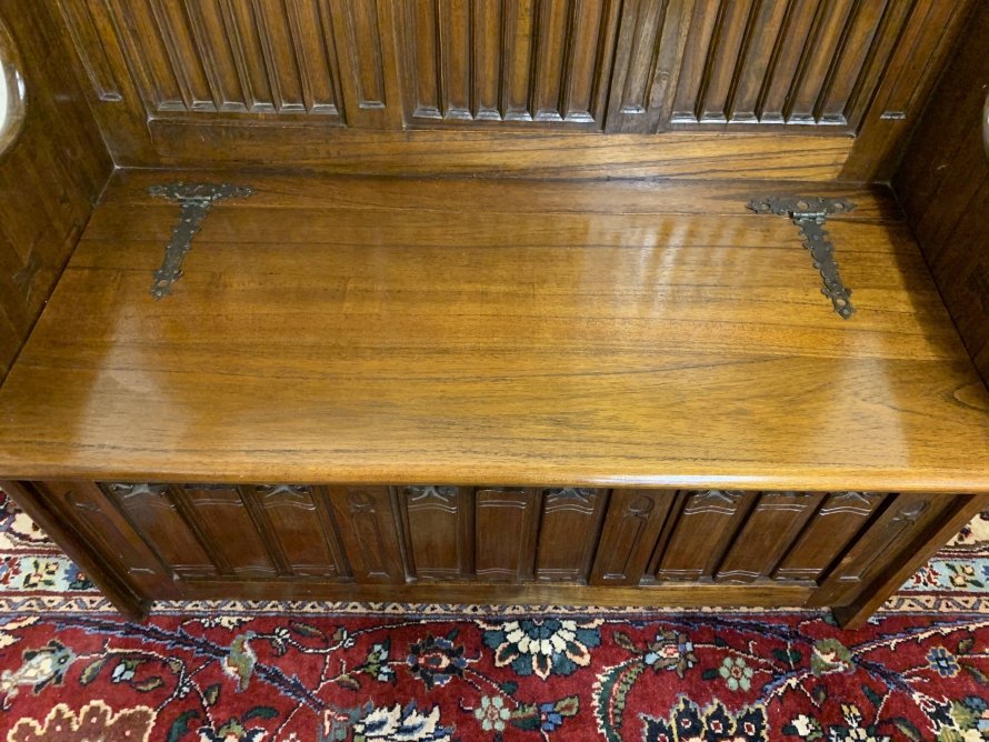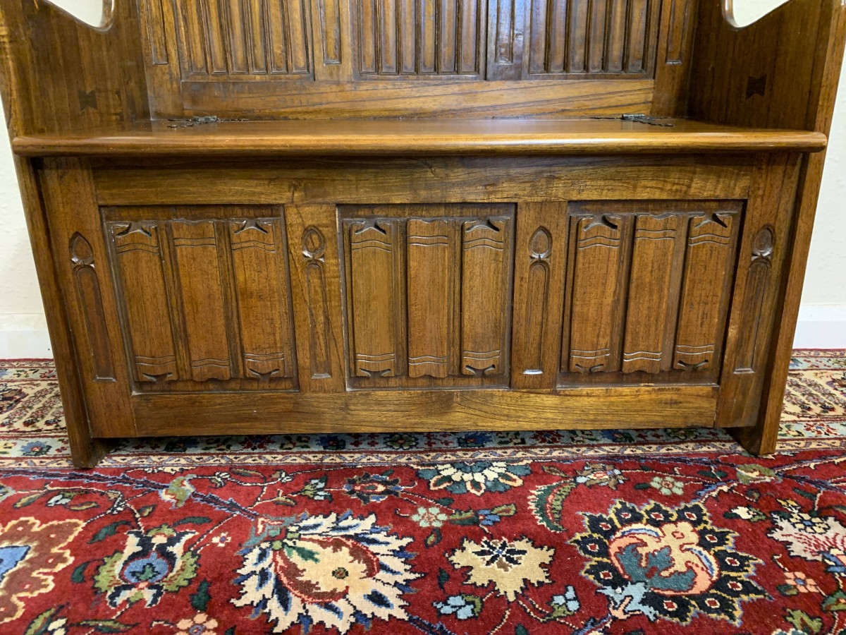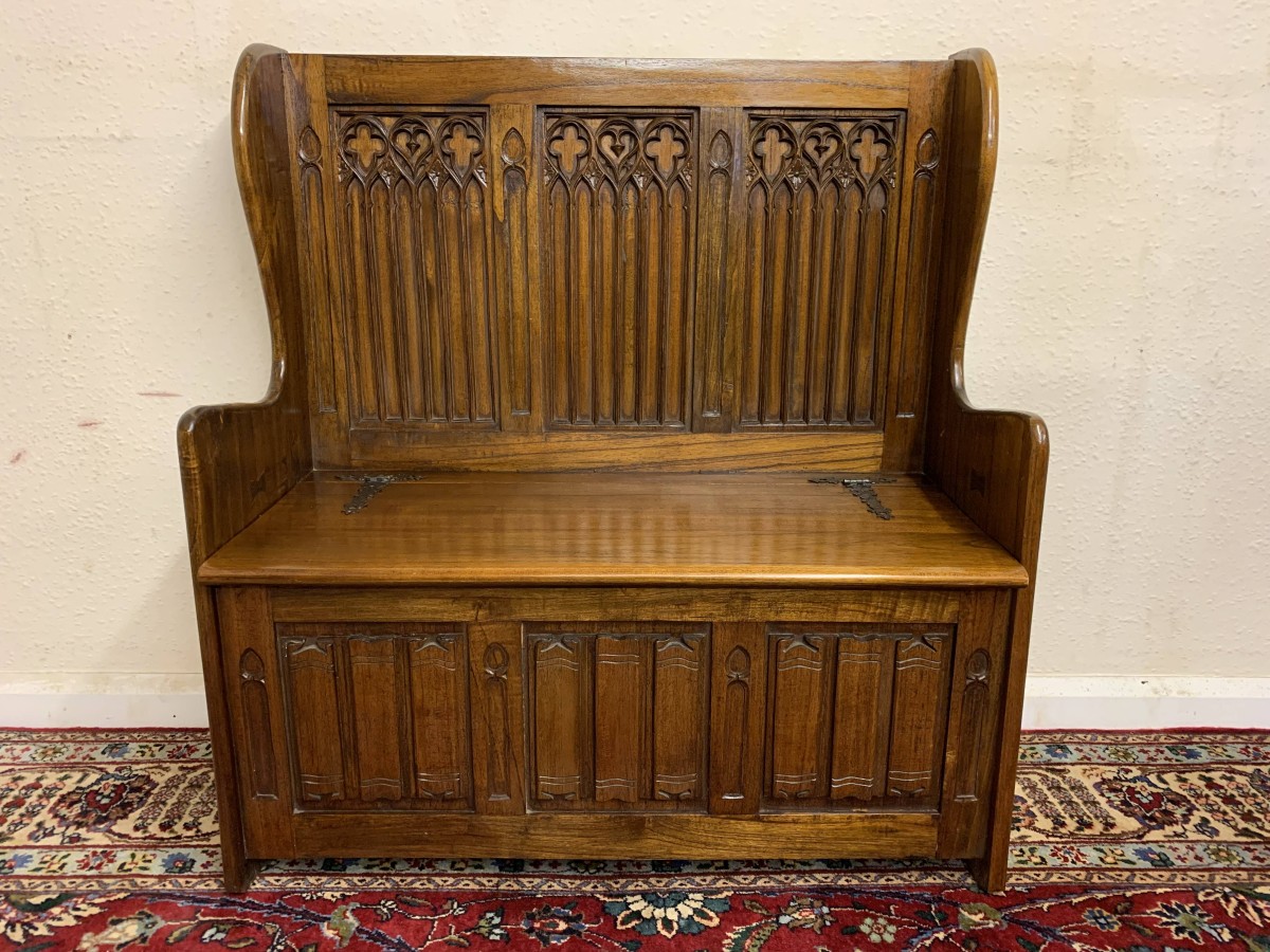 The back rest is carved in traditional Gothic style. Shaped arms, lift up lid with decorative brass hinges. The lid rises to offer ample storage. The front has linen fold decoration.