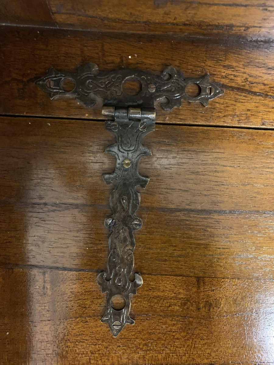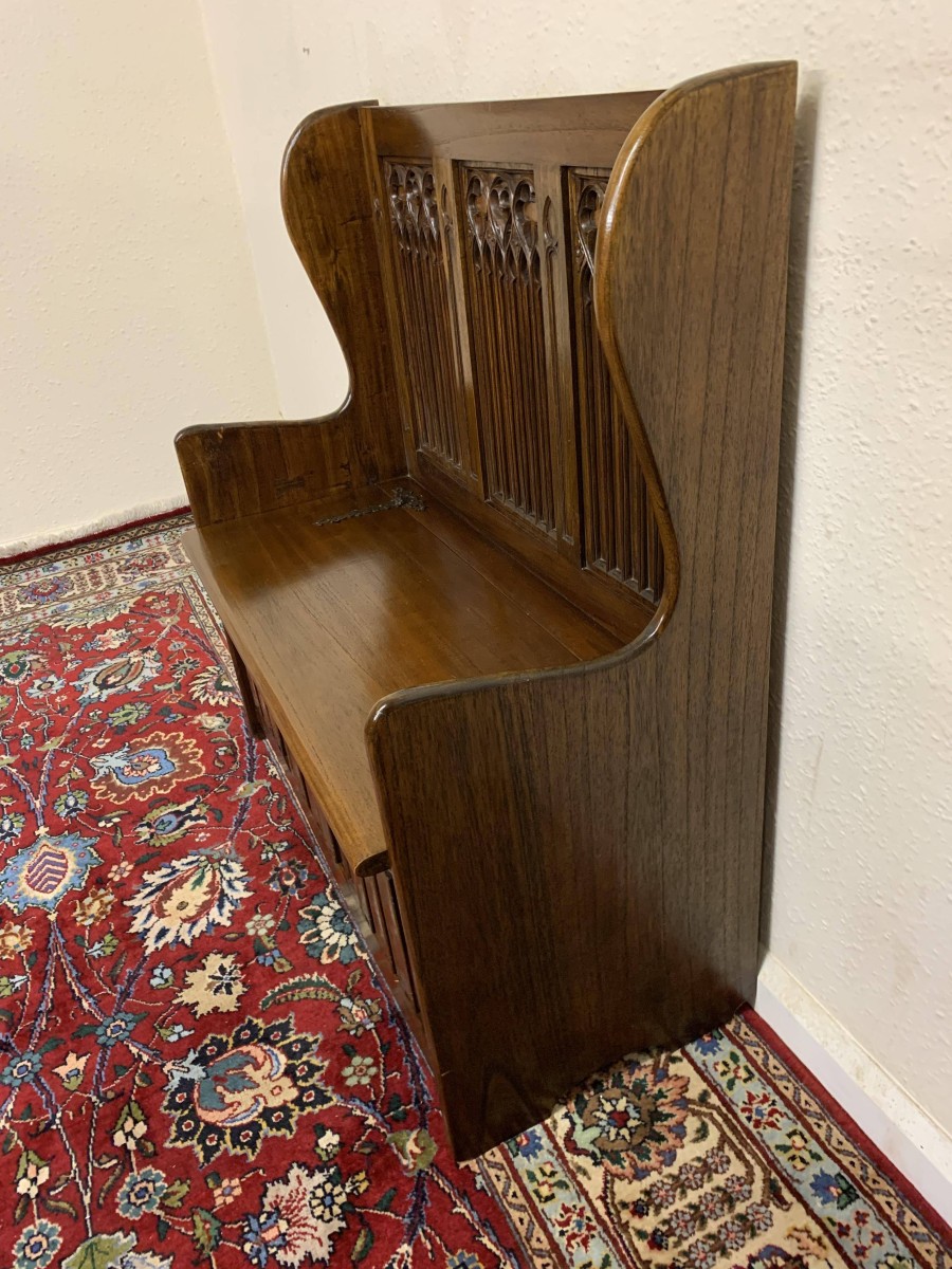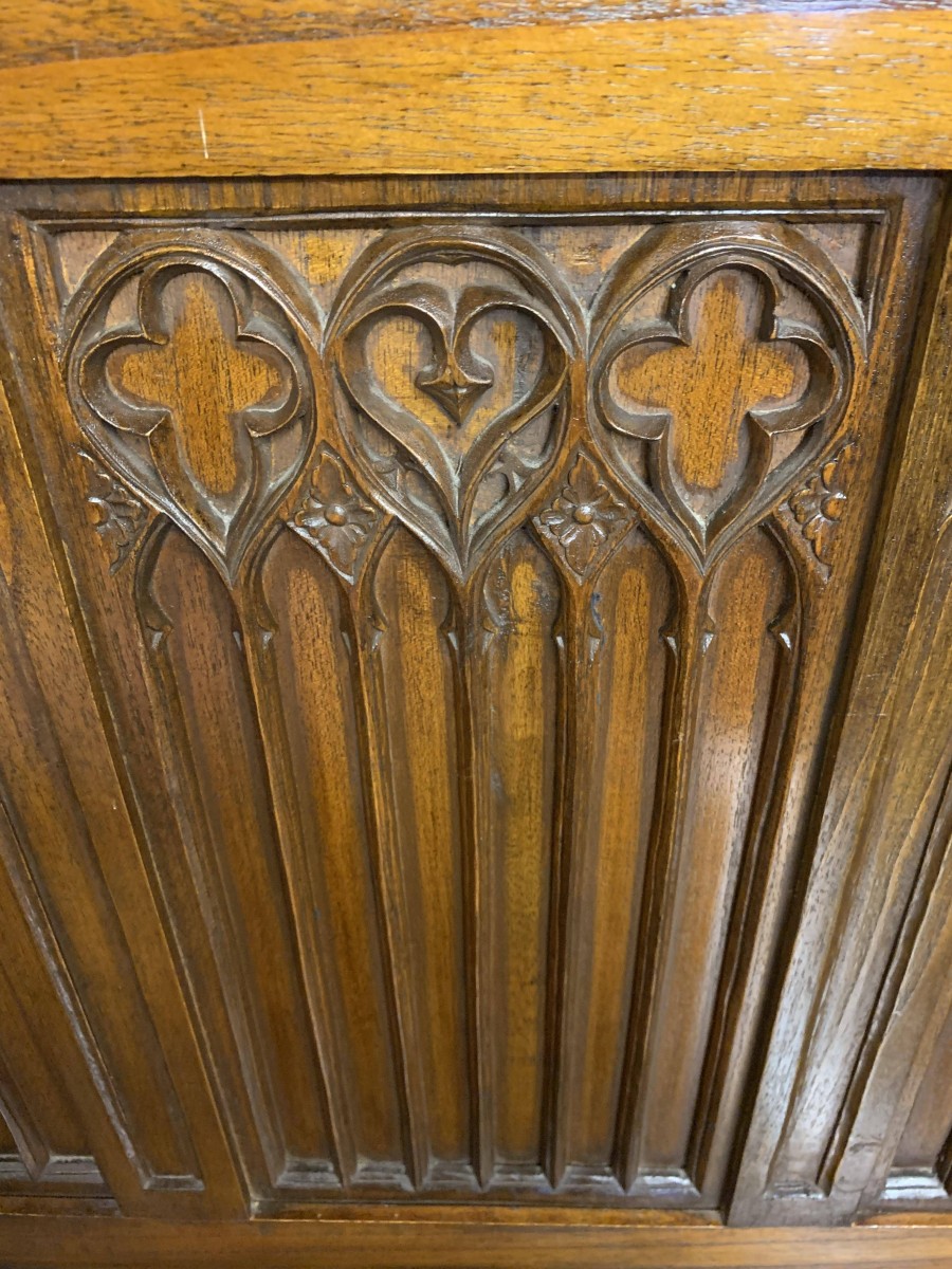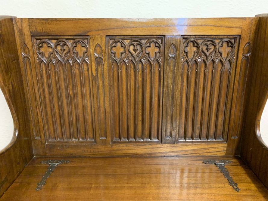 The back rest is carved in traditional Gothic style. Shaped arms, lift up lid with decorative brass hinges. The lid rises to offer ample storage. The front has linen fold decoration.