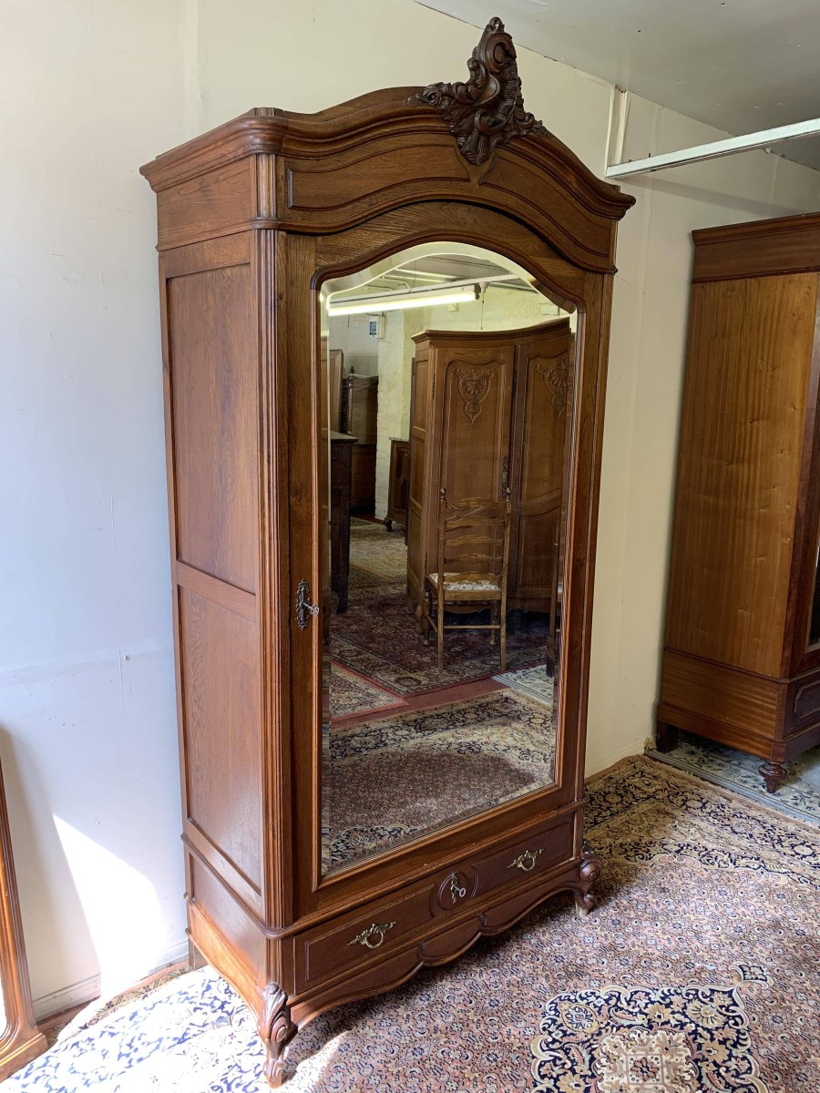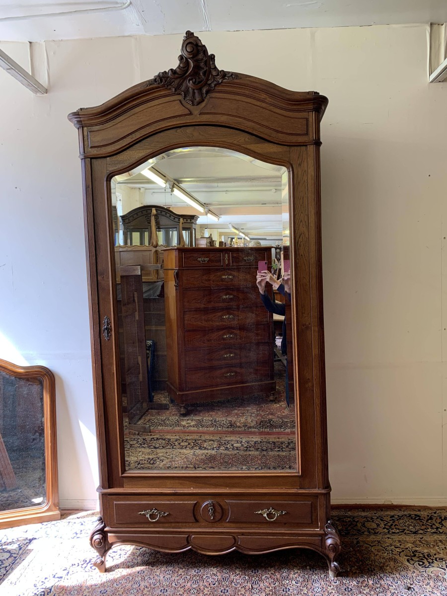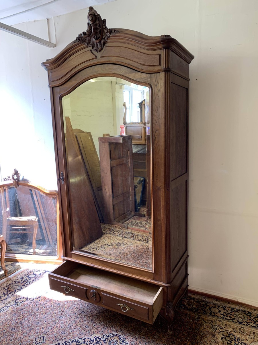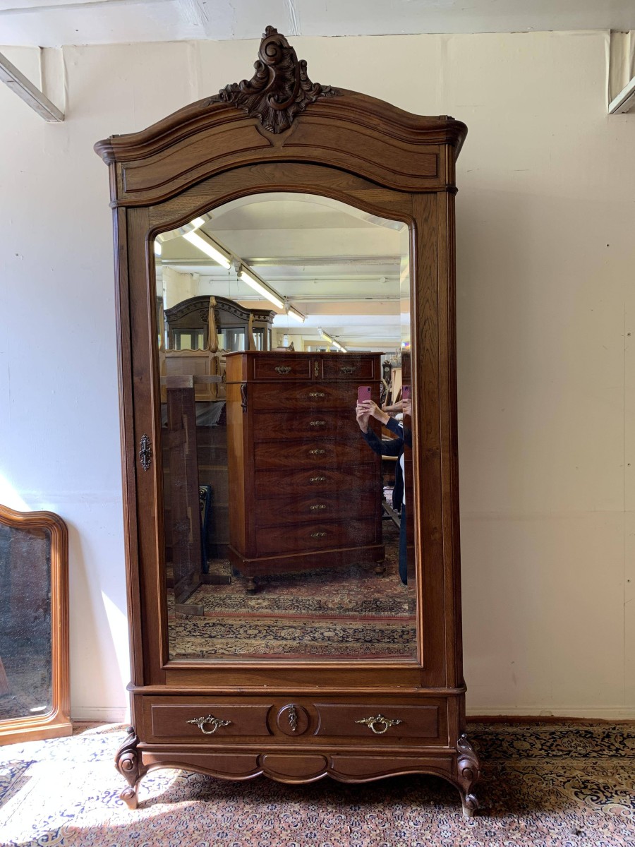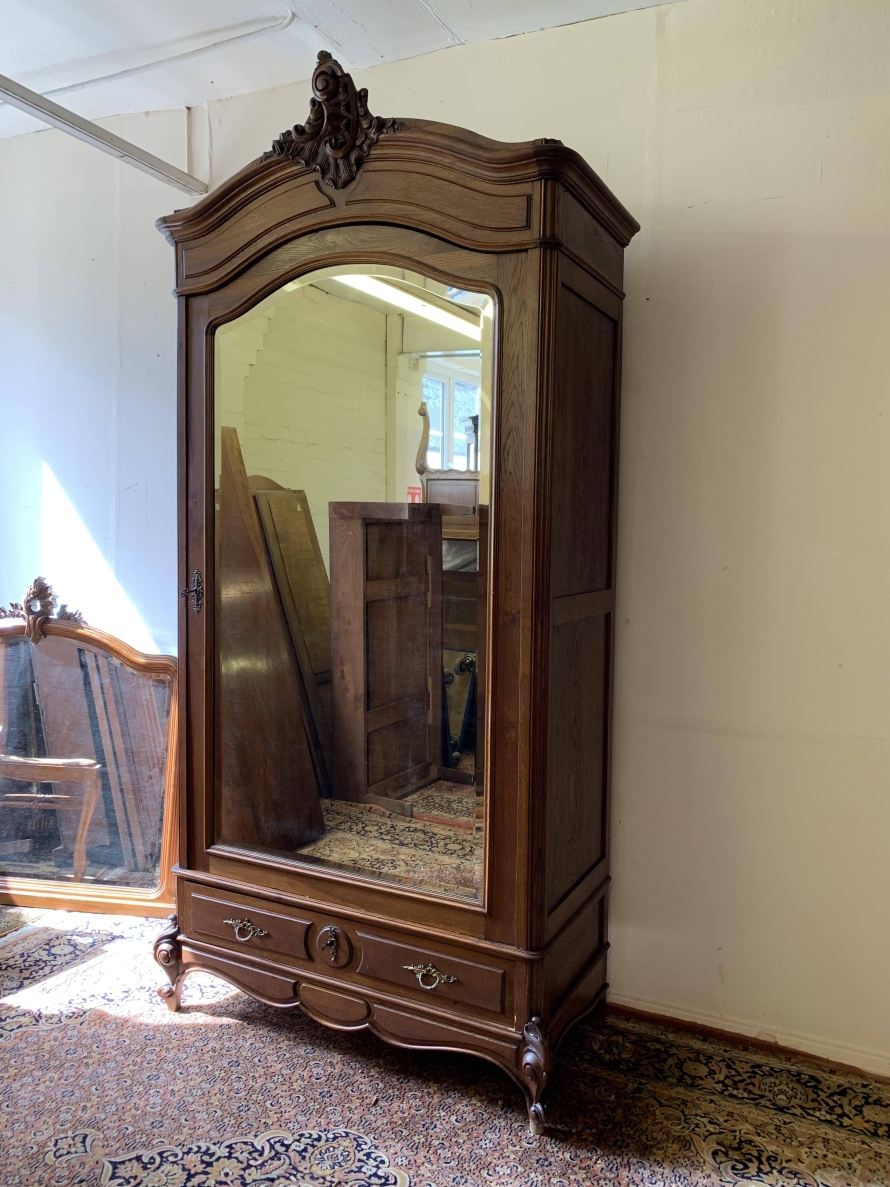 This fabulous armoire dates circa 1890. The shaped oversailing top rises to an impressive central carving. Below is a shaped full length bevel edged mirrored lockable door. The door opens to reveal three removable shelves. Below the door is a lockable drawer, the drawer having a pair of ornate brass handles. Recessed panelled sides, shaped skirt this fantastic French antique armoire stands on two carved cabriole legs to the front . Please note this item splits down for easy transportation and delivery into any home.