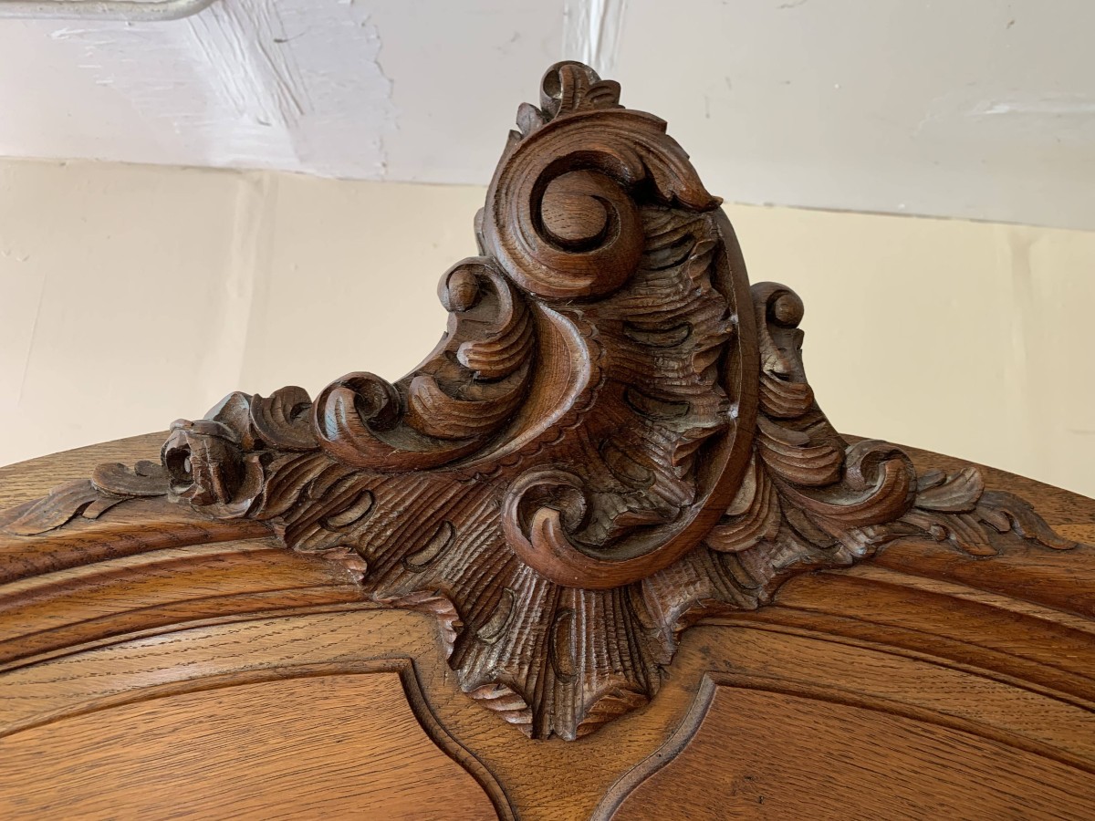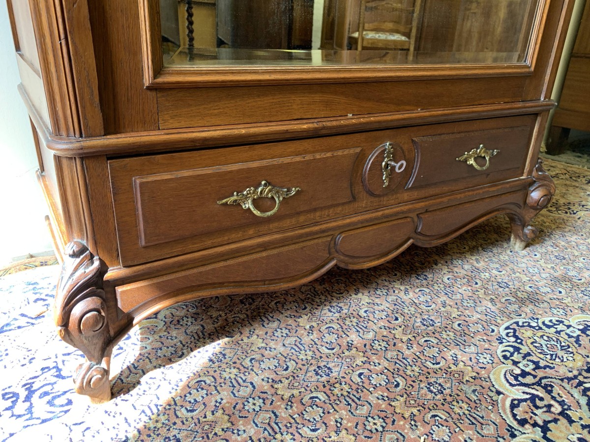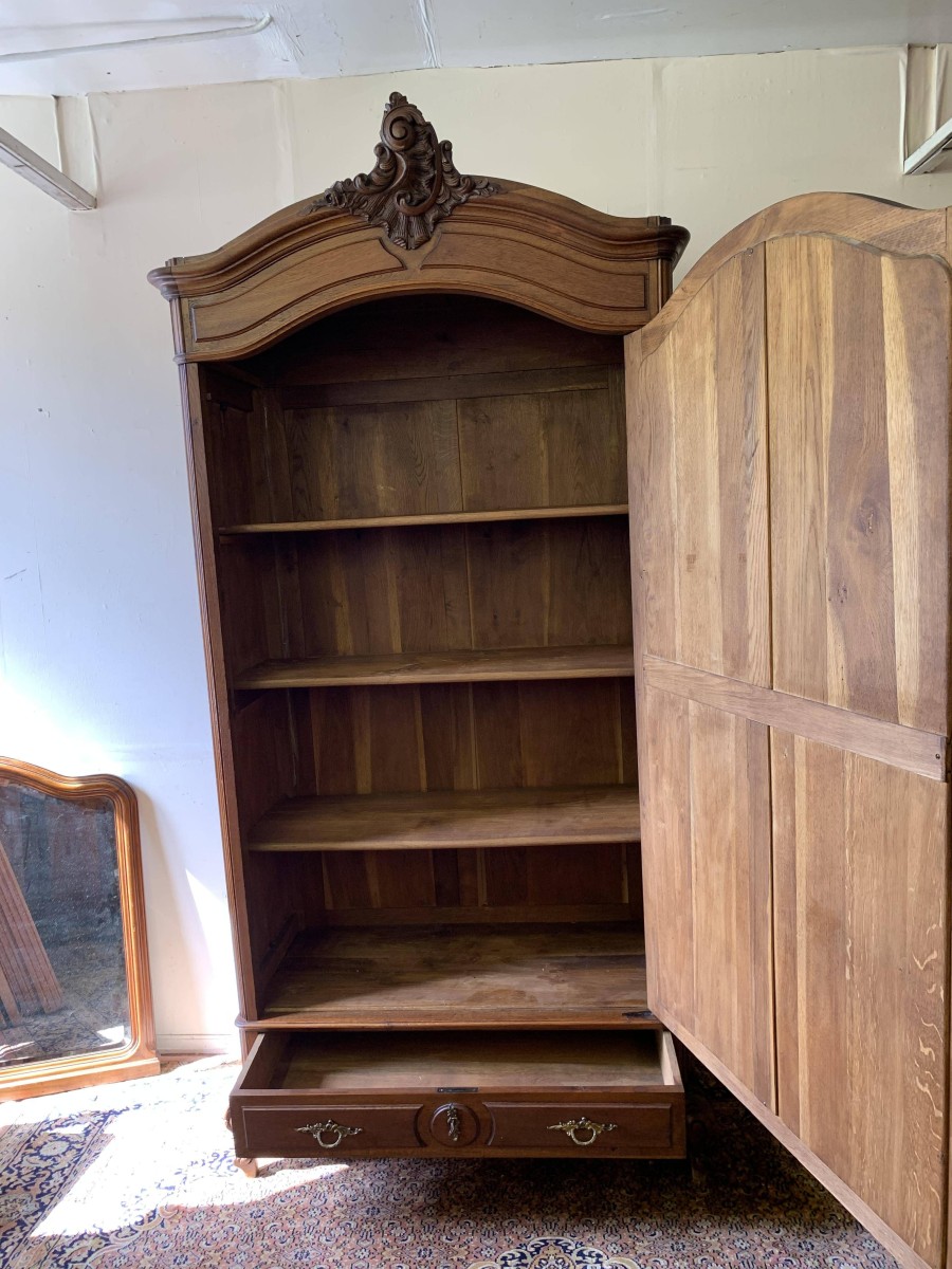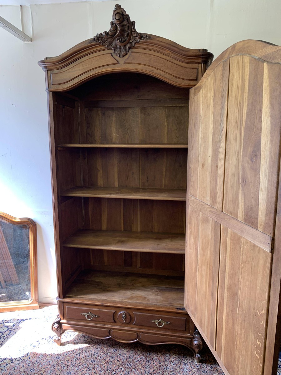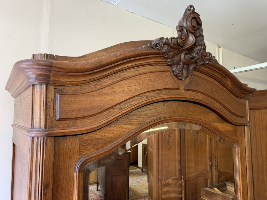 This fabulous armoire dates circa 1890. The shaped oversailing top rises to an impressive central carving. Below is a shaped full length bevel edged mirrored lockable door. The door opens to reveal three removable shelves. Below the door is a lockable drawer, the drawer having a pair of ornate brass handles. Recessed panelled sides, shaped skirt this fantastic French antique armoire stands on two carved cabriole legs to the front . Please note this item splits down for easy transportation and delivery into any home.